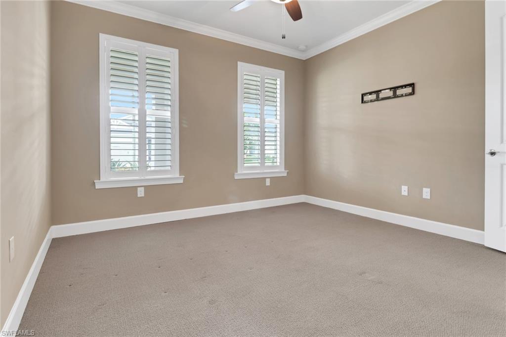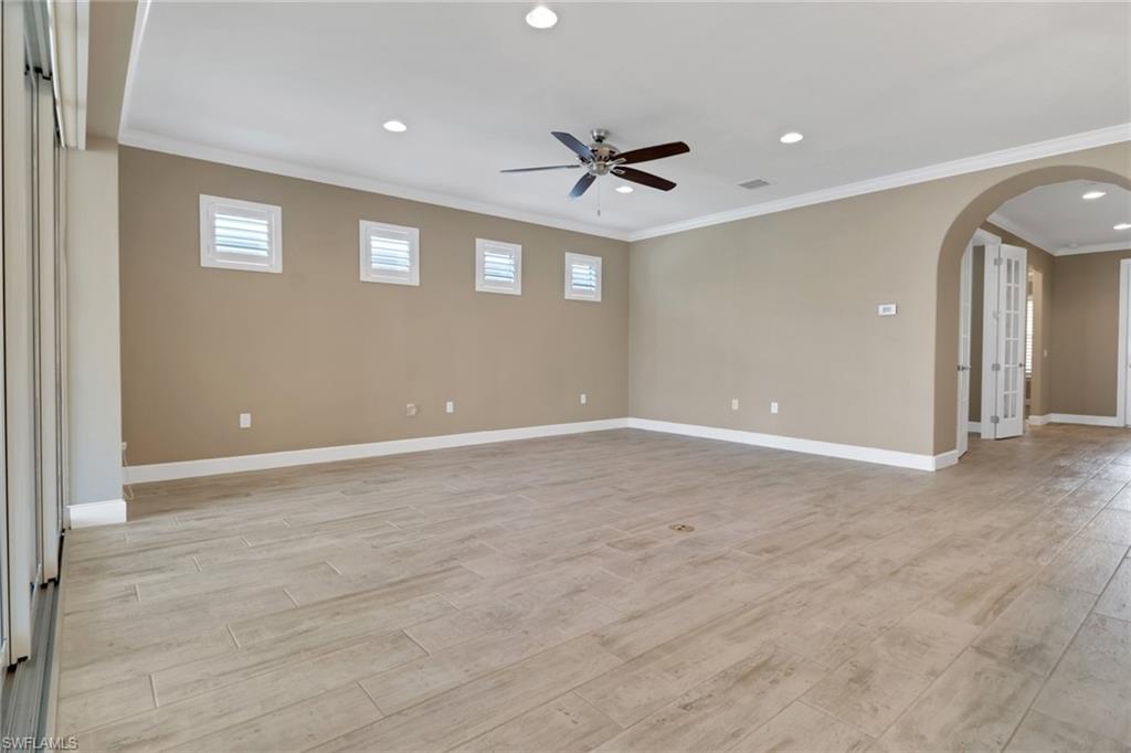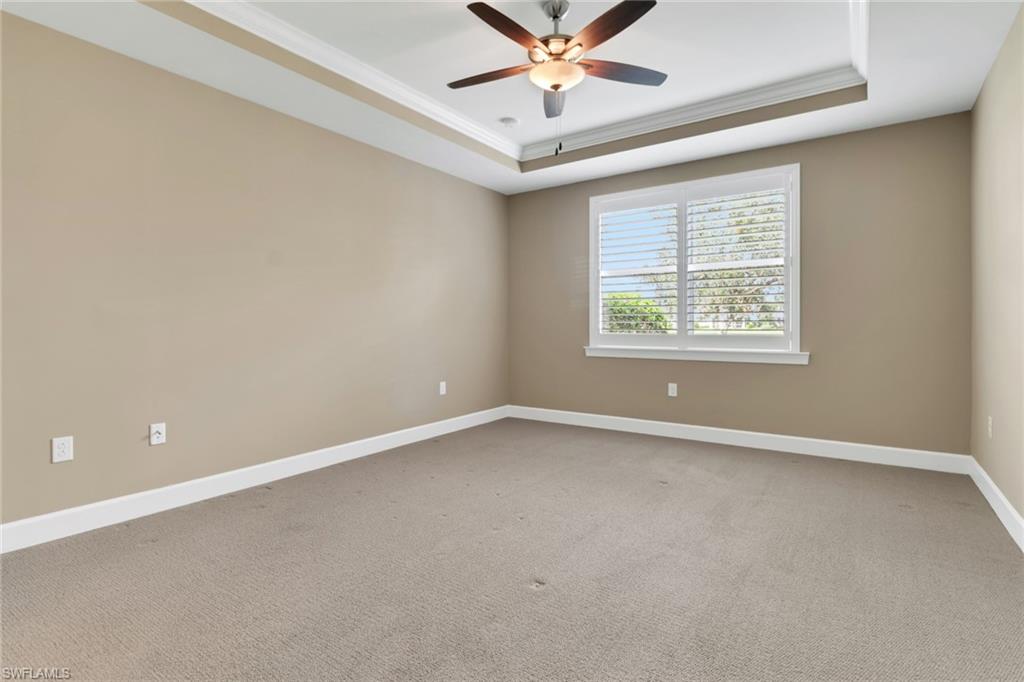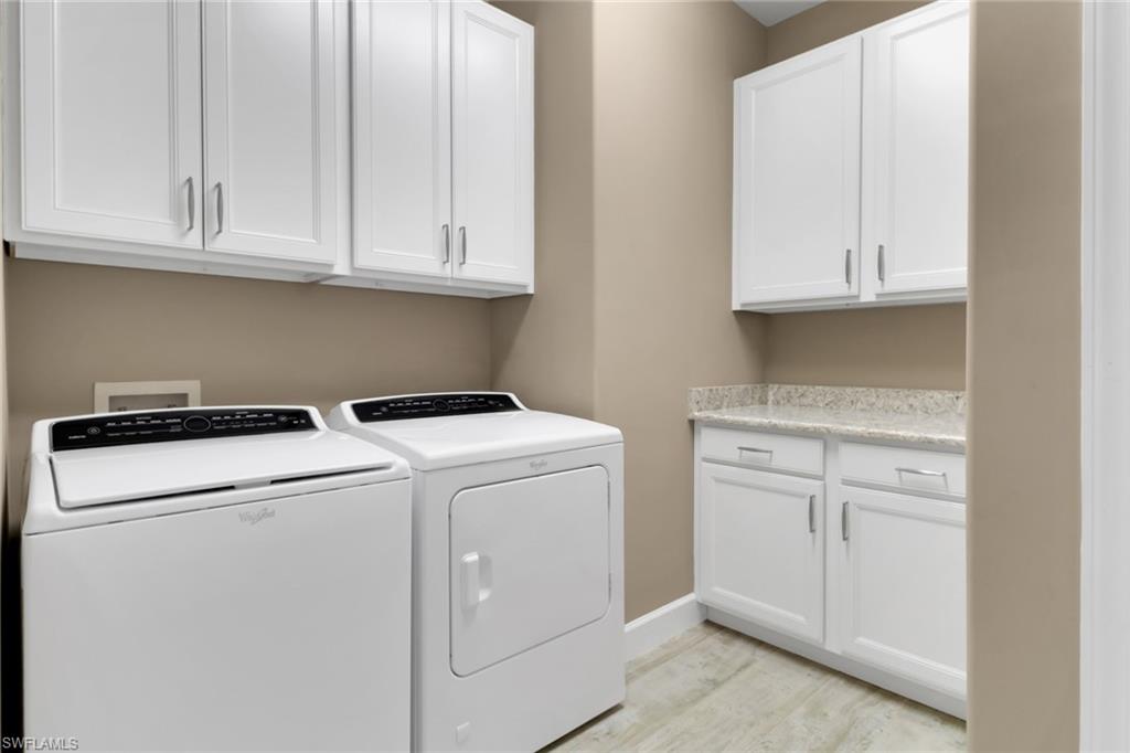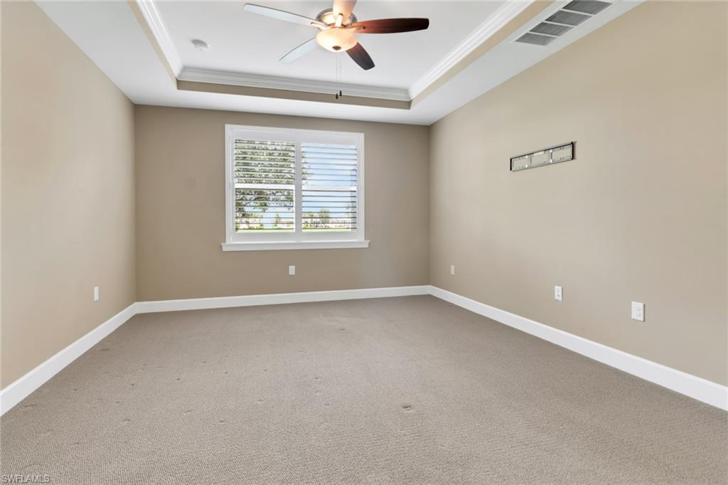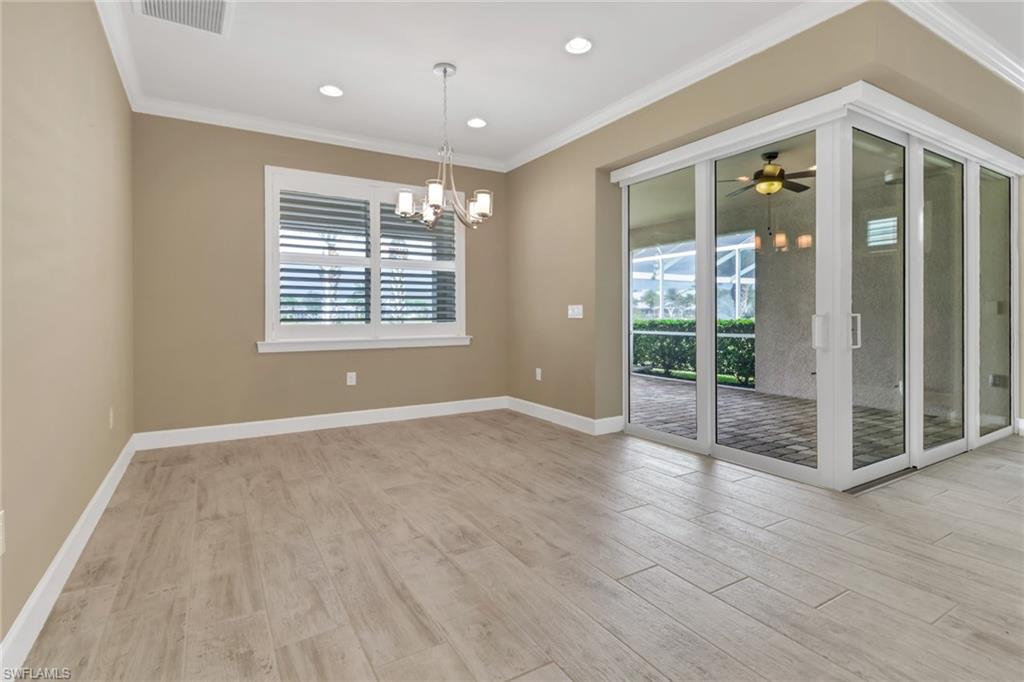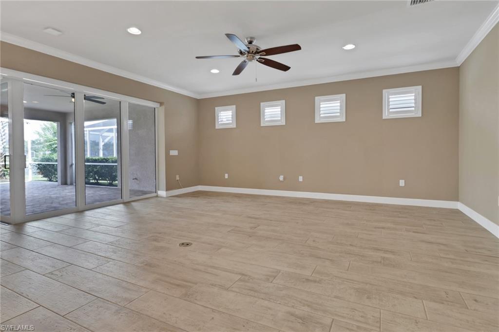 This beautifully upgraded 3-bedroom plus den home offers spectacular lake views and exceptional features throughout. From the welcoming front porch to the expanded lanai, every detail has been thoughtfully designed. The kitchen is the heart of the home, complete with quartz countertops, stainless steel appliances, a natural gas stove, and a large island perfect for entertaining. Structural upgrades include outdoor kitchen plumbing, a 4’ garage extension, 8’ interior doors, zero-corner sliders, impact windows, and an expanded lanai with extended roof cover—ideal for enjoying Florida living at its best. Inside, you’ll find elegant finishes such as upgraded tile in the main living areas, upgraded drywall and paint, plantation shutters, custom glass-insert doors for the den, upgraded slider shades, granite in all bathrooms, and a luxurious master suite with dual sinks, soaking tub, and separate walk-in shower. Additional conveniences include a utility sink in the garage and premium storage solutions. Tidewater, a premier 55+ community, offers resort-style amenities including a sparkling pool and spa, clubhouse, fitness center, and tennis and pickleball courts. The location is unbeatable—within walking distance to Hertz Arena and Miromar Outlets, minutes from Florida Gulf Coast University, dining, and Publix, and only 10 minutes to RSW International Airport. This lakefront gem combines luxury, convenience, and community in one perfect package.