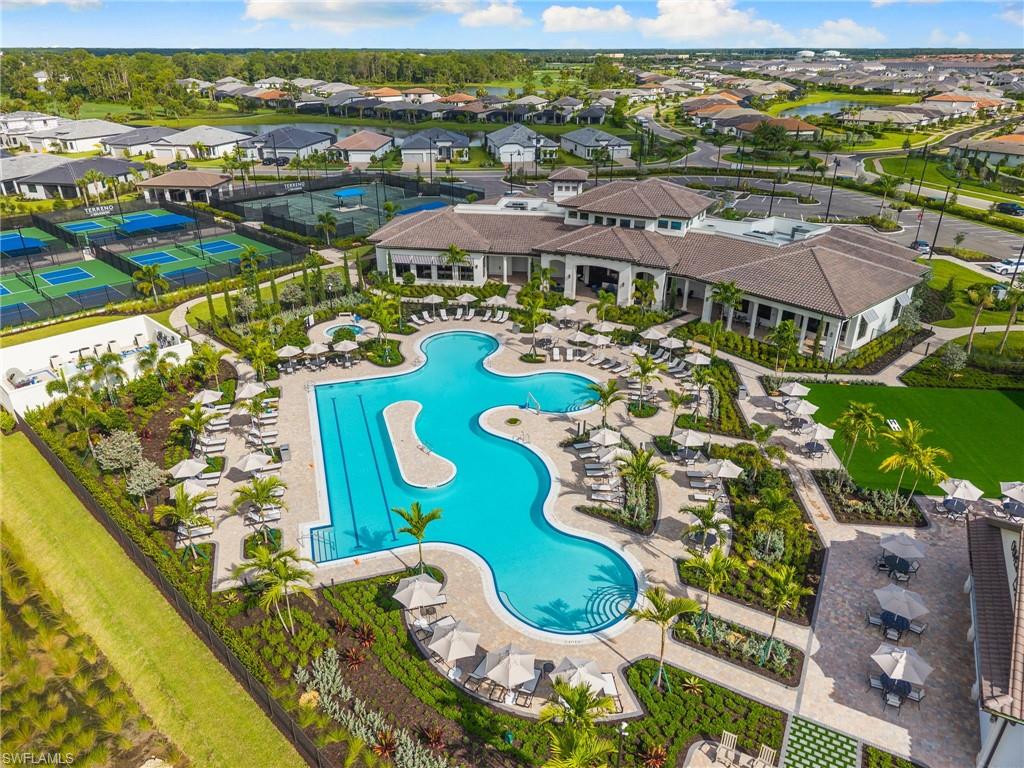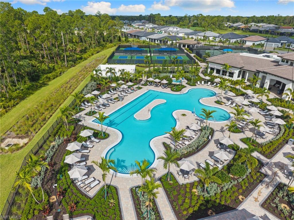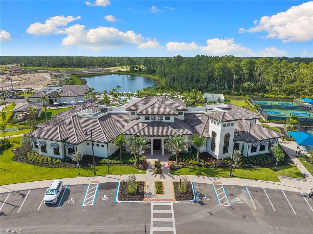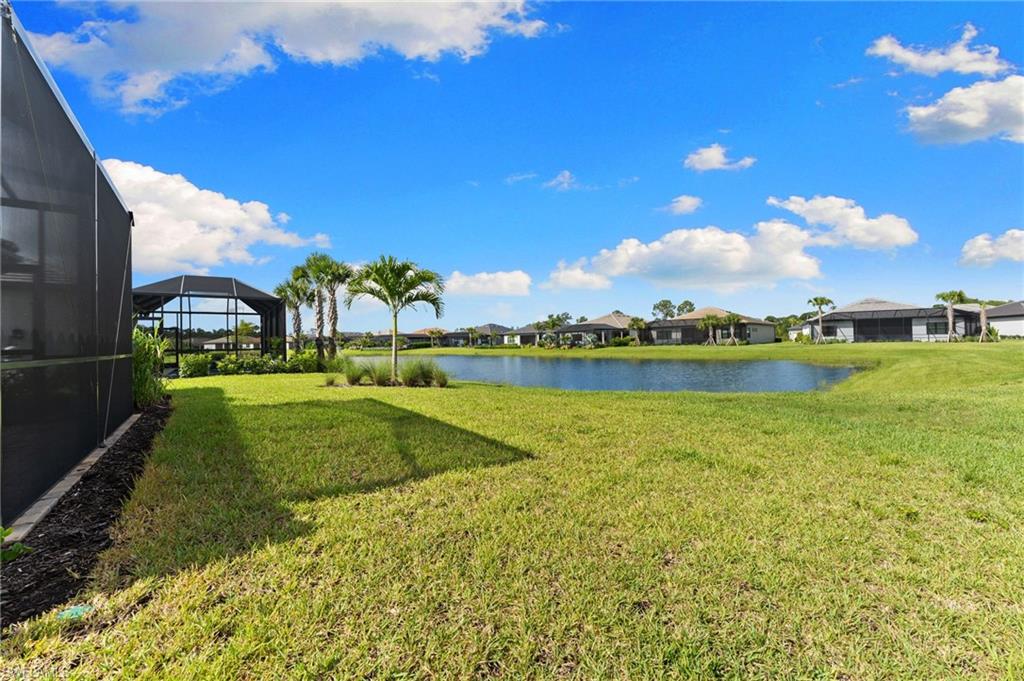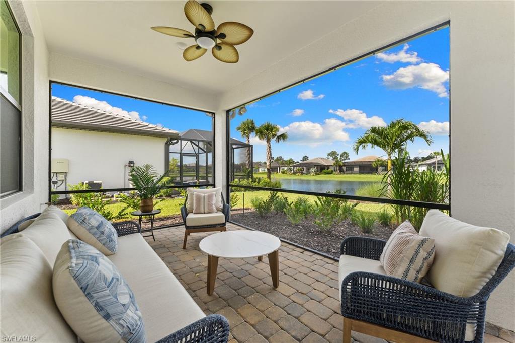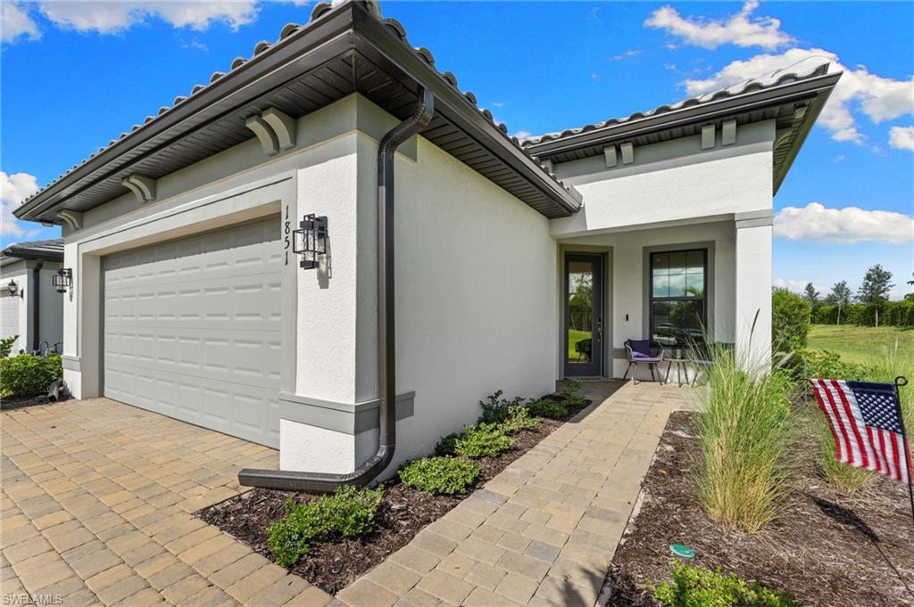 BETTER THAN NEW! Take advantage of new construction with immediate availability and thoughtful upgrades with this one-year-old Contour floorplan. Featuring extensive builder upgrades like impact windows and doors, glass front door, extended lanai, walk-in showers, tray ceiling, laundry storage, garage sink and an impressive lot at the end of the cul-de-sac with oversized side yard, plenty of privacy and a serene lake view. Ideally positioned with western exposure, owners will love the ample natural light, bright and open floorplan, and enjoy evening sunsets on the extended covered, screened lanai. Inside features tasteful finishes including wood look tile, white shaker cabinetry, tile backsplash, neutral quartz countertops and stainless steel appliances. Additional upgrades include high end lighting, epoxy garage floor, electric window shade, wood blinds and custom mirror tint. This property is made for hosting with the extended driveway for parking, generous island and inviting extended patio space. Terreno is an amenity rich NATURAL GAS neighborhood with stunning resort pool, pickleball, tennis, comprehensive fitness center, brand new restaurant, dog park, playground and rich social calendar. Optimum security and peace of mind for full time residents and snowbirds with a manned gated entrance. Golf available at Valencia Country Club, a new Publix and a quick drive to popular shops and restaurants for the best lifestyle Naples has to offer!