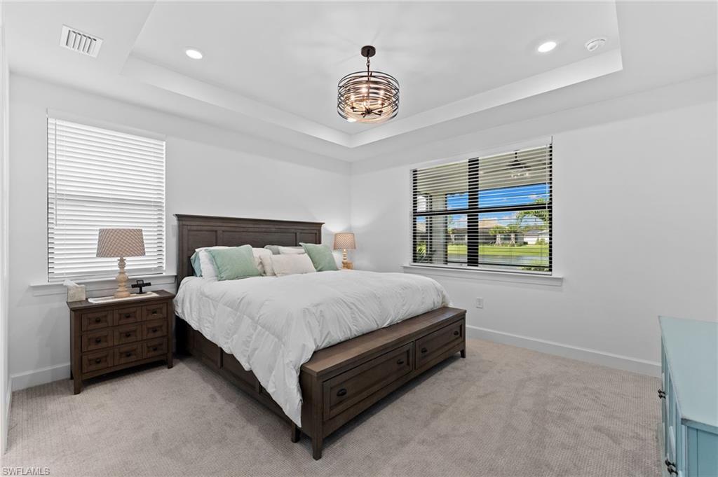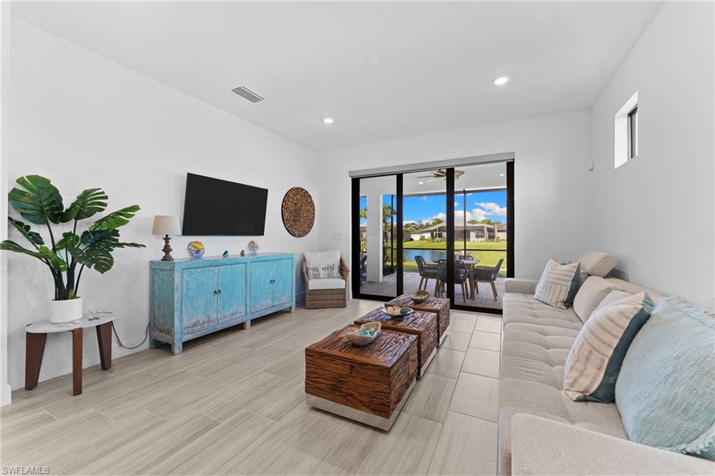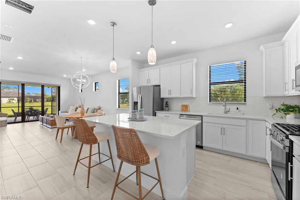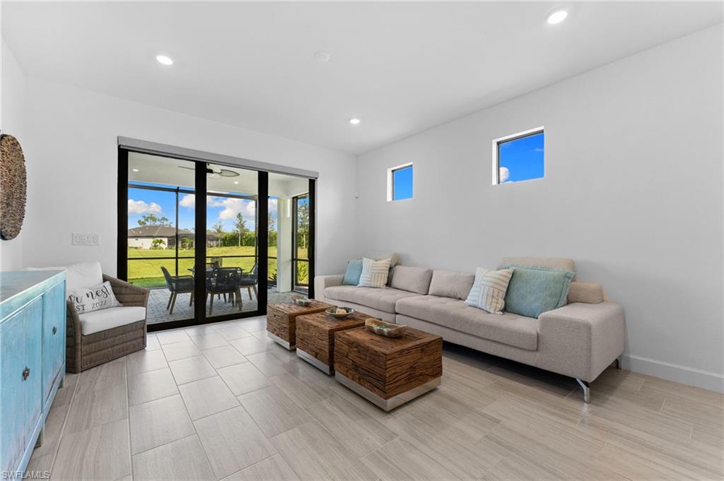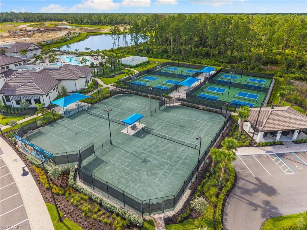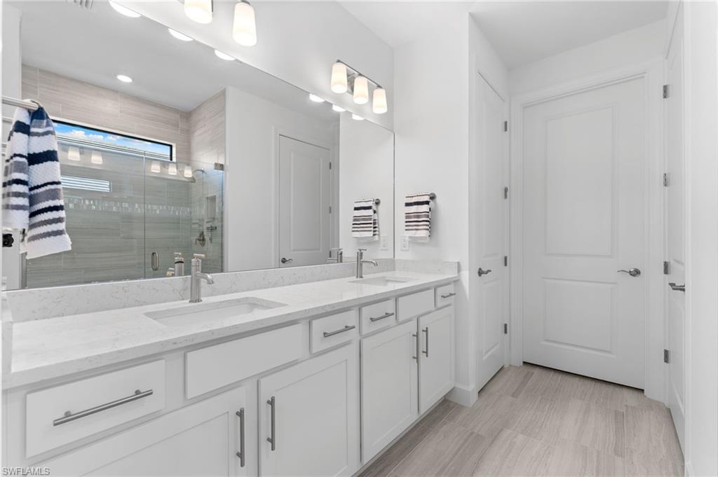 BETTER THAN NEW! Take advantage of new construction with immediate availability and thoughtful upgrades with this one-year-old Contour floorplan. Featuring extensive builder upgrades like impact windows and doors, glass front door, extended lanai, walk-in showers, tray ceiling, laundry storage, garage sink and an impressive lot at the end of the cul-de-sac with oversized side yard, plenty of privacy and a serene lake view. Ideally positioned with western exposure, owners will love the ample natural light, bright and open floorplan, and enjoy evening sunsets on the extended covered, screened lanai. Inside features tasteful finishes including wood look tile, white shaker cabinetry, tile backsplash, neutral quartz countertops and stainless steel appliances. Additional upgrades include high end lighting, epoxy garage floor, electric window shade, wood blinds and custom mirror tint. This property is made for hosting with the extended driveway for parking, generous island and inviting extended patio space. Terreno is an amenity rich NATURAL GAS neighborhood with stunning resort pool, pickleball, tennis, comprehensive fitness center, brand new restaurant, dog park, playground and rich social calendar. Optimum security and peace of mind for full time residents and snowbirds with a manned gated entrance. Golf available at Valencia Country Club, a new Publix and a quick drive to popular shops and restaurants for the best lifestyle Naples has to offer!
