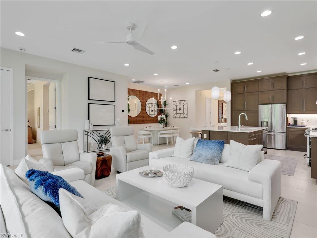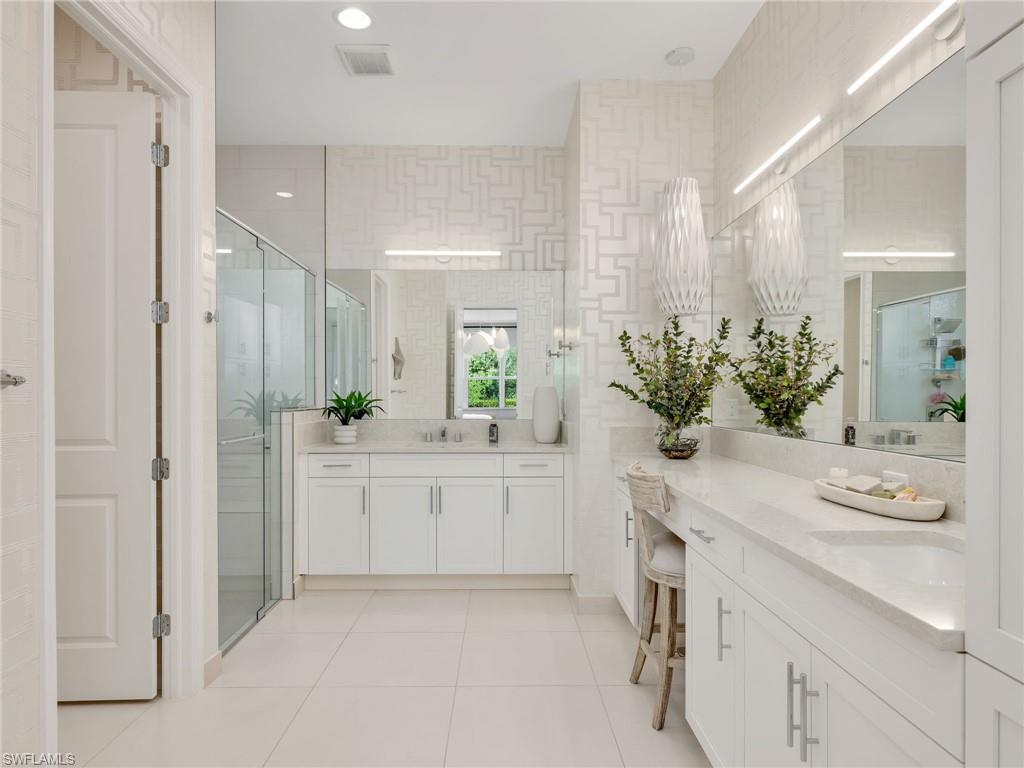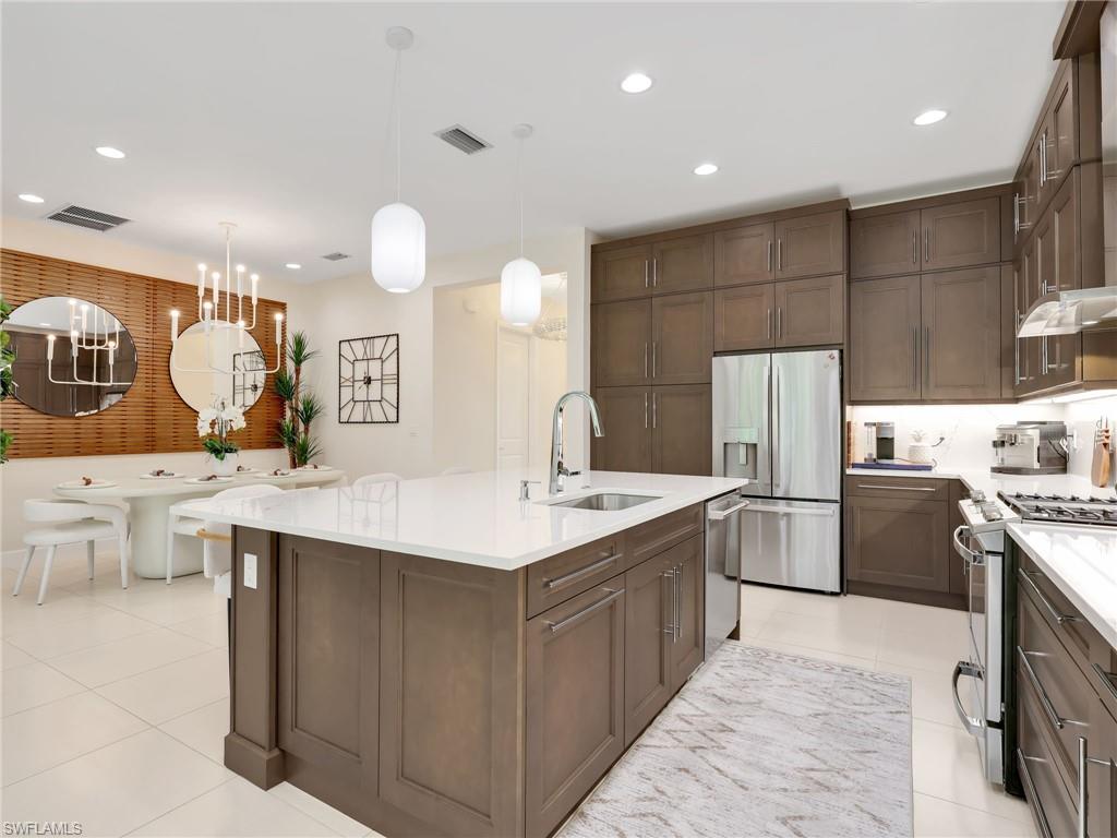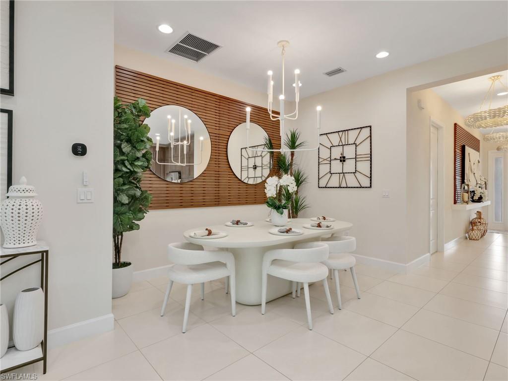 Welcome to this stunning former model home in the highly sought-after 55+ community of Valencia Trails. Designed with luxury, comfort, and functionality in mind, this spacious 2,770 sq. ft. residence offers 3 bedrooms plus a den and loft, and 4 full bathrooms, providing ample space for both everyday living and entertaining. From the moment you arrive, the paver driveway and elegant entry set the tone for the upgrades and details throughout. Step inside and you’ll immediately notice the thoughtful finishes that distinguish this home. The den, accessed through impressive double doors, offers the perfect space for a home office or private retreat. A custom accent wall in the dining room adds a designer touch, while another accent walls enhances the warmth of the primary suite. The gourmet kitchen features a large island, gas oven, and abundant upgraded cabinetry perfect for preparing meals and hosting gatherings. The kitchen flows seamlessly into the open living area and out to the lanai, creating an inviting indoor-outdoor lifestyle. The primary suite is a private sanctuary with tray ceilings, a spacious walk-in closet, and a spa-inspired bathroom offering dual sinks and a walk-in shower. Each additional bedroom is generously sized, and the upstairs loft provides flexibility for guests, hobbies, or relaxation, complete with a beautiful mural wall that adds character and charm. Outdoor living shines here with a beautifully upgraded, screened lanai featuring a panoramic screen enclosure that maximizes views while keeping the space open and airy. Entertain with ease at the outdoor kitchen, or simply unwind in this extended living area, enhanced by matching paver flooring. Additional features include a whole-house water filtration system, Sika floor system in the garage, and countless model-home upgrades throughout. Every corner of this residence has been carefully designed for style and convenience. Living in Valencia Trails means access to resort-style amenities, including a clubhouse, fitness center, pools, social events, pickleball, tennis, and even a dog park. This home offers not just luxury living, but also a vibrant and active lifestyle in one of Naples’ premier communities.