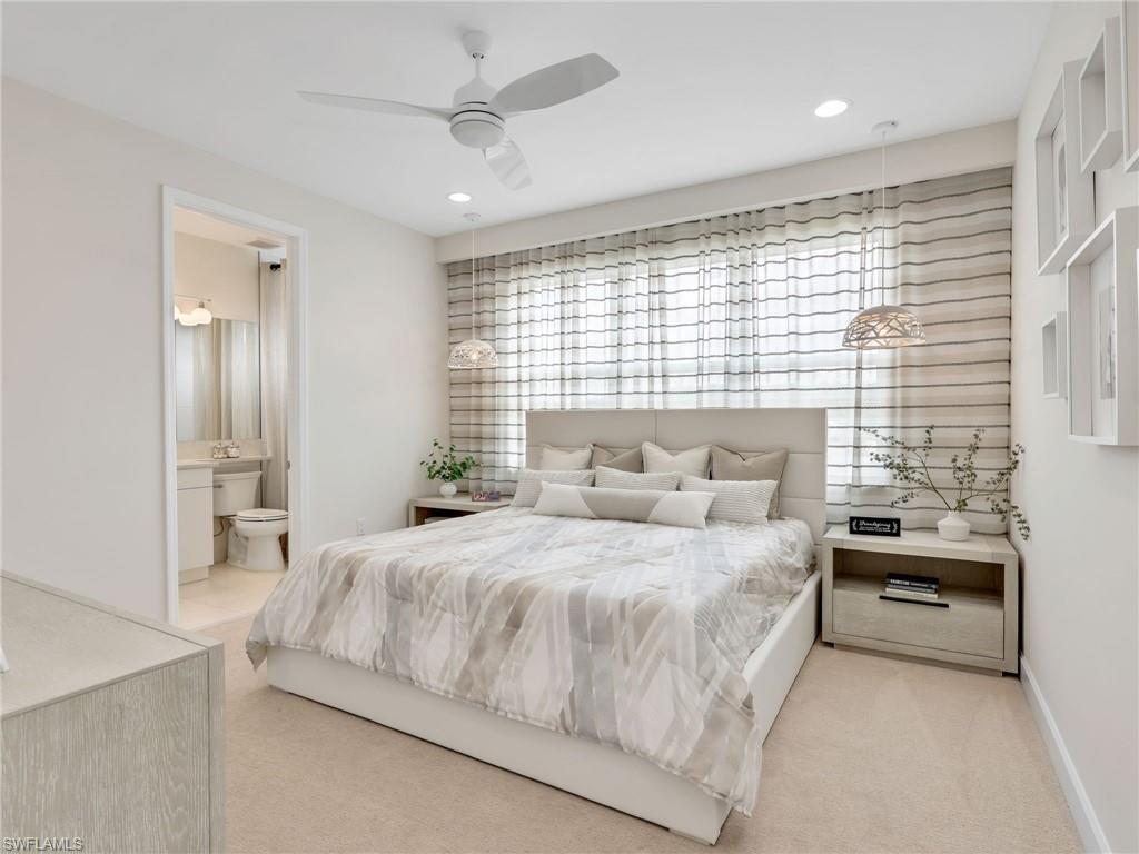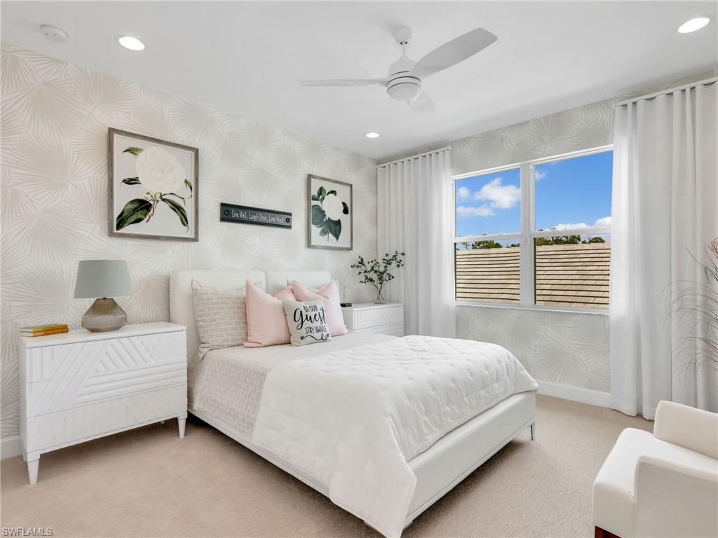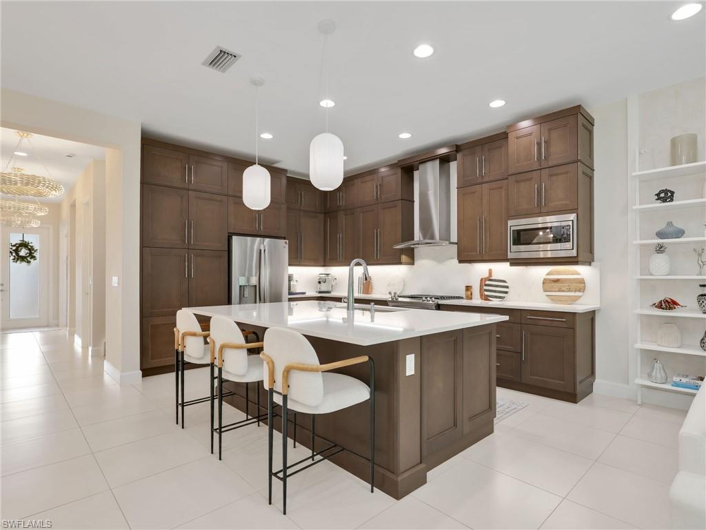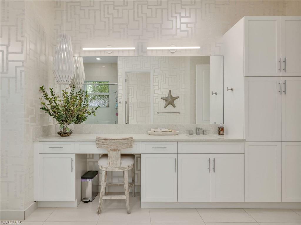 Welcome to this stunning former model home in the highly sought-after 55+ community of Valencia Trails. Designed with luxury, comfort, and functionality in mind, this spacious 2,770 sq. ft. residence offers 3 bedrooms plus a den and loft, and 4 full bathrooms, providing ample space for both everyday living and entertaining. From the moment you arrive, the paver driveway and elegant entry set the tone for the upgrades and details throughout. Step inside and you’ll immediately notice the thoughtful finishes that distinguish this home. The den, accessed through impressive double doors, offers the perfect space for a home office or private retreat. A custom accent wall in the dining room adds a designer touch, while another accent walls enhances the warmth of the primary suite. The gourmet kitchen features a large island, gas oven, and abundant upgraded cabinetry perfect for preparing meals and hosting gatherings. The kitchen flows seamlessly into the open living area and out to the lanai, creating an inviting indoor-outdoor lifestyle. The primary suite is a private sanctuary with tray ceilings, a spacious walk-in closet, and a spa-inspired bathroom offering dual sinks and a walk-in shower. Each additional bedroom is generously sized, and the upstairs loft provides flexibility for guests, hobbies, or relaxation, complete with a beautiful mural wall that adds character and charm. Outdoor living shines here with a beautifully upgraded, screened lanai featuring a panoramic screen enclosure that maximizes views while keeping the space open and airy. Entertain with ease at the outdoor kitchen, or simply unwind in this extended living area, enhanced by matching paver flooring. Additional features include a whole-house water filtration system, Sika floor system in the garage, and countless model-home upgrades throughout. Every corner of this residence has been carefully designed for style and convenience. Living in Valencia Trails means access to resort-style amenities, including a clubhouse, fitness center, pools, social events, pickleball, tennis, and even a dog park. This home offers not just luxury living, but also a vibrant and active lifestyle in one of Naples’ premier communities.