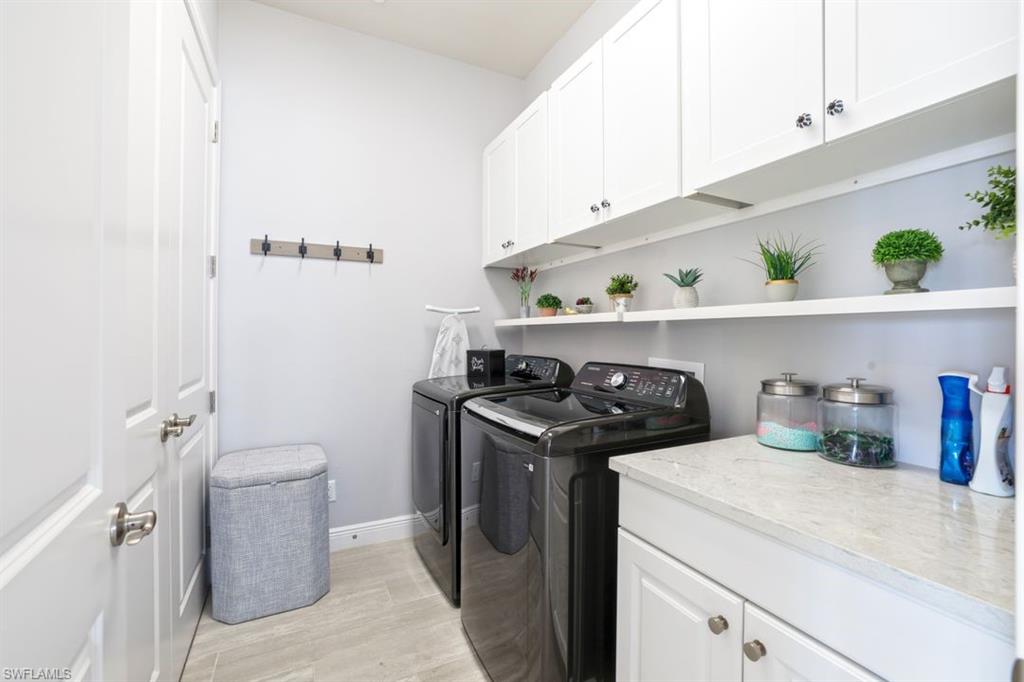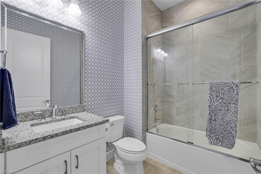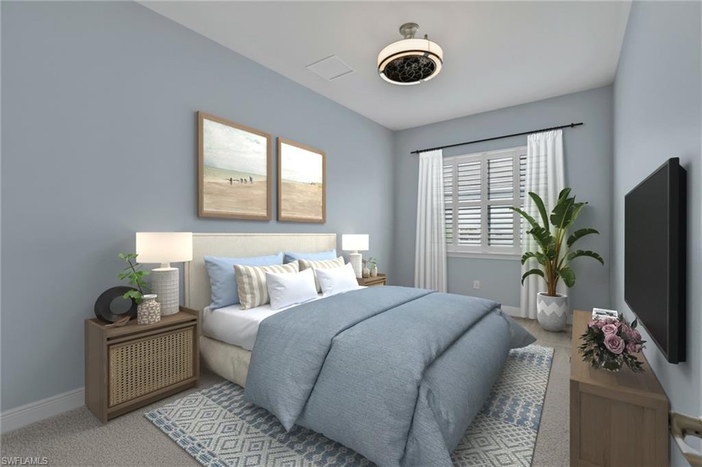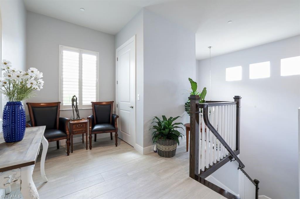 Unique and elegant four bedroom, three bath, fully furnished 2,611 2nd floor Coach Home with Lake and Fountain Views! This stunning home built in 2018 by Toll Brothers, offers a blend of true luxury and comfort. With a design that emphasizes both functionality and sophistication, this home conveys with select contemporary furnishings and is ideal for those seeking modern elegance and convenience. As you enter, you’ll be greeted by the meticulous attention to detail and unique customizations exclusive to this property and not offered in others in the community. The open floor plan gives the residence a single-family home feel enhanced by beautiful wood-look ceramic tile flooring that creates a seamless flow between the living spaces. The tray ceilings, plantation shutters, crown molding, and custom cabinetry add a touch of refinement, while the recessed lighting, decorator light fixtures and ceiling fans offer both style and comfort. The chef’s kitchen is a true highlight, equipped with a natural gas cooktop, dual wall ovens and a sleek, modern design featuring shaker cabinets, stainless steel appliances and sink, a massive breakfast bar, a gorgeous tile backsplash, quartz countertops and built-in wine cooler. Enjoy meals and entertain guests in the dining area that connects to the screened lanai, where you can take in serene lake and fountain views. The principal suite is a private sanctuary with elegant details and a luxurious en-suite bathroom. Two additional bedrooms provide ample space for family and guests, and the den offers a perfect spot for a home office or cozy retreat. This home also boasts practical features such as high impact-resistant windows, a natural gas hot water heater, extra interior storage areas, custom closets and an elevator-ready design. The 2-car garage provides convenient parking and additional storage, completing this exquisite residence. The home is located within walking distance to an amenity rich clubhouse featuring a fabulous heated community pool and spa, a well-equipped fitness room, gathering room, billiards, tennis and pickleball. Azure at Hacienda Lakes is a low density gated community of 419 front doors conveniently located near shopping, dining, I-75 and a short ride to our world-class Naples and Marco Island beaches. Schedule a tour today and make this exceptional property your new Naples home.