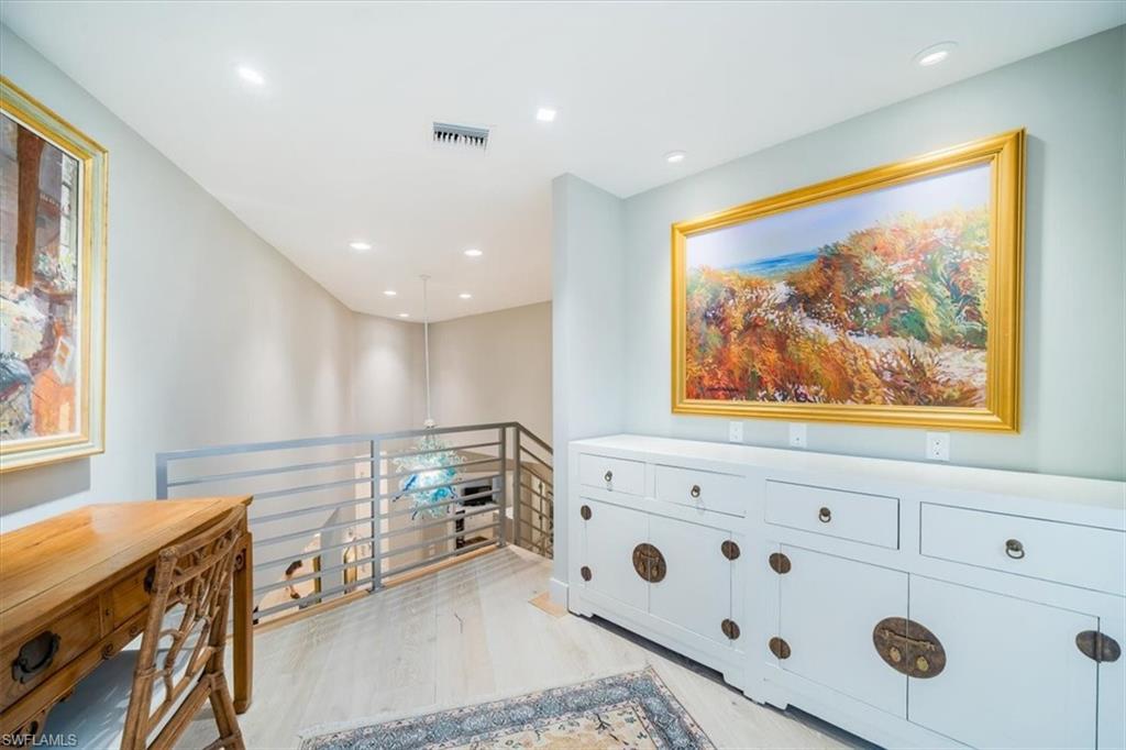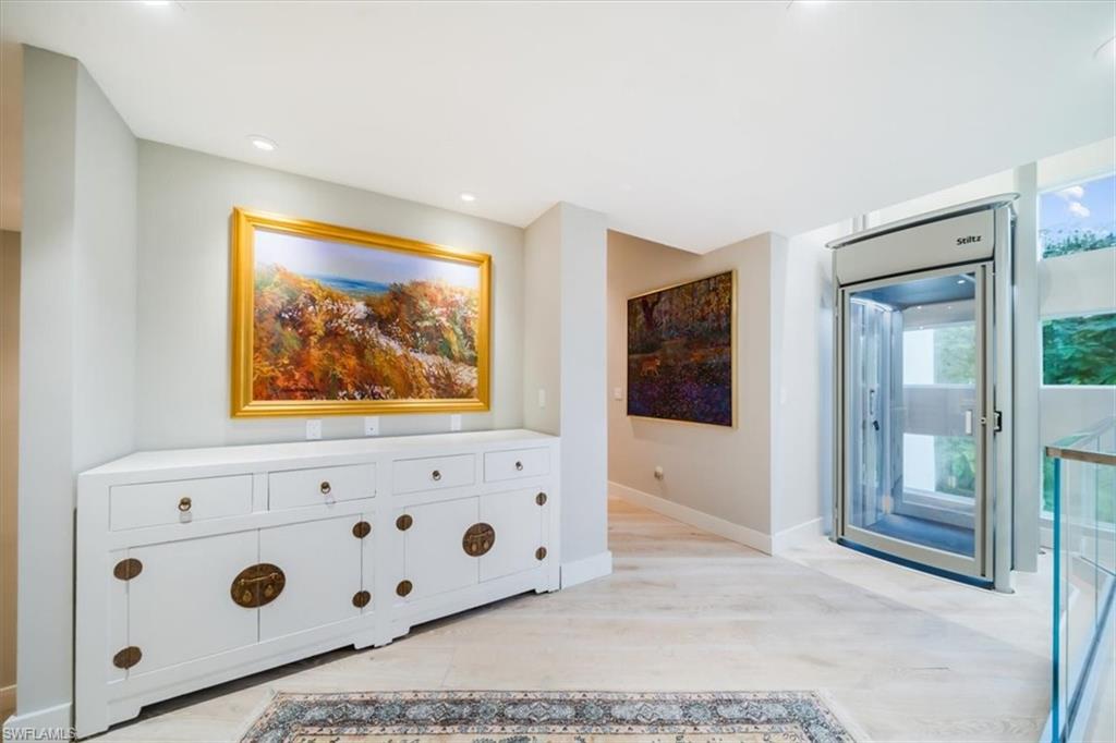 Situated in one of Olde Naples’ most sought-after locations, this high-elevation home offers unparalleled peace of mind with NO water damage and lower flood insurance costs thanks to its placement in the X500 flood zone. The property sits on a 14,000+ square foot corner lot with lush landscaping, offering privacy and a perfect blend of luxury, convenience, and coastal elegance. Recently remodeled between 2021- 2023, the home showcases top-tier finishes on par with brand-new construction built in 2022. The front elevation was expanded to include a new metal raised single-seam roof, an open 2-story foyer, glass double doors, and an elevator area. Inside, you will find European French white oak engineered hardwood flooring, soaring ceilings from 12 to 18 feet high, and IMPACT windows throughout. The chef’s kitchen is equipped with white shaker cabinetry, an oversized island with black accent cabinetry towards the dining room and luxurious quartz countertops with a waterfall edge, complemented by DACOR 6 burner 2 oven gas cooktop, VIKING microwave/convection oven, and a SUBZERO side-by-side refrigerator. The spacious home includes a music room, large den, open loft space, and an expanded laundry/butler’s pantry. The owner’s suite occupies its own private wing with a large walk-in closet, extra built-in doored storage & closet system, a bedroom with walls of windows and sliders leading to the private pool and spa. The spa-like bathroom featuring a walk-through shower with multiple shower heads, dual vanities, and a private water closet. Upstairs, the home offers three large guest suites, each with ample closet space, natural light, and balcony access from two of the suites. The exterior features the most thoughtfully mature plantings, trees and flower beds, Bahama shutter accents, LED landscape lighting, and a handcrafted shell-stone driveway and walkway. The covered lanai has new electric rolling “sun and storm” screens, and the pool and spa area are enclosed for added protection. All of this sits just three blocks from the beach, the new Four Seasons, NCH, and all the amenities of Olde Naples. Positioned on a quiet street with no thru traffic, this home is the ideal mix of modern design, top-of-the-line finishes, and the privacy and convenience you have been looking for. WITH NO hurricane damage at all, this home is ready for its next lucky owner.
