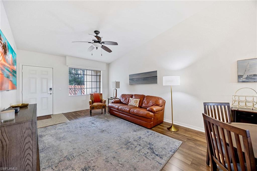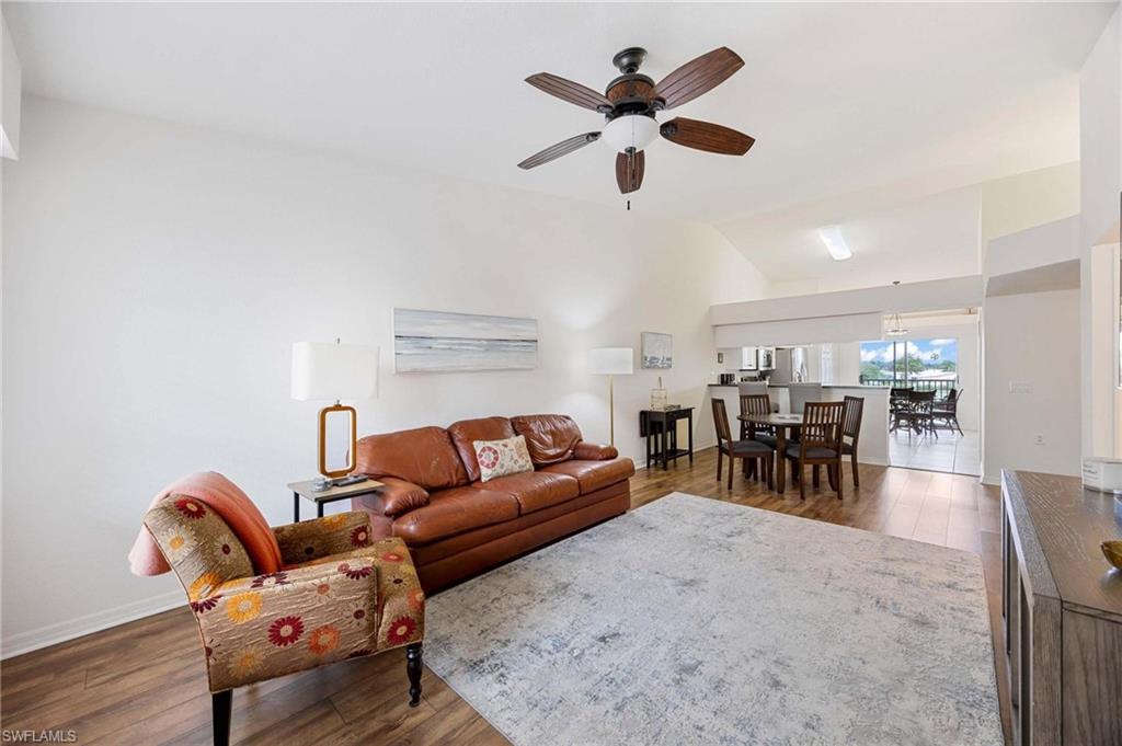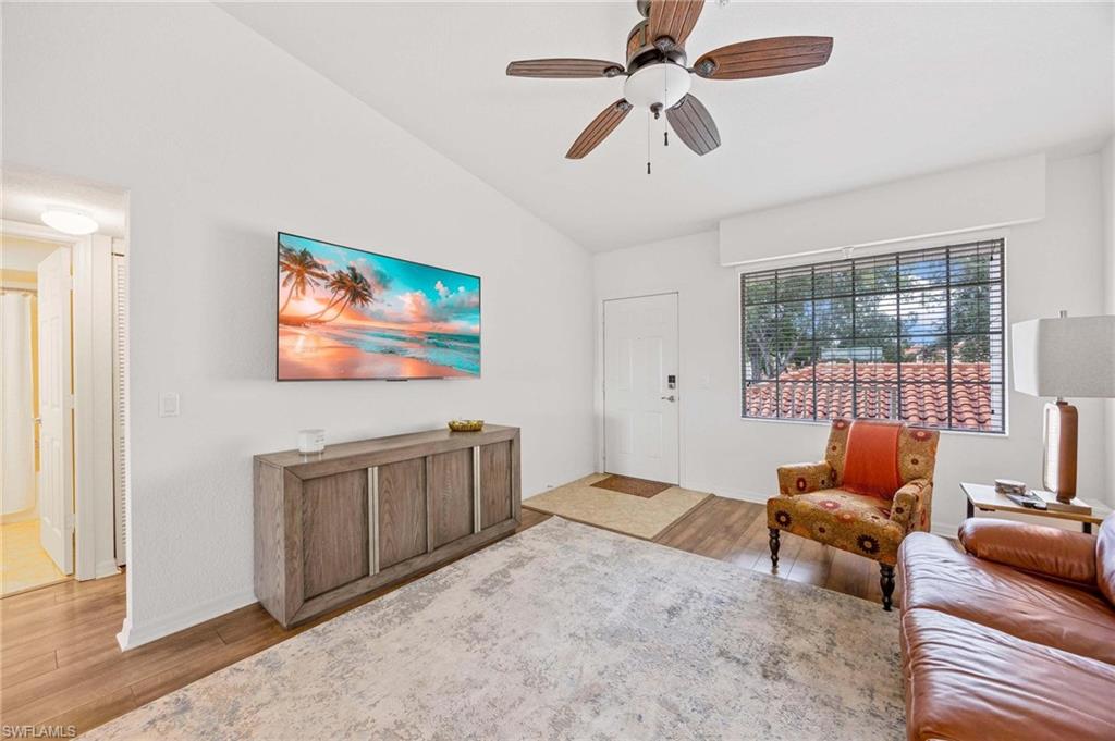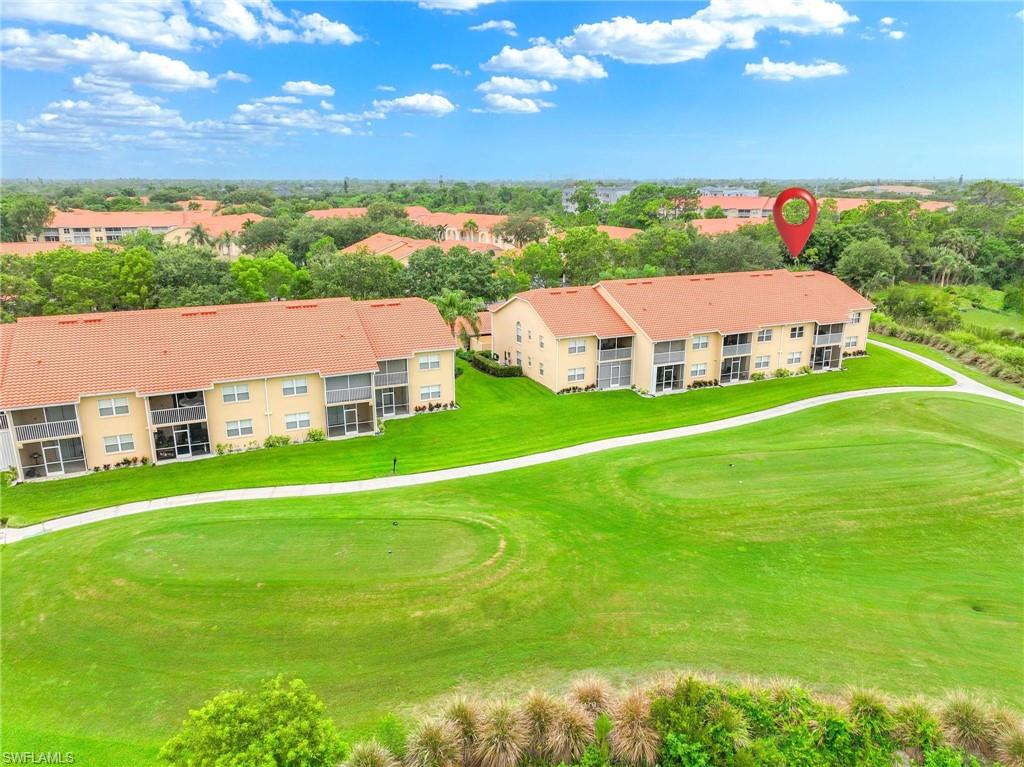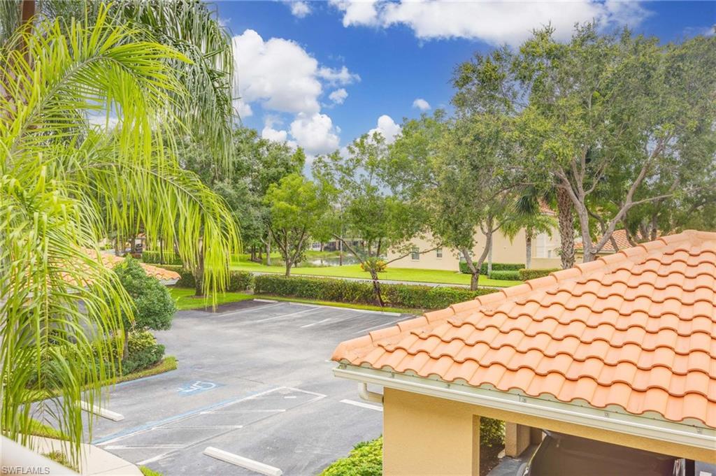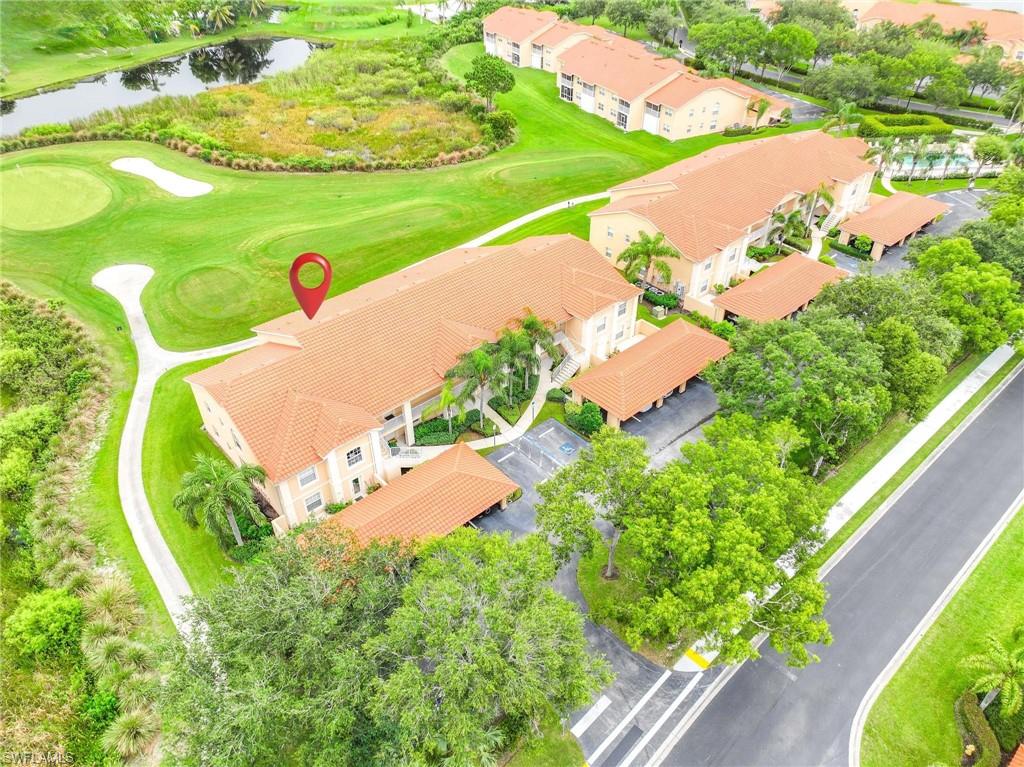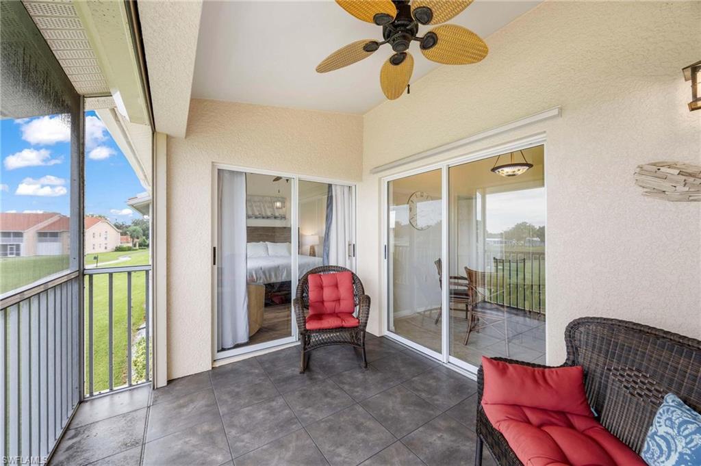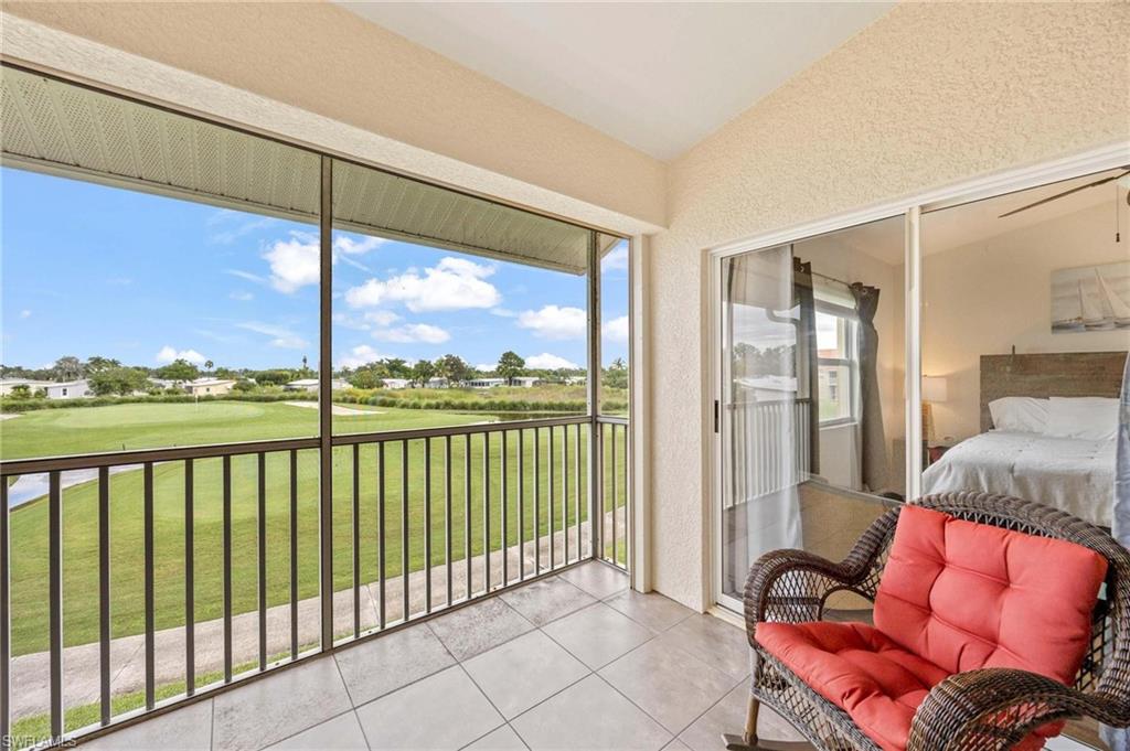 Welcome to this beautiful and well maintained 2 bedroom-2 bath condo with a den, ideally situated on the 12th hole of Bonita Fairways golf course. With vaulted ceilings and an open floor plan this 2nd floor top unit feels bright airy and spacious, perfect for snowbirds looking for a seasonal retreat or those seeking a turn key condo in a prime location. The open concept living and dining areas flow seamlessly into the kitchen which features stainless steel appliances and a functional layout ideal for entertaining or everyday comfort. Large windows and sliding glass doors bring in natural light and offer peaceful golf views from the private balcony, complete with Hurricane shutters for additional security and convenience. The primary suite is generously sized and includes a large walk in closet and private en-suite bath. The second bedroom is equally comfort and located near the guest bathroom. A separate Den offers a flexible space that can serve as a home office or guest room. This condo has been thoughtfully updated as well as an AC system and Hot water heater installed in 2023. An in- unit laundry adds to the overall convenience. The carport location is at the bottom of the stairs of the unit so you do not have to walk far. Located in a well-maintained amenity rich community, residents enjoy a clubhouse, pools, fitness center, pickleball, bocce ball and tennis courts. Also, this location is minutes from shopping, dining and beaches. No flood insurance needed as well.