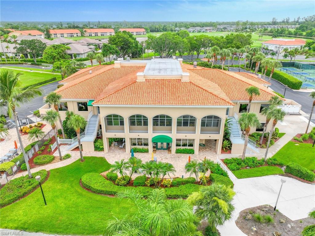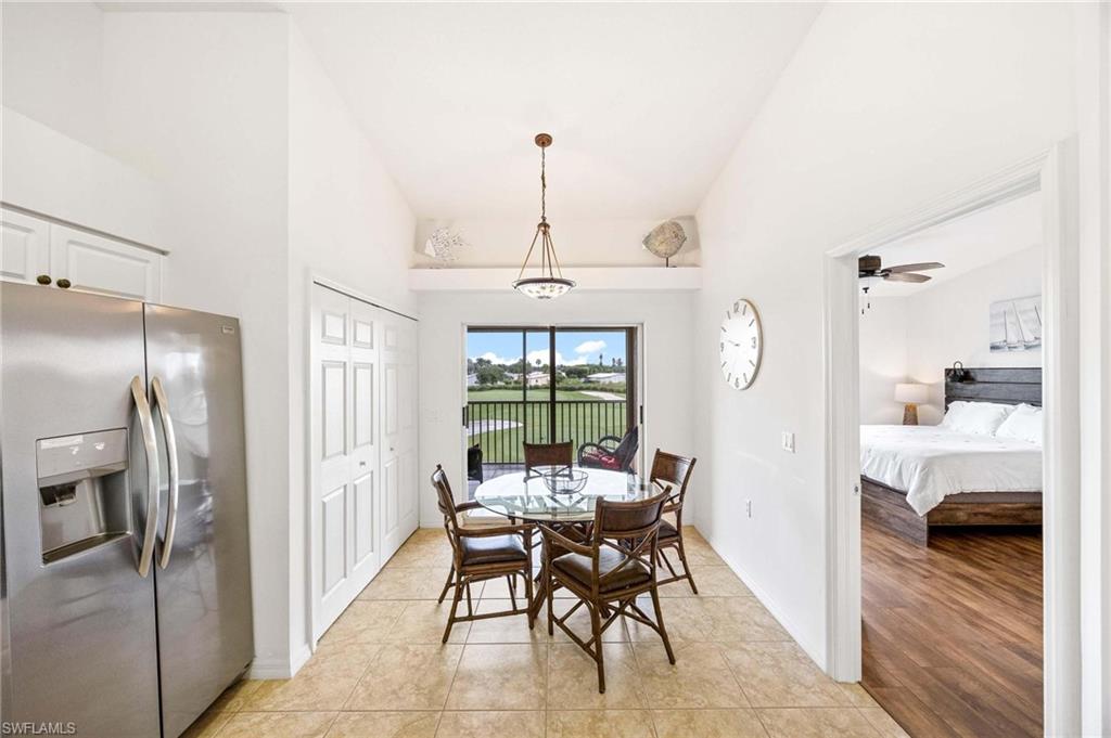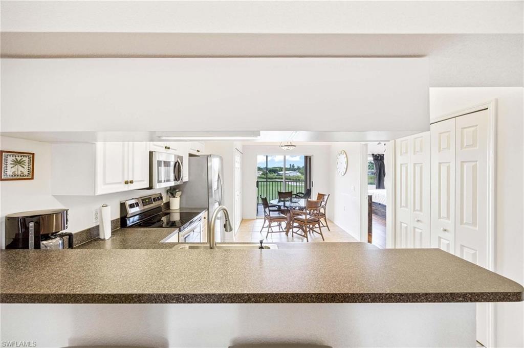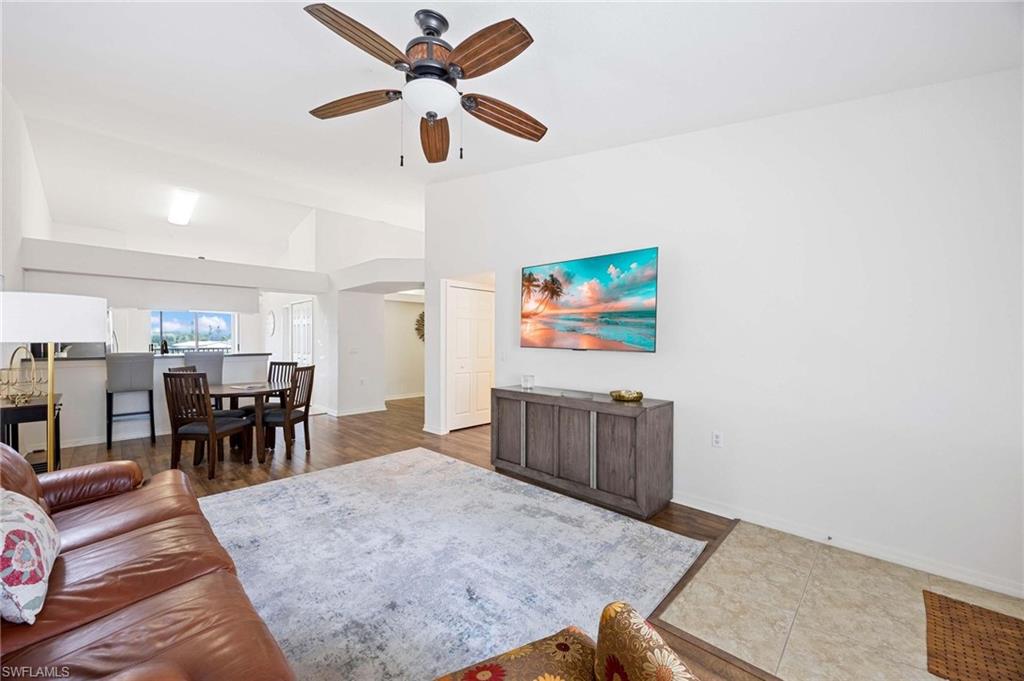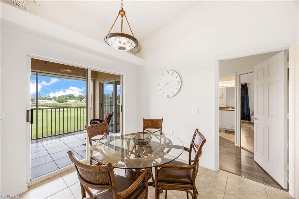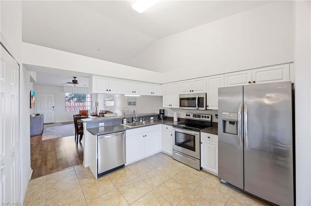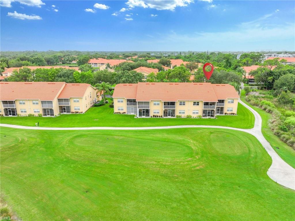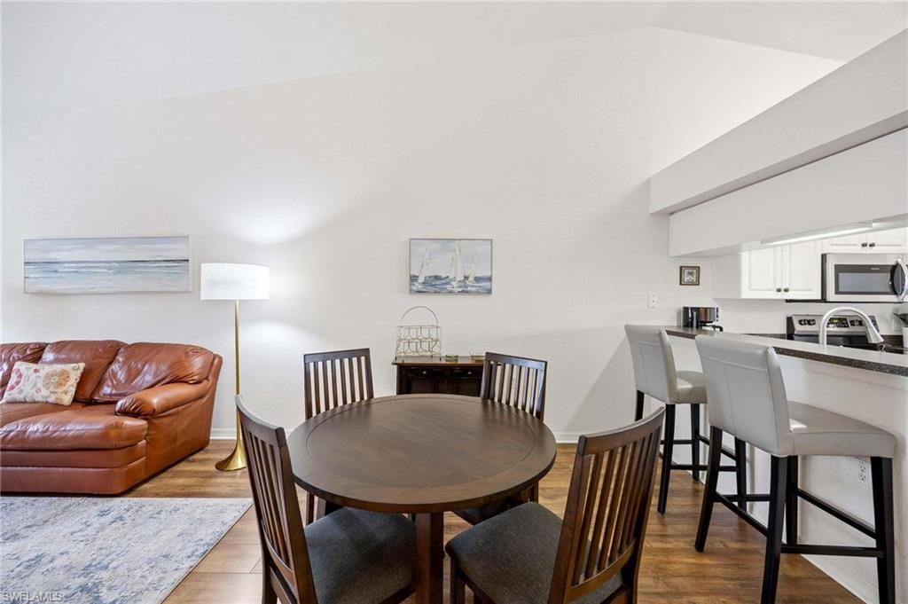 Welcome to this beautiful and well maintained 2 bedroom-2 bath condo with a den, ideally situated on the 12th hole of Bonita Fairways golf course. With vaulted ceilings and an open floor plan this 2nd floor top unit feels bright airy and spacious, perfect for snowbirds looking for a seasonal retreat or those seeking a turn key condo in a prime location. The open concept living and dining areas flow seamlessly into the kitchen which features stainless steel appliances and a functional layout ideal for entertaining or everyday comfort. Large windows and sliding glass doors bring in natural light and offer peaceful golf views from the private balcony, complete with Hurricane shutters for additional security and convenience. The primary suite is generously sized and includes a large walk in closet and private en-suite bath. The second bedroom is equally comfort and located near the guest bathroom. A separate Den offers a flexible space that can serve as a home office or guest room. This condo has been thoughtfully updated as well as an AC system and Hot water heater installed in 2023. An in- unit laundry adds to the overall convenience. The carport location is at the bottom of the stairs of the unit so you do not have to walk far. Located in a well-maintained amenity rich community, residents enjoy a clubhouse, pools, fitness center, pickleball, bocce ball and tennis courts. Also, this location is minutes from shopping, dining and beaches. No flood insurance needed as well.
