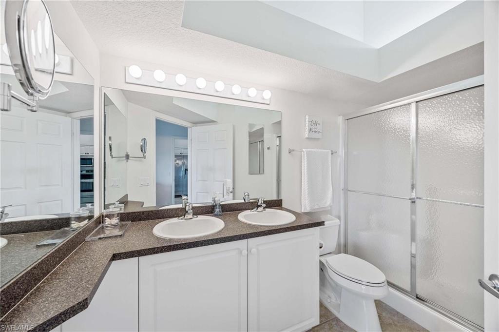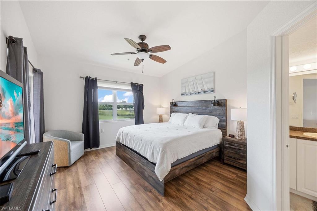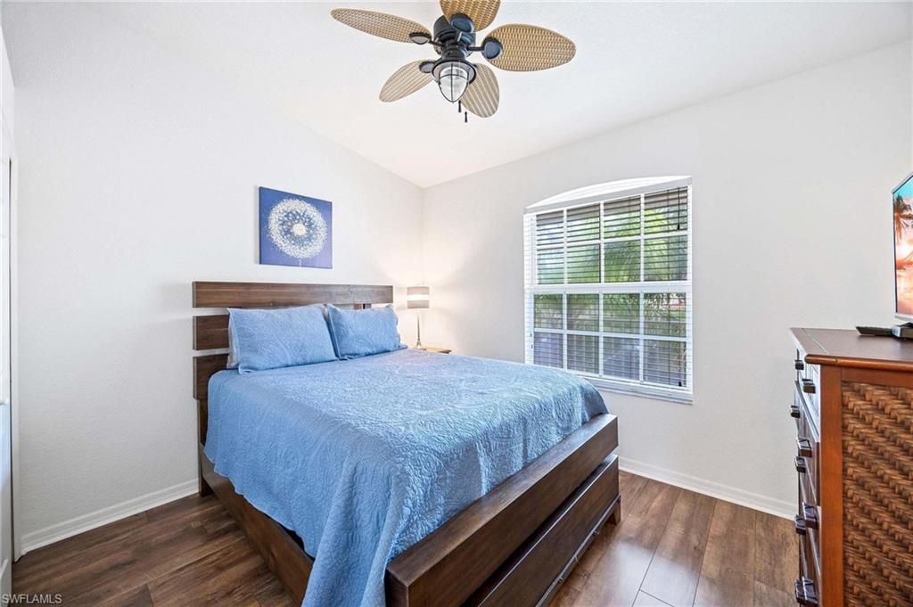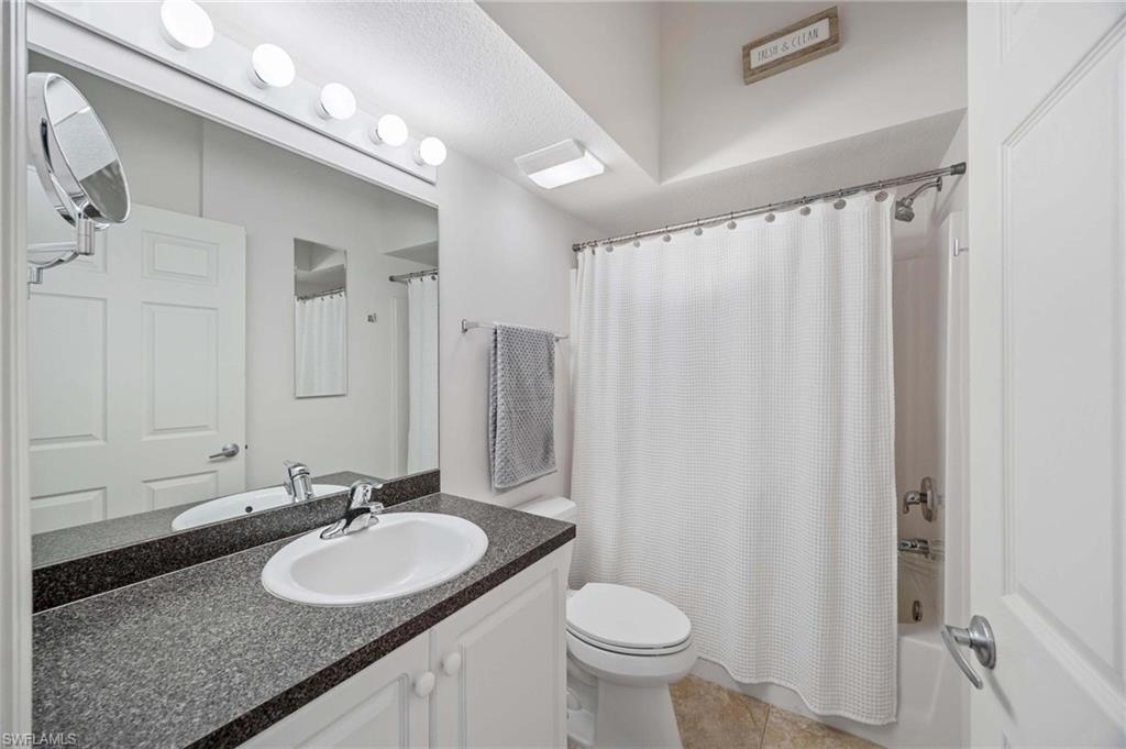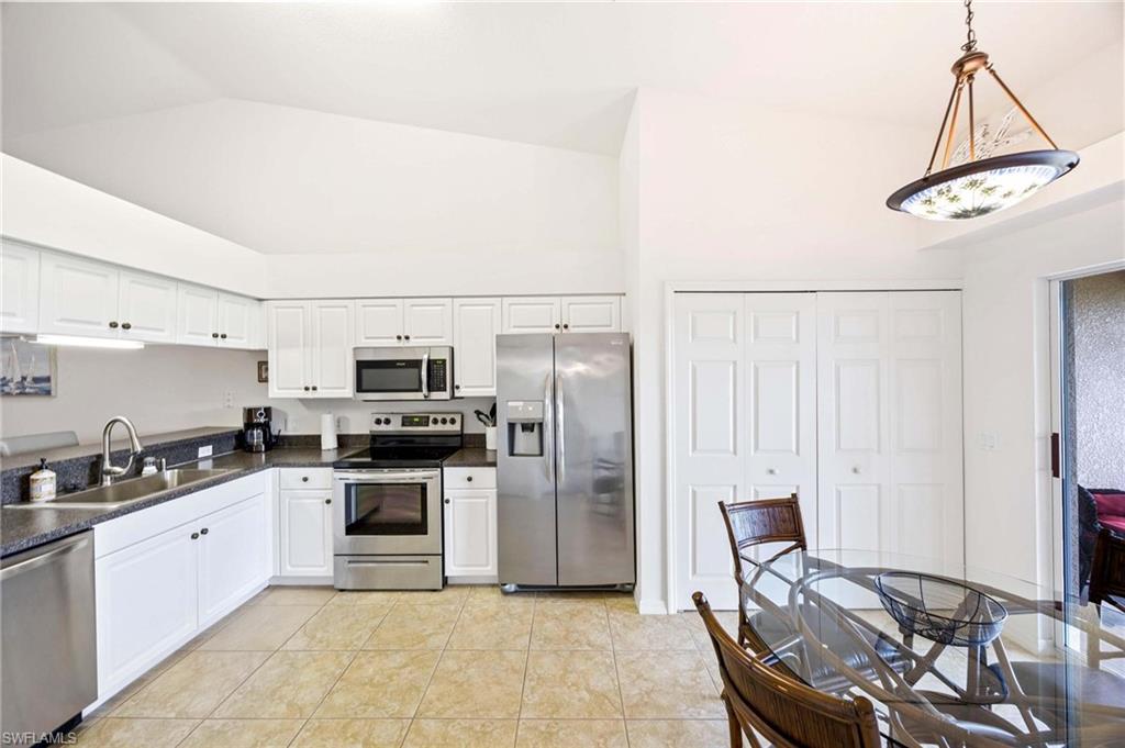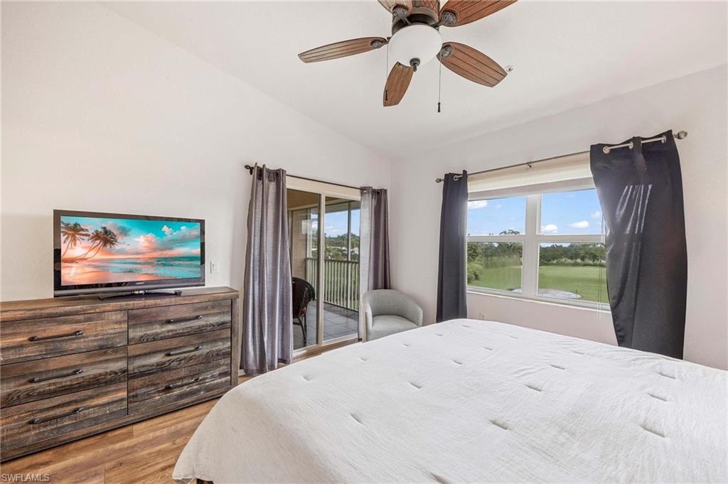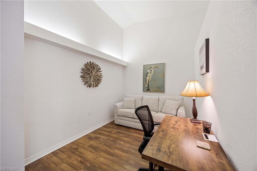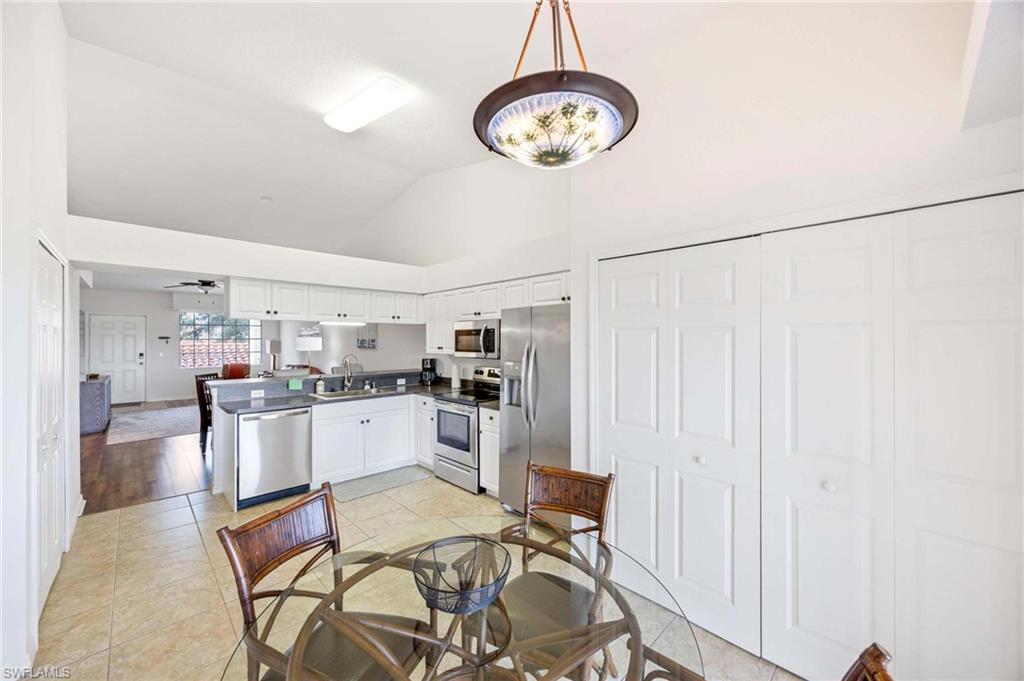 Welcome to this beautiful and well maintained 2 bedroom-2 bath condo with a den, ideally situated on the 12th hole of Bonita Fairways golf course. With vaulted ceilings and an open floor plan this 2nd floor top unit feels bright airy and spacious, perfect for snowbirds looking for a seasonal retreat or those seeking a turn key condo in a prime location. The open concept living and dining areas flow seamlessly into the kitchen which features stainless steel appliances and a functional layout ideal for entertaining or everyday comfort. Large windows and sliding glass doors bring in natural light and offer peaceful golf views from the private balcony, complete with Hurricane shutters for additional security and convenience. The primary suite is generously sized and includes a large walk in closet and private en-suite bath. The second bedroom is equally comfort and located near the guest bathroom. A separate Den offers a flexible space that can serve as a home office or guest room. This condo has been thoughtfully updated as well as an AC system and Hot water heater installed in 2023. An in- unit laundry adds to the overall convenience. The carport location is at the bottom of the stairs of the unit so you do not have to walk far. Located in a well-maintained amenity rich community, residents enjoy a clubhouse, pools, fitness center, pickleball, bocce ball and tennis courts. Also, this location is minutes from shopping, dining and beaches. No flood insurance needed as well.