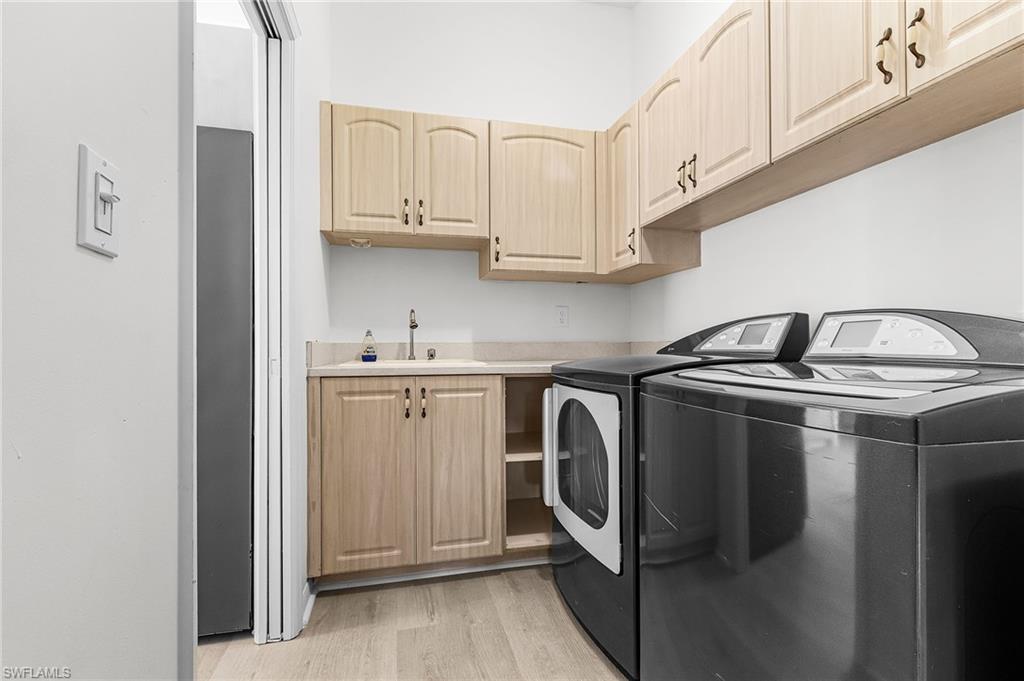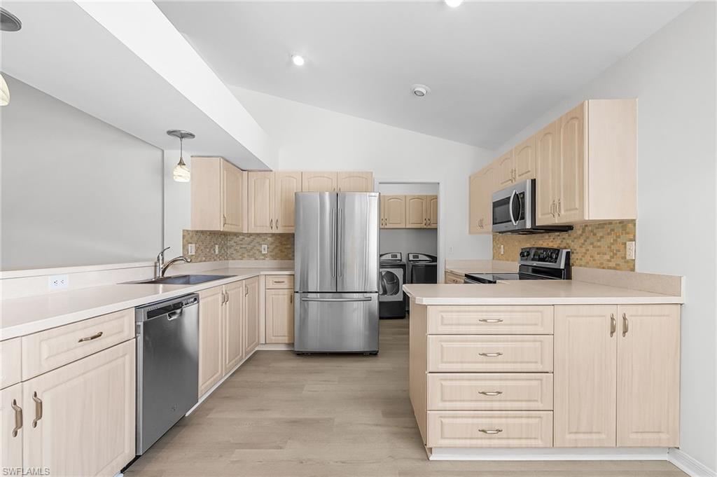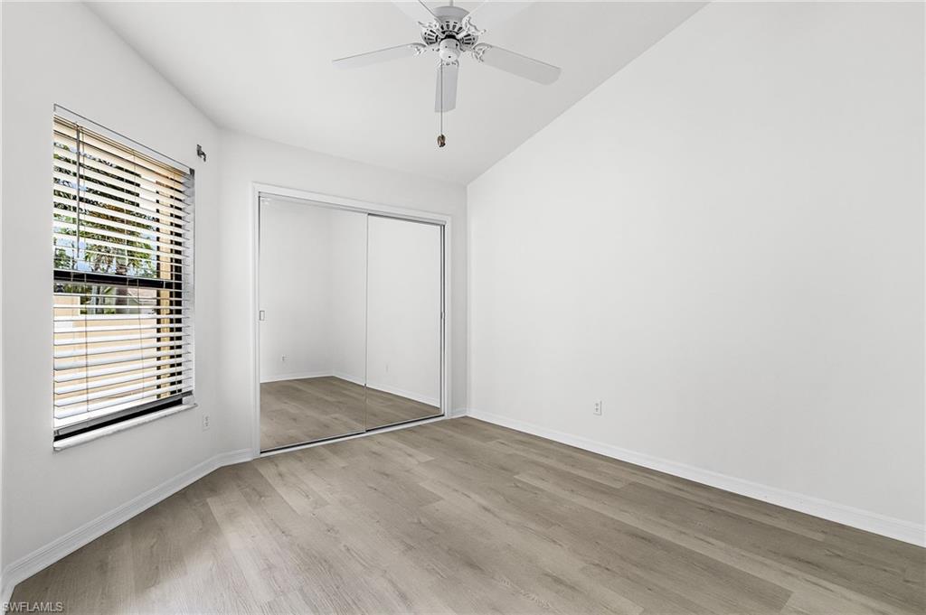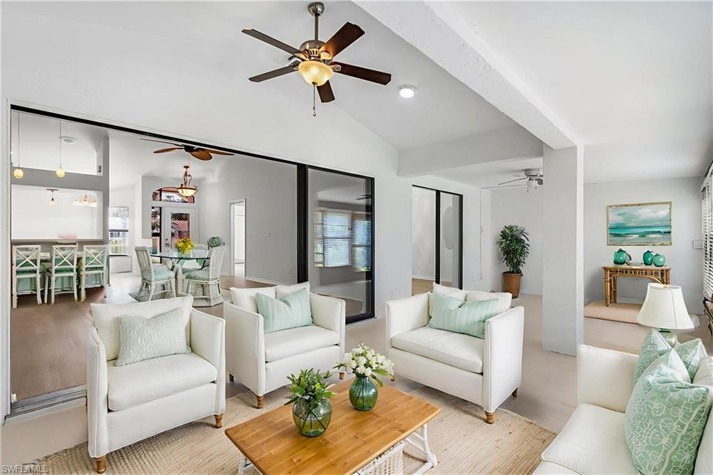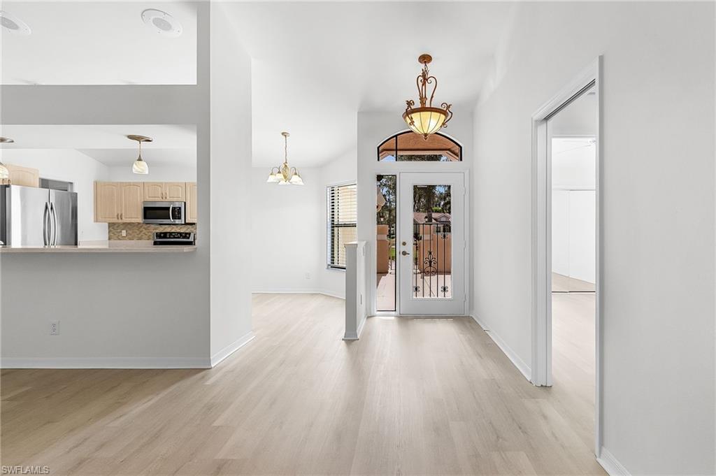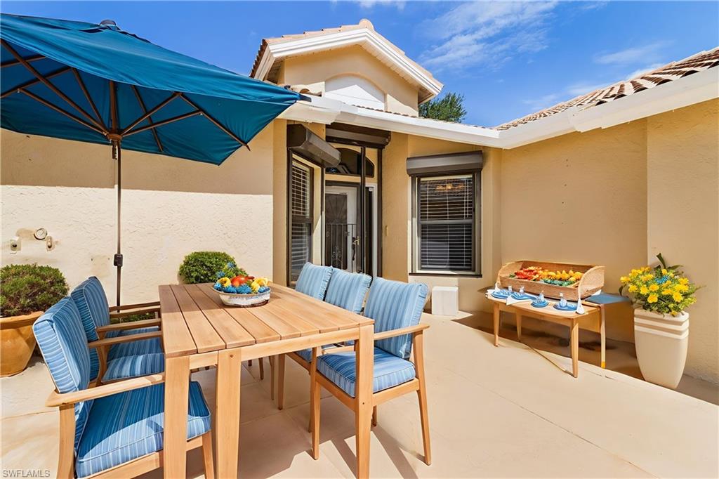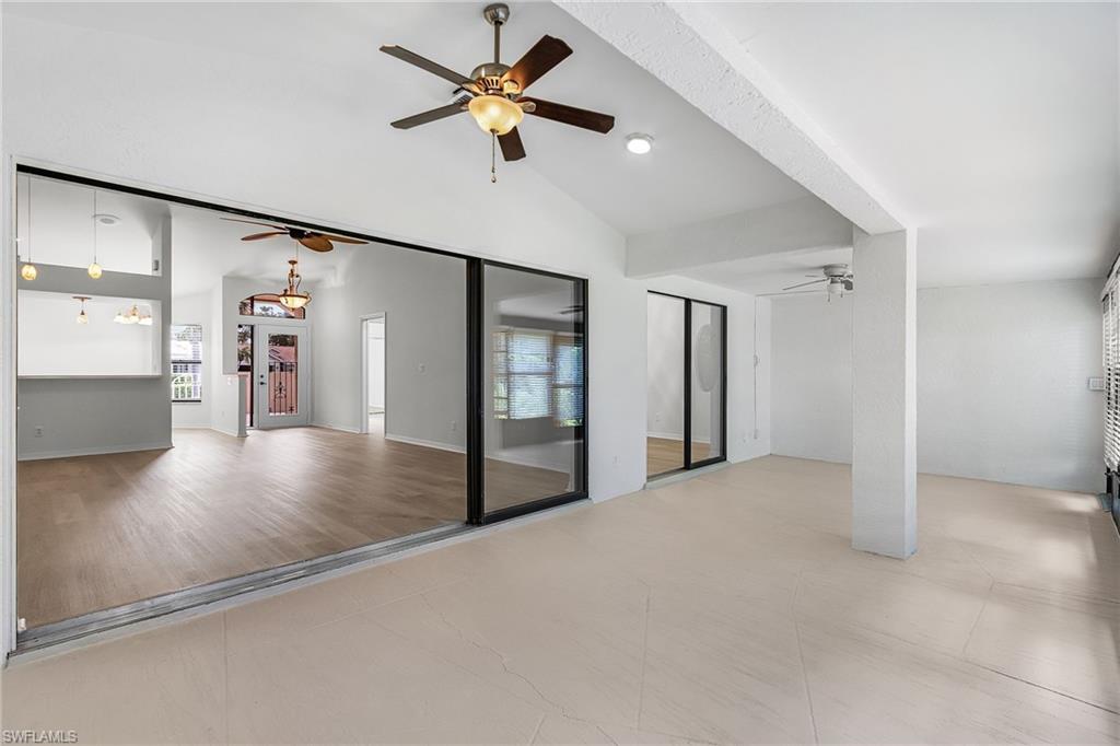 LOWEST PRICED VILLA & LOWEST PRICE PER SF IN HUNTERS RIDGE! Corner Villa home with a serene preserve backdrop and just one shared wall, showcasing new wide-plank flooring, fresh interior paint, and thoughtful upgrades throughout. A private, gated courtyard with coach lights opens to a vaulted great room plan and a bright kitchen with long prep runs, peninsula seating, a mosaic backsplash, and stainless appliances. The adjacent oversized laundry/utility room features abundant cabinetry, a folding counter, and a utility sink. An expansive enclosed Florida/sunroom spans the rear with a wall of windows to the preserve—ideal for office, fitness, hobbies, or a second living/dining zone—while ELECTRIC HURRICANE SHUTTERS deliver quick storm protection. Outside, the nicely landscaped yard and extended front patio add outdoor living space, and a rare oversized multi-car driveway makes parking effortless. Practical benefits include attic storage with overhead access—move-in ready and easy to live in. || Social-forward country-club living in a low-density, gated community. Enjoy a refreshed clubhouse (grill, patio bar, formal dining), 10,000-sf fitness/activity center with classes, and a resort pool & spa served by “The Ridge” café. Courts: 8 pickleball, 4 bocce, 2 Har-Tru tennis. Year-round live music and events. Villas living adds easy maintenance and a serene preserve view. Close to beaches, shopping/dining, and RSW. Golf is optional—not bundled—so you can add it only if you want it with no wait list. Virtual staging used in some photos.