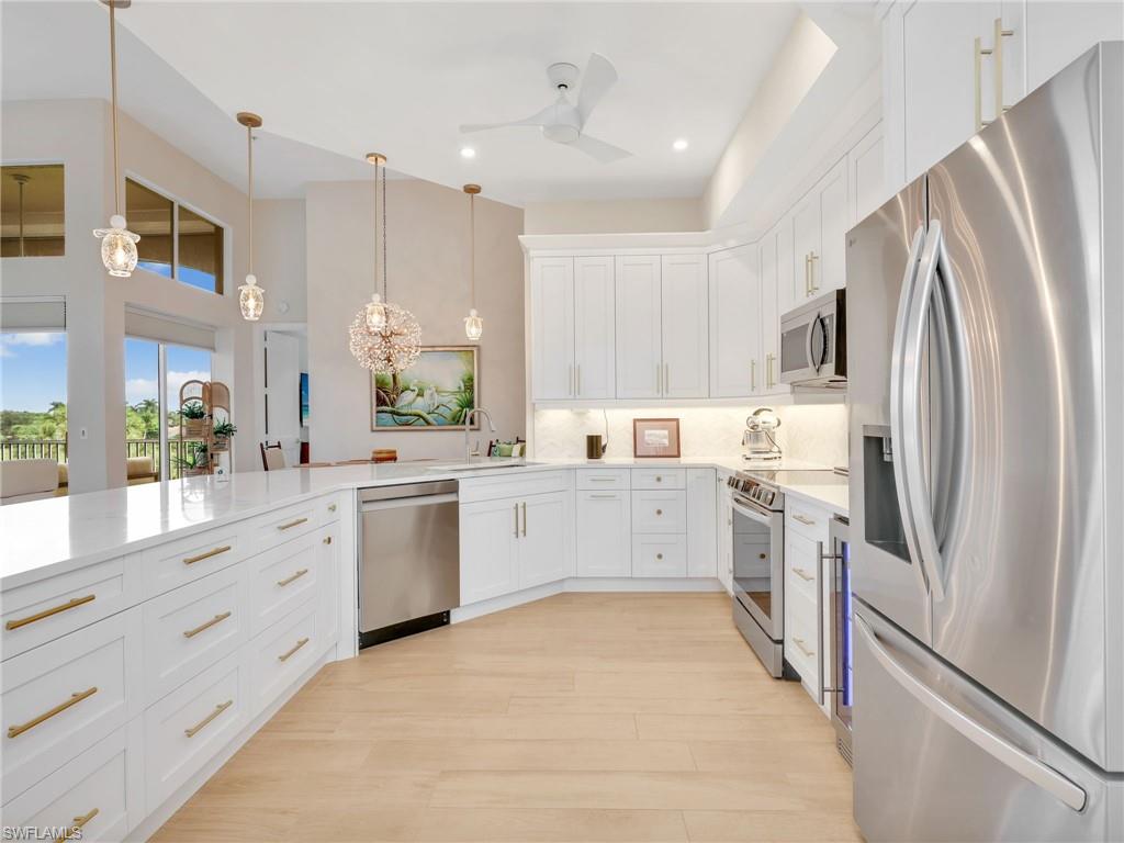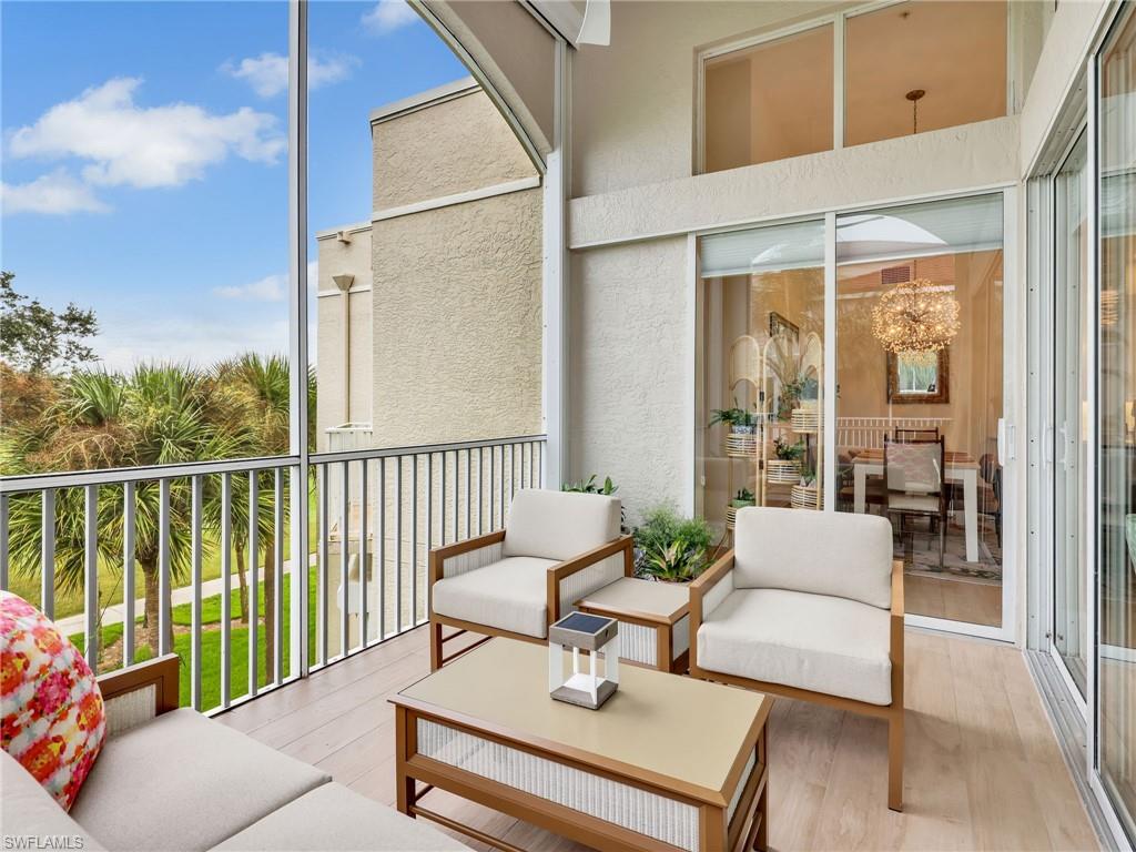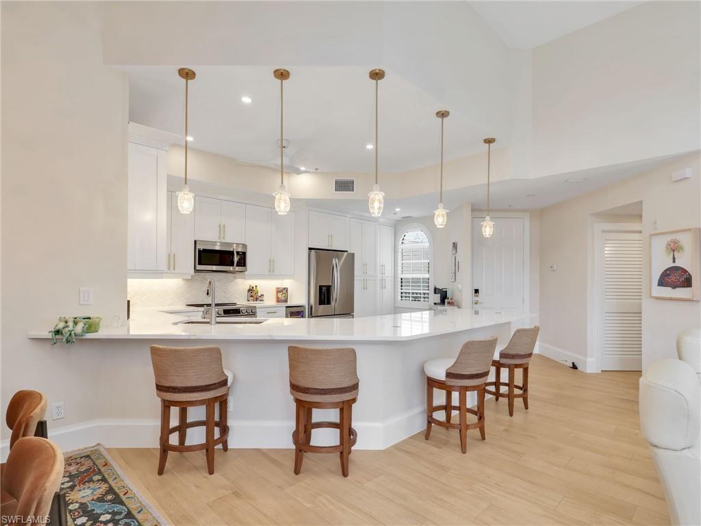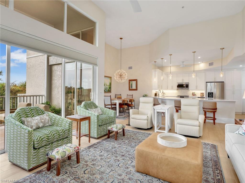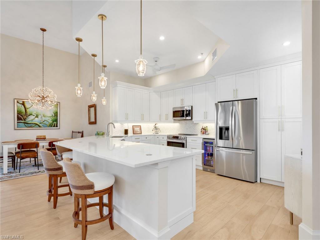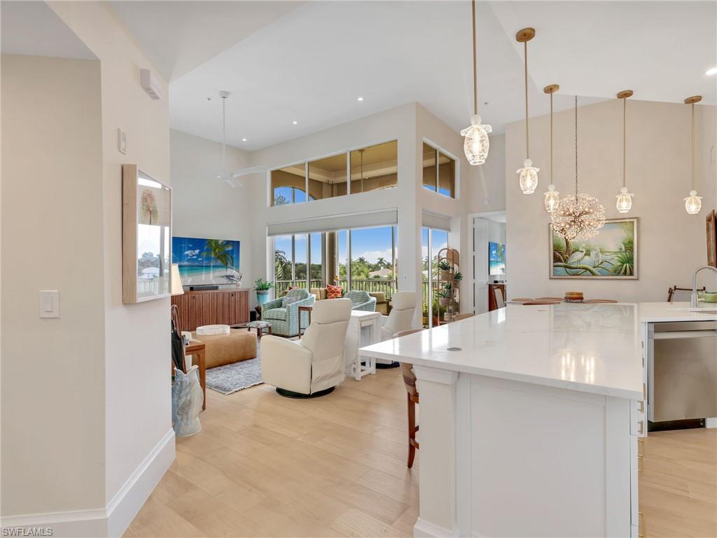 This Beautifully renovated TOP Floor end-unit condo in Clermont at Pelican Marsh has undergone an extraordinary, top-to-bottom transformation, with no detail left untouched. A complete 2024 reimagination has elevated the space, opening up the kitchen and great room by removing a dividing wall to create a more expansive and inviting layout. The eye-catching kitchen boasts all-new custom cabinetry, sleek quartz countertops, premium appliances—including a counter-depth refrigerator and wine cooler—gorgeous hand-blown glass pendant lighting, and LED recessed lighting, all working together to create a warm yet refined ambiance. Throughout the residence, brand-new tile flooring extends seamlessly, complemented by tall baseboards, wide door trim, and upgraded pocket sliding doors for closets. The primary bathroom has been completely reconfigured, now showcasing a luxurious walk-in glass shower, additional cabinetry, and all-new fixtures. Every aspect has been refreshed, including brand-new plumbing, sleek new bath fixtures, and a brand-new bathtub, ensuring every space is as beautiful as it is functional. No expense was spared in upgrading this home for comfort, efficiency, and style. Brand-New Impact Windows with New Plantation Shutters on the Impact Windows, new impact sliders in the primary bedroom, and electric impact screens on the lanai provide storm protection and peace of mind. The lanai itself has been fully upgraded with new screens, offering a serene retreat with sweeping golf course views. A new HVAC system, and a brand-new electrical panel ensure optimal climate control and reliability, while thoughtful enhancements like all-new plantation shutters, LED recessed lighting, ceiling fans, and a striking new dining chandelier add an extra layer of opulence. Even the smallest details have been refreshed, from all-new interior doors and light switches to a fresh coat of paint that ties the entire space together. Additional 2025 updates include a new tankless water heater, an electronic key entry system, and a full-glass storm door for added security. With its impressive scope of upgrades, this condo is truly move-in ready—offering an unparalleled blend of modern luxury, prime location, and stunning golf course views, all just minutes from the Gulf beaches, Mercato, and Waterside Shops.