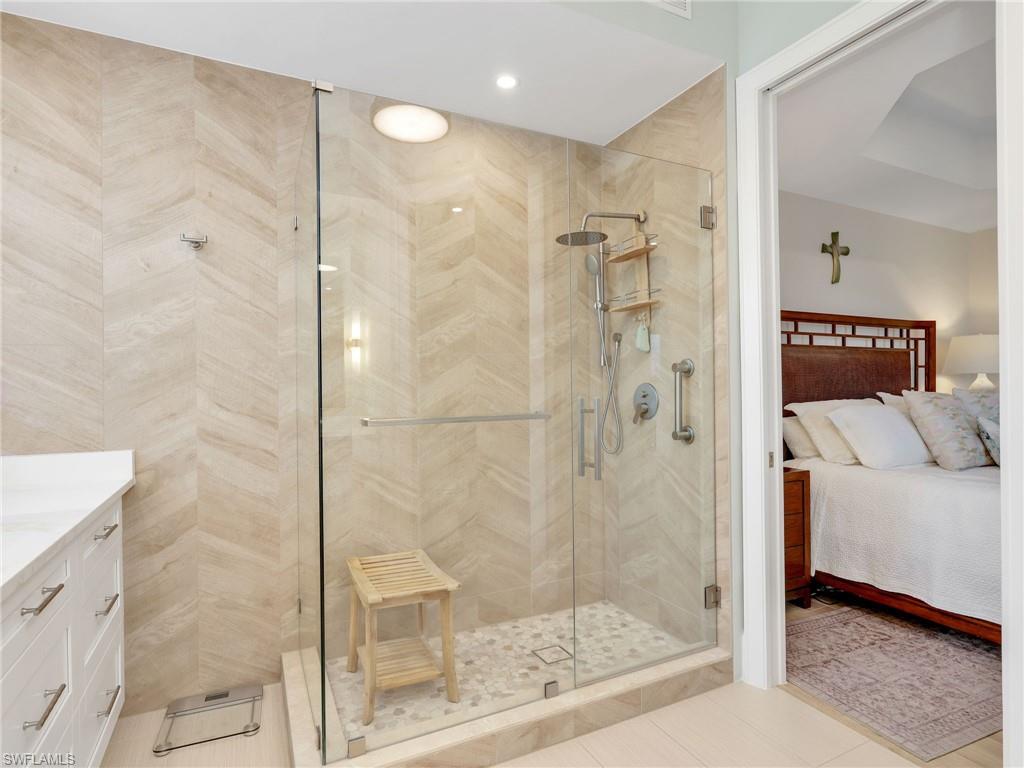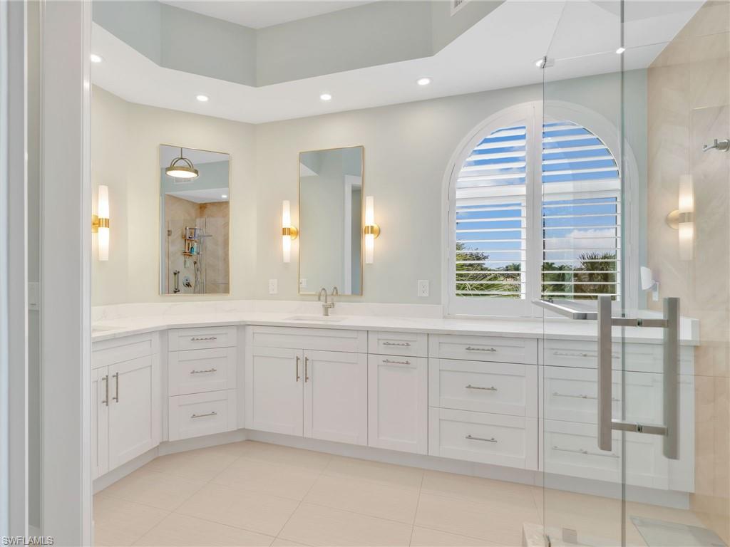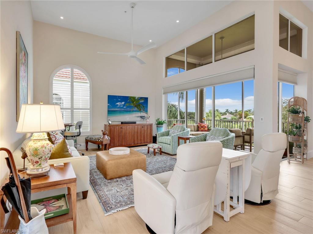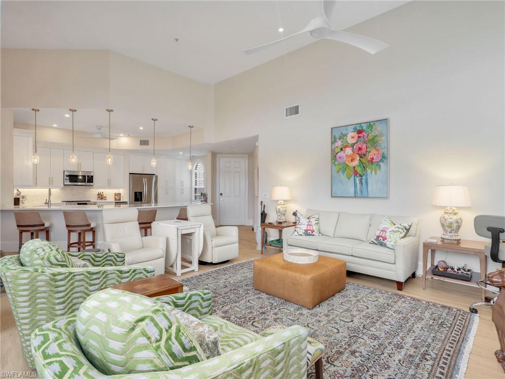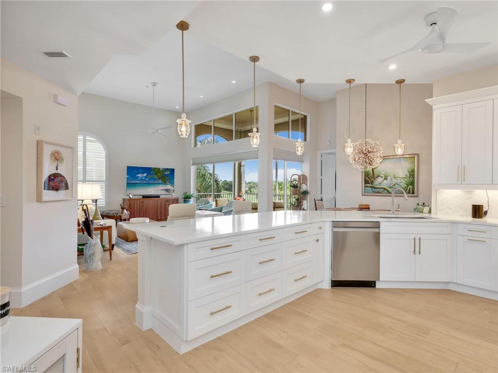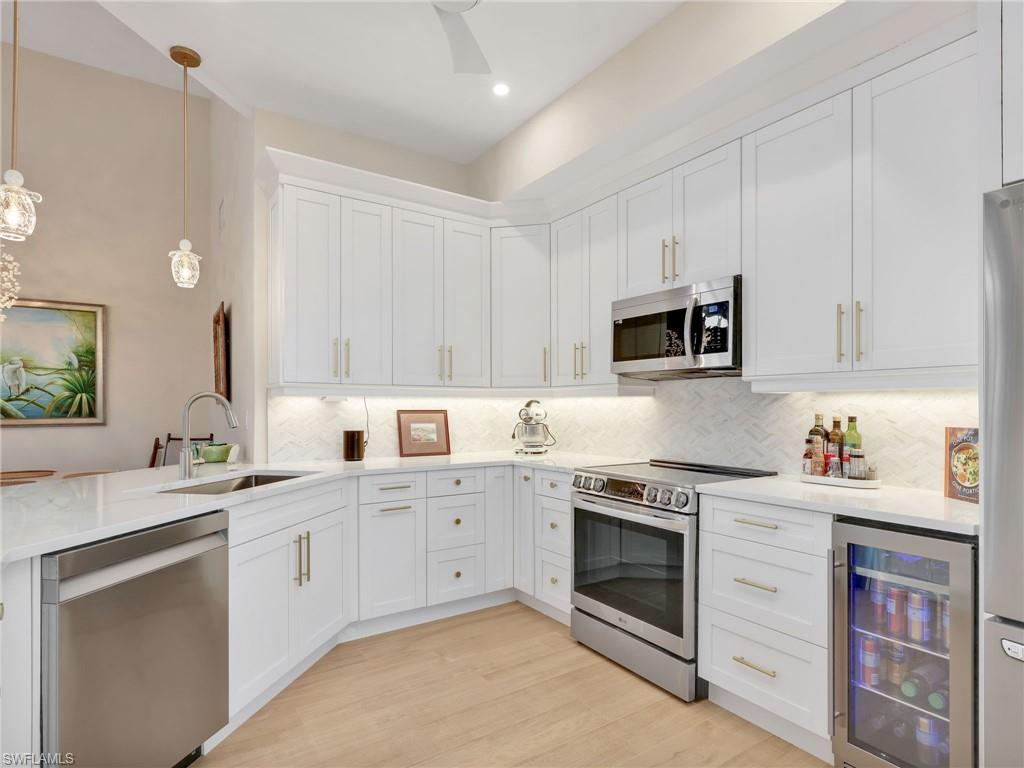 This Beautifully renovated TOP Floor end-unit condo in Clermont at Pelican Marsh has undergone an extraordinary, top-to-bottom transformation, with no detail left untouched. A complete 2024 reimagination has elevated the space, opening up the kitchen and great room by removing a dividing wall to create a more expansive and inviting layout. The eye-catching kitchen boasts all-new custom cabinetry, sleek quartz countertops, premium appliances—including a counter-depth refrigerator and wine cooler—gorgeous hand-blown glass pendant lighting, and LED recessed lighting, all working together to create a warm yet refined ambiance. Throughout the residence, brand-new tile flooring extends seamlessly, complemented by tall baseboards, wide door trim, and upgraded pocket sliding doors for closets. The primary bathroom has been completely reconfigured, now showcasing a luxurious walk-in glass shower, additional cabinetry, and all-new fixtures. Every aspect has been refreshed, including brand-new plumbing, sleek new bath fixtures, and a brand-new bathtub, ensuring every space is as beautiful as it is functional. No expense was spared in upgrading this home for comfort, efficiency, and style. Brand-New Impact Windows with New Plantation Shutters on the Impact Windows, new impact sliders in the primary bedroom, and electric impact screens on the lanai provide storm protection and peace of mind. The lanai itself has been fully upgraded with new screens, offering a serene retreat with sweeping golf course views. A new HVAC system, and a brand-new electrical panel ensure optimal climate control and reliability, while thoughtful enhancements like all-new plantation shutters, LED recessed lighting, ceiling fans, and a striking new dining chandelier add an extra layer of opulence. Even the smallest details have been refreshed, from all-new interior doors and light switches to a fresh coat of paint that ties the entire space together. Additional 2025 updates include a new tankless water heater, an electronic key entry system, and a full-glass storm door for added security. With its impressive scope of upgrades, this condo is truly move-in ready—offering an unparalleled blend of modern luxury, prime location, and stunning golf course views, all just minutes from the Gulf beaches, Mercato, and Waterside Shops.