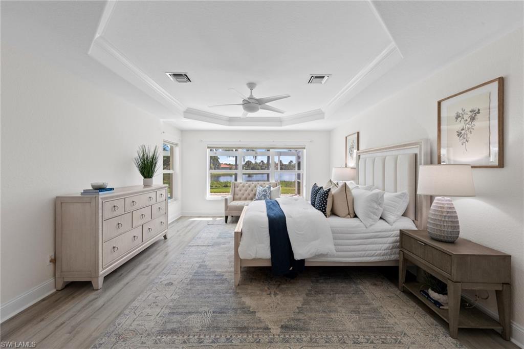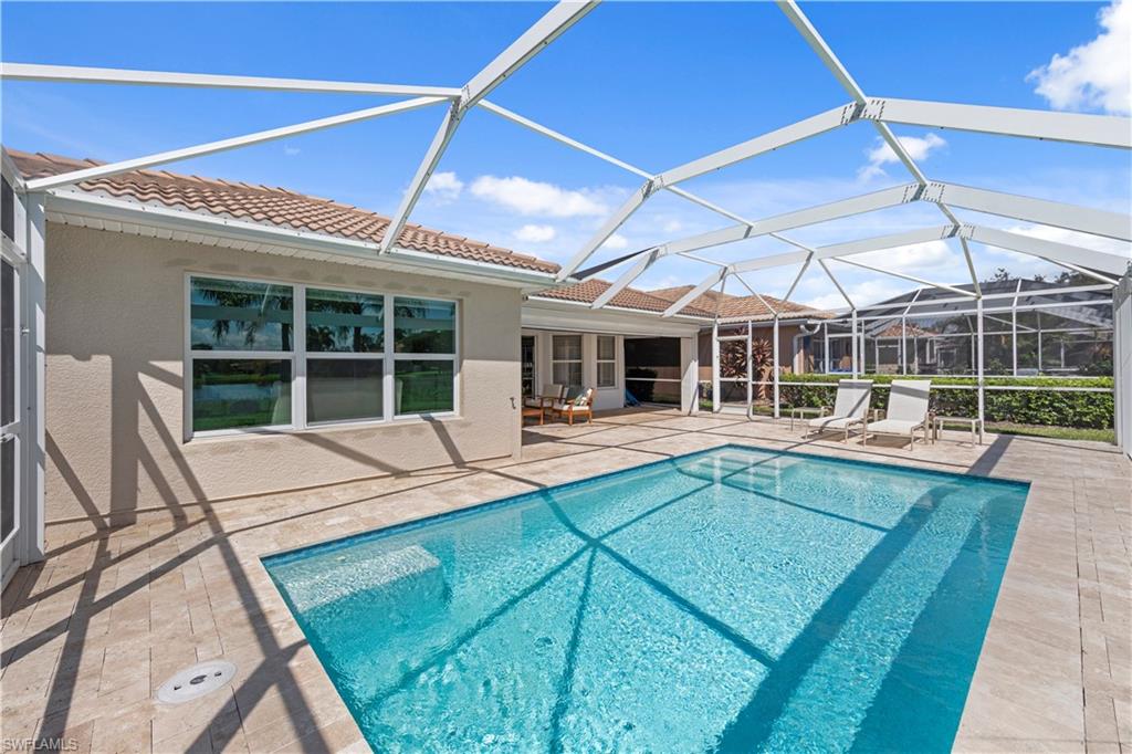 THAT VIEW… WITHOUT QUESTION, ONE OF THE BEST WIDE & DEEP WATER VIEWS IN THE RESERVE AT ESTERO! This desirable Brevia model offers 3 bedrooms, 2 full baths, and is enhanced with new impact-resistant windows for storm protection and peace of mind, plus an electric roll-down storm screen on the lanai. Inside, soaring ceilings and graceful arches set the tone for the open-concept design. Updates include LVP flooring throughout, upscale contemporary lighting and fans, plantation shutters, crown molding, and a beautifully refreshed kitchen with brand-new quartz countertops, white cabinetry, stainless steel appliances, and breakfast bar seating. From both the breakfast nook and the primary suite, enjoy gorgeous views of the lake. The oversized great room flows seamlessly through sliding glass doors to the outdoor living space, where a private pool is framed by a panoramic picture-window screen enclosure, maximizing the spectacular water view. Living at The Reserve means enjoying a resort-style lifestyle with a clubhouse, fitness center, resort-style pool and spa, tennis, pickleball, and social activities for all ages. Ideal location between Naples and Ft. Myers- just minutes to RSW Airport, Coconut Point, Miromar Outlets, Gulf Coast Town Center, and the white-sand beaches of SWFL. This is a rare opportunity to own a home with one of the most coveted views in the community—don’t miss it.