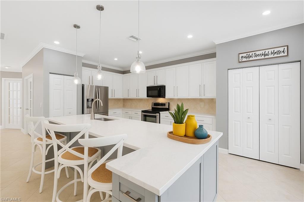 Best priced 4-Bedroom + Den Pool Home and in the best location! Situated on a small cul-de-sac street, and in move in condition. Featuring rarely offered improvements including IMPACT GLASS WINDOWS AND SLIDERS, four spacious bedrooms, a first-floor den/home office. ENJOY the bonus of leather convertible seating and TV's, comfortable patio furnishings with large fire pit, all included with your purchase. Enjoy the private oasis with the sway of the palms while enjoying the newly transformed backyard with room to extend the patio or add an extra cozy sitting area. Complete with new sod and vibrant tropical plantings, this home features a lagoon-style heated pool with a sun shelfs. The heart of the home is a stunning, updated kitchen with expansive counter space and 2024-installed appliances ready for both daily living and entertaining. The wood look flooring in the master suite, custom-built-in closets, and rich wood staircase (new in 2024) add to the luxurious feel, while beautiful new wall moldings and custom lighting throughout complete the look. Also new to the home are the 2024 washer and dryer, all of this at an amazing price. Unique to this plan, the oversized first-floor den with ceiling lights, TV, and French doors makes this an ideal flex space for a work-from-home setup or a cozy playroom/media room for the kids or a pull-out for those overnight guests. Located directly across from the resort-style clubhouse, you’ll have easy access to a state-of-the-art fitness center, lockers, showers, and a dry sauna, a dance/yoga studio for on-site pilates and yoga classes. lap pool, family pool, toddler pool, clay Har-Tru tennis courts, basketball court, billiards, and playground. All of these are steps away from your front door. Unique to the community, the passive park is a hidden gem with large walking paths and peaceful pine trees. Low-maintenance living is made easy with the association covering yard work, irrigation water, high-speed fiber-optic cable, Wi-Fi, and a manned guard gate, plus a resident-only gate to Logan Blvd. Additional Recent Updates: New sod and plantings (2025) Stainless steel refrigerator (late 2023) Pool pump (2022) Hot water heater (Nov 2024) 55” TV in family room (2024) small TV's in bedrooms (expect master) Iron & wood staircase (2024)