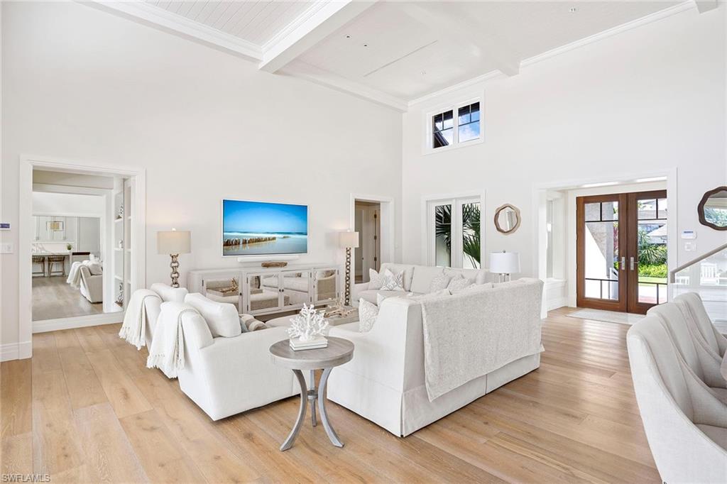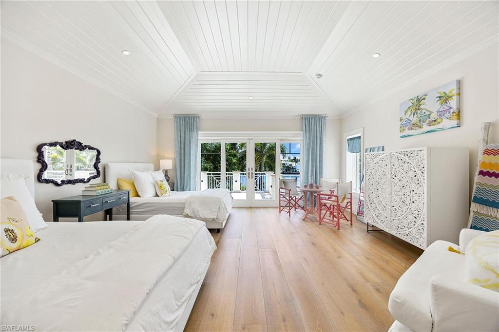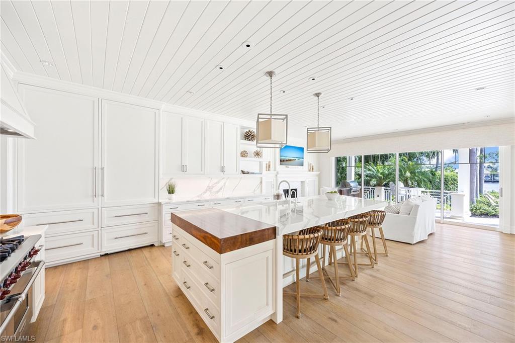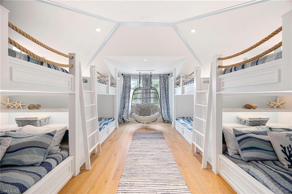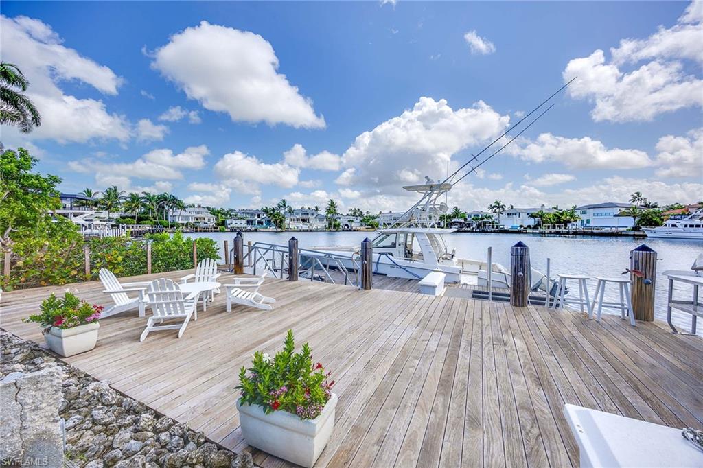Blending timeless West Indies charm with modern luxury, this exquisitely reimagined Aqualane Shores residence was updated in 2021 by Kurtz Homes with Stofft Cooney Architects. A thoughtfully designed second-floor addition introduces two spacious guest suites and a custom eight-bed bunk room, ideal for family and friends. Set on a lush lot with serene long-water views across Aqua Cove’s deepwater basin, the home offers a rare combination of privacy and direct Gulf access. The main level features a light-filled open layout, a grand great room and study. Finishes include wide-plank oak floors, tongue-and-groove ceilings and custom millwork. The kitchen boasts a large island, quartz countertops, a Wolf eight-burner gas range, dual dishwashers and handcrafted cabinetry. Impact-rated Nano doors open to a refinished marble pool deck. An IPE wood deck with floating dock and platform lift completes this waterfront retreat. For peace of mind, the home includes a generator. Just across from 21st Avenue beach access and moments from 3rd Street S, this residence defines Naples waterfront living.