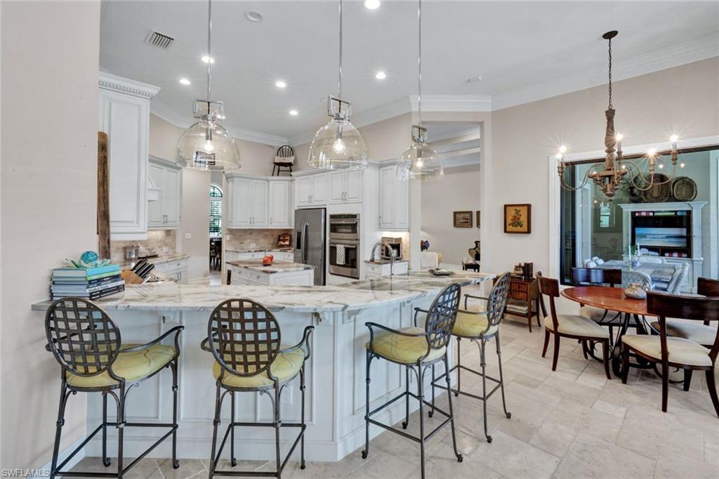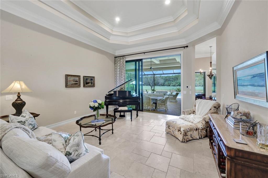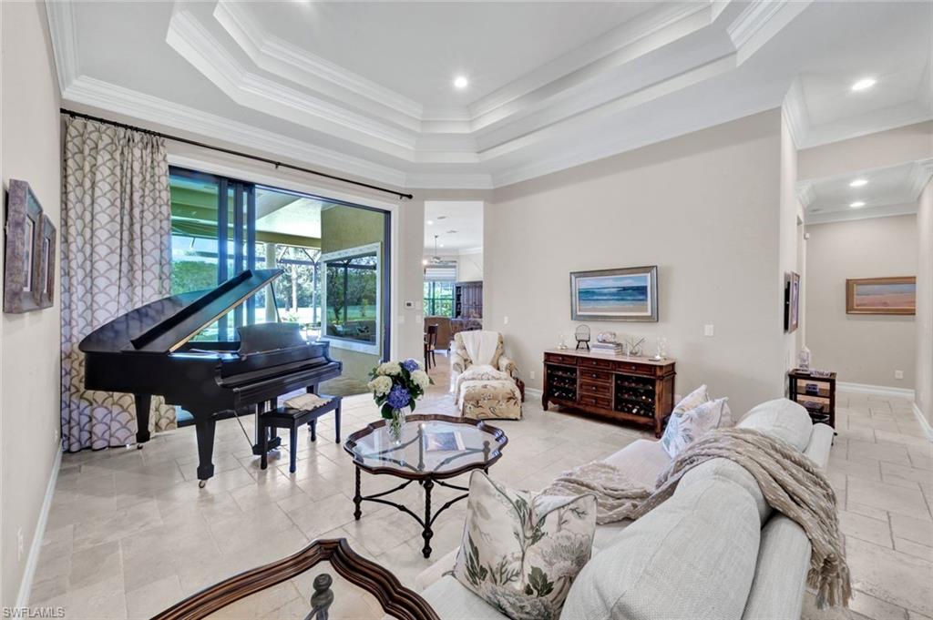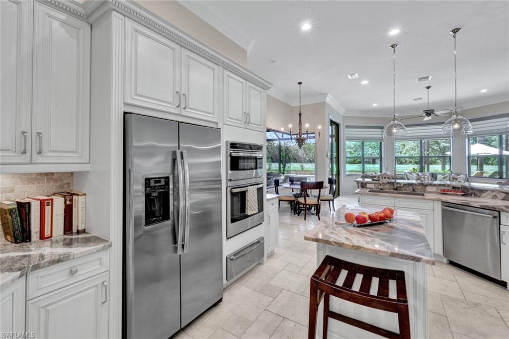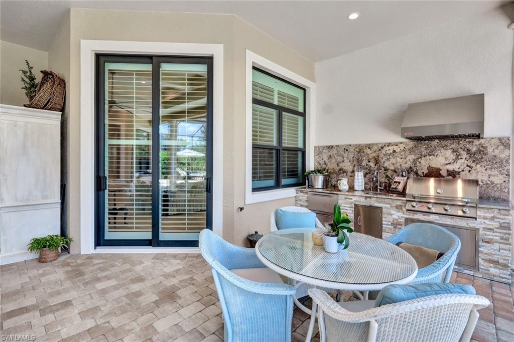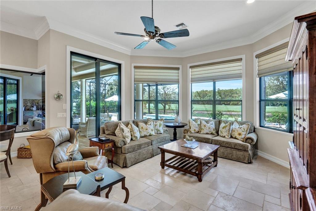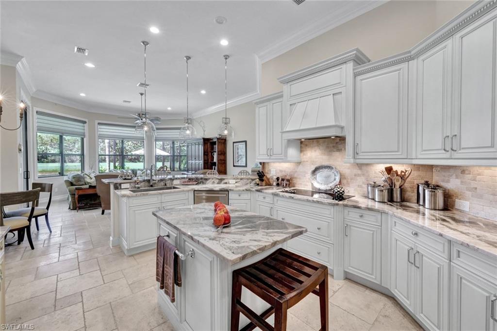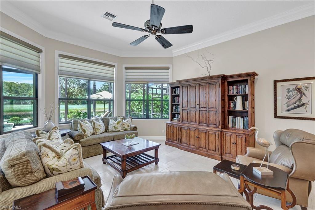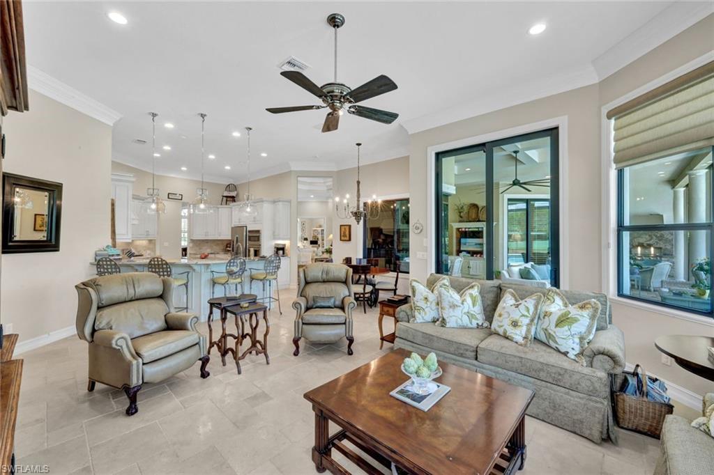 Immediate GOLF! Experience the perfect blend of elegance and comfort in this exceptional three-bedroom, four-bathroom residence with den, living and family rooms, and a thoughtfully designed gourmet kitchen with quartzite counters, Top Zero sink, Bosch appliances, and a spacious breakfast nook. Soaring 14-foot ceilings, impact glass windows and doors, crown molding, plantation shutters, and custom cabinetry showcase timeless craftsmanship. Each bathroom is beautifully upgraded with premium vanities, quartzite finishes, and sleek shower enclosures. The expansive lanai offers a private outdoor oasis with a sparkling pool and spa, complete with a 24-inch raised wall with scuppers, sun shelf, extended bench, picture window screening, upgraded lighting, and a new spa pump. The enlarged outdoor kitchen is fully equipped for entertaining, featuring a 2025 refrigerator, upgraded countertops and with unobstructed lake and golf course views.Additional highlights include a laundry room, insulated and air-conditioned 3car garage with remote-controlled ceiling storage. Every detail has been meticulously upgraded to deliver refined living at its best.all of this Plus a GOLF MEMBERSHIP! Twin Eagles offers 36 holes of championship Golf, tennis, Pickleball, bocce, Tiki bar, and a state of the art fitness center. You won’t be disappointed!