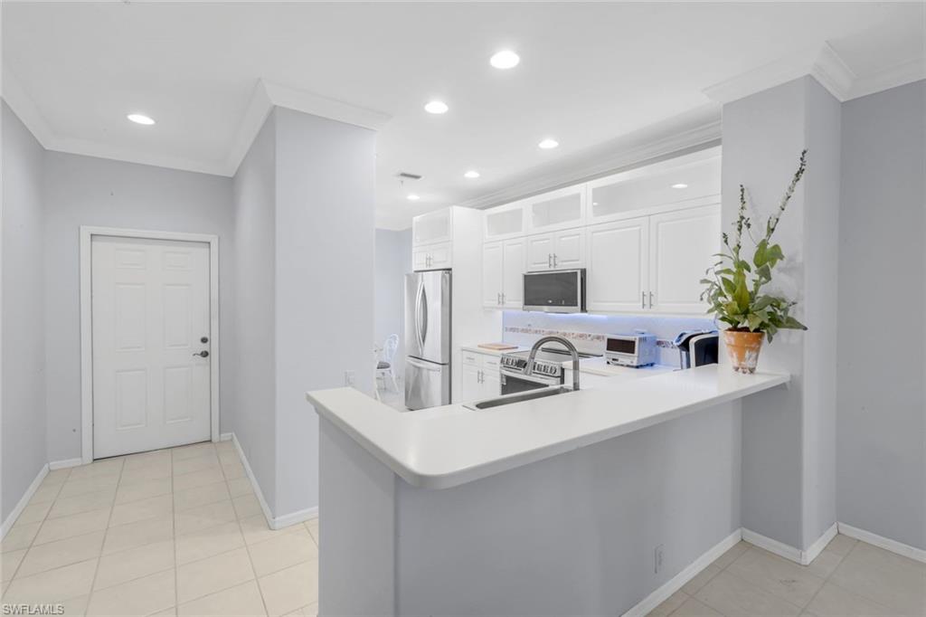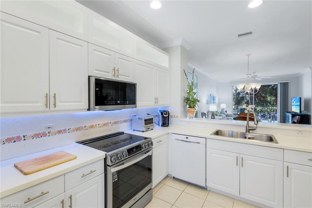 Vanderbilt Country Club offering this tasteful 2-bedroom, turnkey condo! Modern redesigned kitchen cabinets with interior lighting, as well as new appliances, make this kitchen standout. Freshly painted throughout with neutral colors, crown molding, split bedrooms for privacy and a stunning view of the pond & 11th Fairway are added bonuses. The newly completed state-of-the art pool is simply magnificent. Additionally, there are 3 satellite pools with grills for outdoor cooking & evenings by the pool The building location is perfect as it is close proximity to the satellite pool, clubhouse and vibrant terrace cafe. The community is active with outside dining, dancing under the stars, fantastic Caribbean beverages and great food options from the club chef, all in a "blue zone" community. The list goes on and on of the varied activities for one an all. There is a "vibe" here that is contagious with laughter & comradery! Bundled golf with a challenging course with views of the 11th green and flush with eye popping landscaping and flowers, as well as driving range over water are hard to beat. Not a golfer? How about swimming, card games, tennis, cooking events, trivia, volunteering, state-of-the art gym, with on-site massage and PT? Paradise here is a reality. Rentals are in high demand here as well, because the word is out. Come and see what the "vibe" is about. This home is ready to close and have your memories begin.