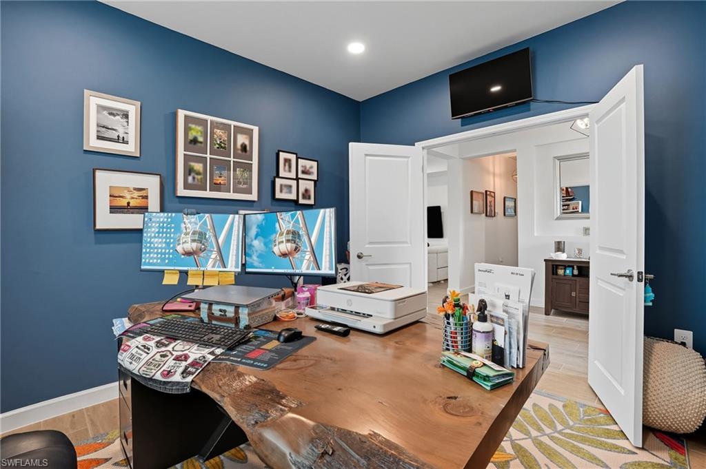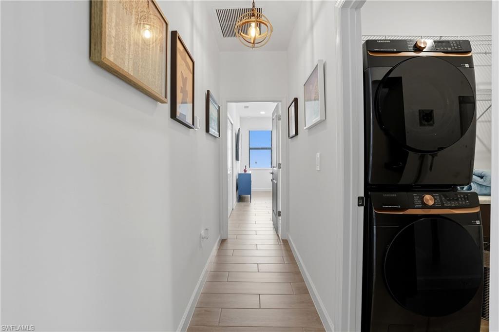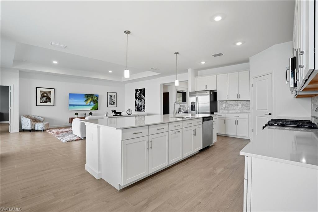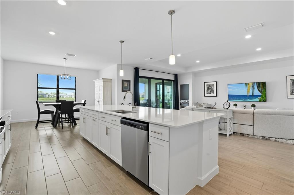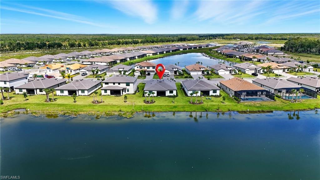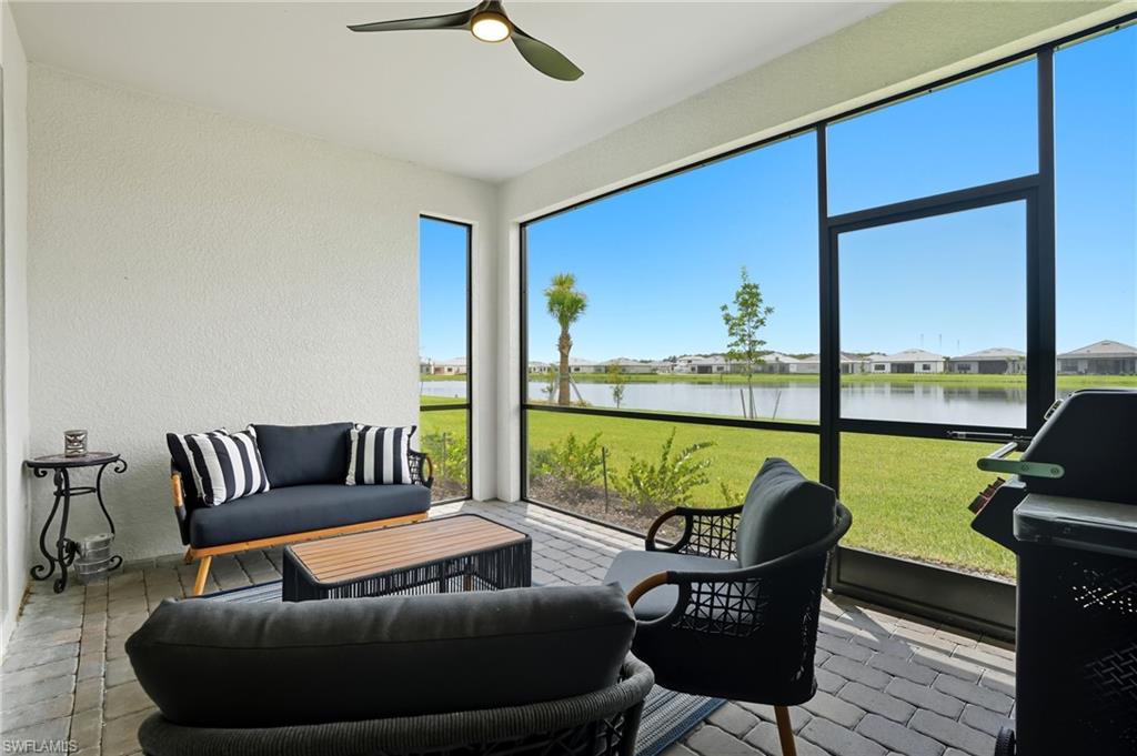 Stunning lakefront Summerville floor plan in Verdana Village featuring 3 bedrooms plus den, 3 full bathrooms, and a spacious 3-car garage. This open-concept home welcomes you with elegant double glass door entry and offers breathtaking western sunset views over one of the largest lakes in the community. Inside, you'll find thoughtful upgrades throughout, including a full gutter system around the entire roof, sealed driveway and lanai with two coats of paver seal, and custom built-in shelving in the primary closets. The laundry room is fully upgraded with a Samsung stacked washer and dryer, utility sink, countertop, and added shelving for storage. Recessed lighting with dimmer switches enhances the ambiance in all bedrooms and the living room, while wall outlets are pre-wired for mounted TVs in each bedroom and the main living area. The kitchen features a stylish backsplash, and the lanai includes a ceiling fan for added comfort. The garage is finished with epoxy flooring and wall-mounted shelving for optimal organization. This home is located in a natural gas community and includes a gas stove and oven as well as an on-demand tankless hot water heater for energy-efficient living. Living in Verdana Village means access to unmatched amenities for every lifestyle. Enjoy 4 indoor and 14 outdoor pickleball courts, 2 indoor and 6 outdoor tennis courts, and indoor sports facilities designed for players of all levels. Stay active in the state-of-the-art fitness center or unwind at the resort-style pool and poolside bar. On-site dining is available at the Drift Restaurant & Craft Lounge. The community also features a kid’s playground, dog park, and convenient golf cart access to nearby retail including Publix, Dunkin’, UPS Store, Fifth Third Bank, and New York Pizza & Pasta. All of this, just a short drive from Southwest Florida’s finest beaches, shopping, dining, and RSW International Airport. This is your opportunity to enjoy the Florida lifestyle in a move-in ready, beautifully upgraded home where every day feels like a vacation. Schedule your private showing today!