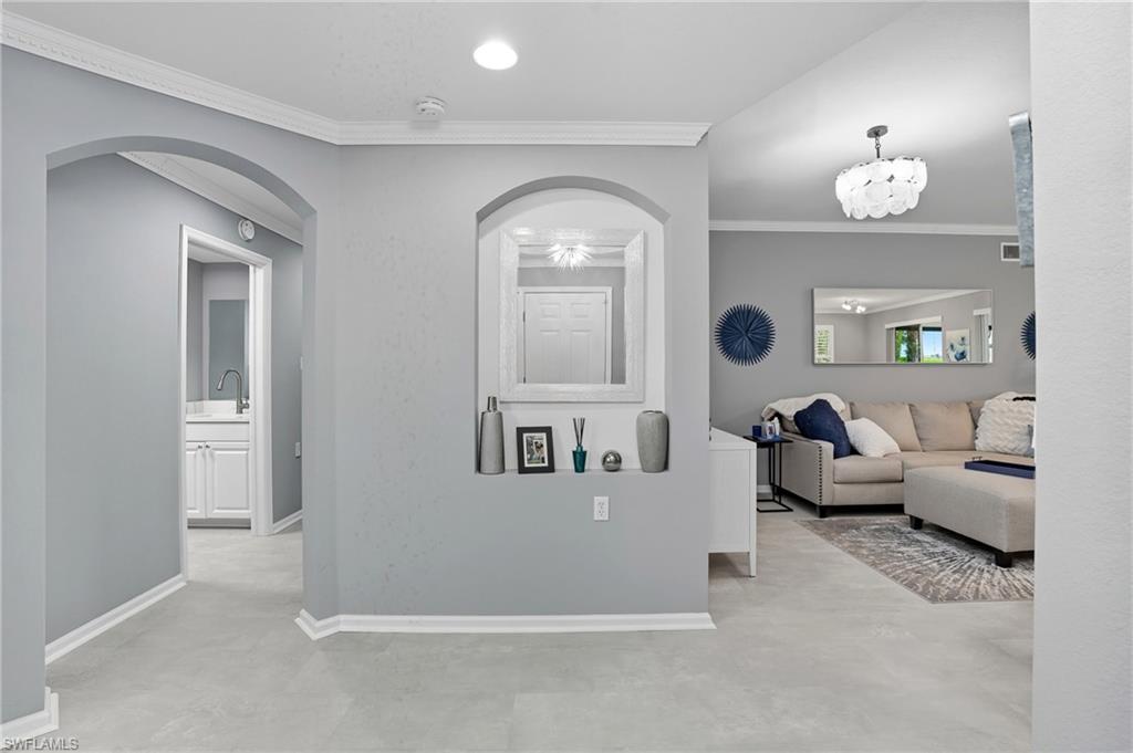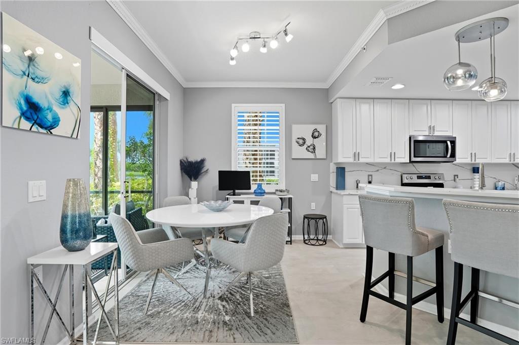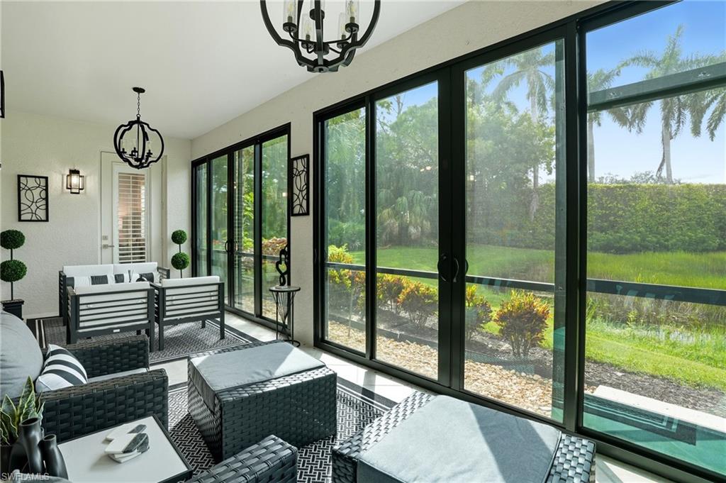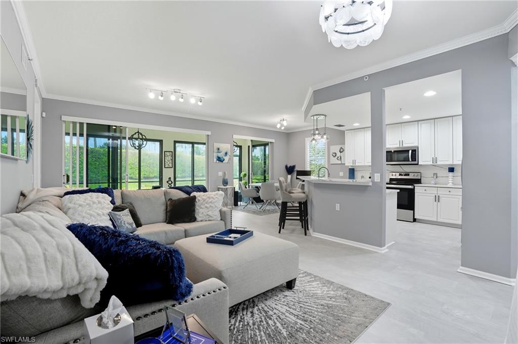 Rarely available, this exquisite residence at 10020 Valiant Ct #102 offers the epitome of luxury living within the main gates of Miromar Lakes. A meticulously updated 1st floor gem features IMPACT GLASS WINDOWS AND SLIDER! Offering 1,654 sq. ft. of modern luxury, this 3-bedroom, 2-bath home (den functions as 3rd bedroom) showcases refined elegance. This stunning home is a true rarity featuring several premium upgrades including $30K impact glass sliders and $20K impact windows ensuring both superior protection and undeniable value— These high-end features not only enhance the homes aesthetic appeal but also offer unparalleled peace of mind. Enjoy the sophisticate ambiance created by newer luxury vinyl flooring, an open-concept kitchen layout with wall removed, for an expended layout and modernized fixtures throughout. The renovated 2nd bath exudes spa like luxury, while the newer washer and dryer add even more convenience to daily living. Embrace the future with smart-home technology including a Nest thermostat, MyQ smart garage door opener with upgraded locks, Ring doorbell, and motorized power shades on the sliders. The lanai has been updated with newer screens for year-round enjoyment. Furniture is negotiable! Living at Miromar Lakes Beach & Golf Club means access to award-winning amenities: 700 acres of freshwater lakes, white sandy beaches, boating, golf, tennis, pickleball, a full-service spa, fitness, and fine dining. This home offers rare upgrades and a coveted lifestyle all in one.