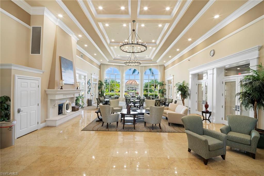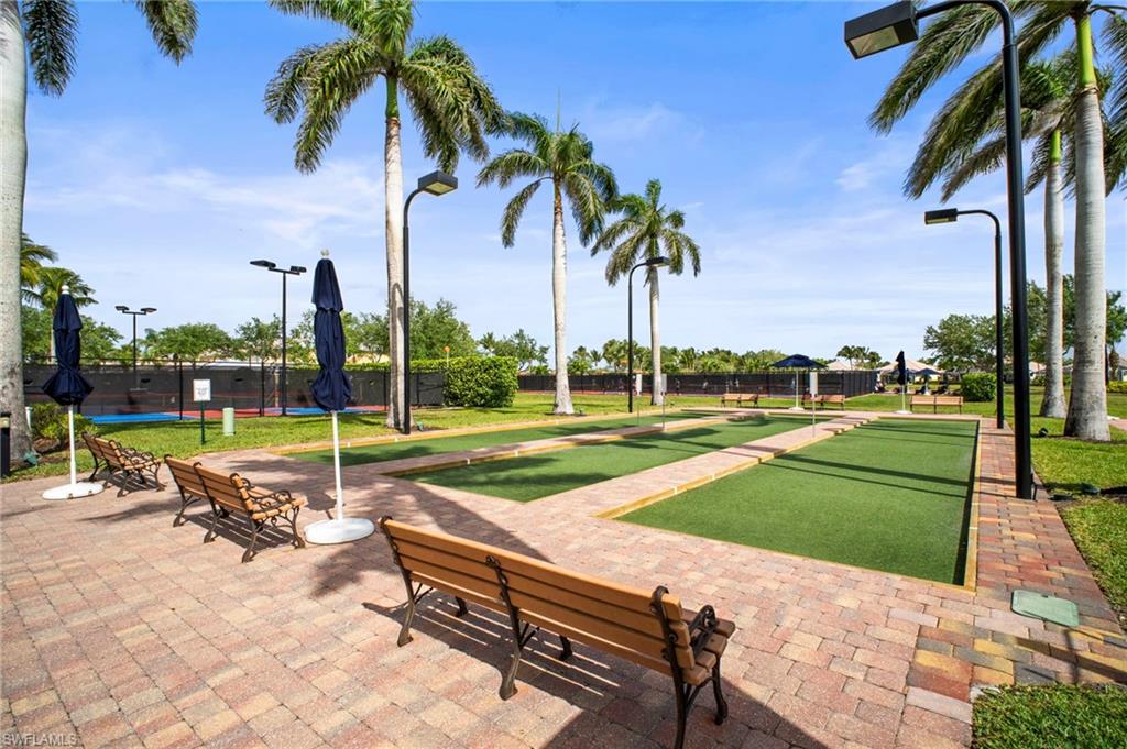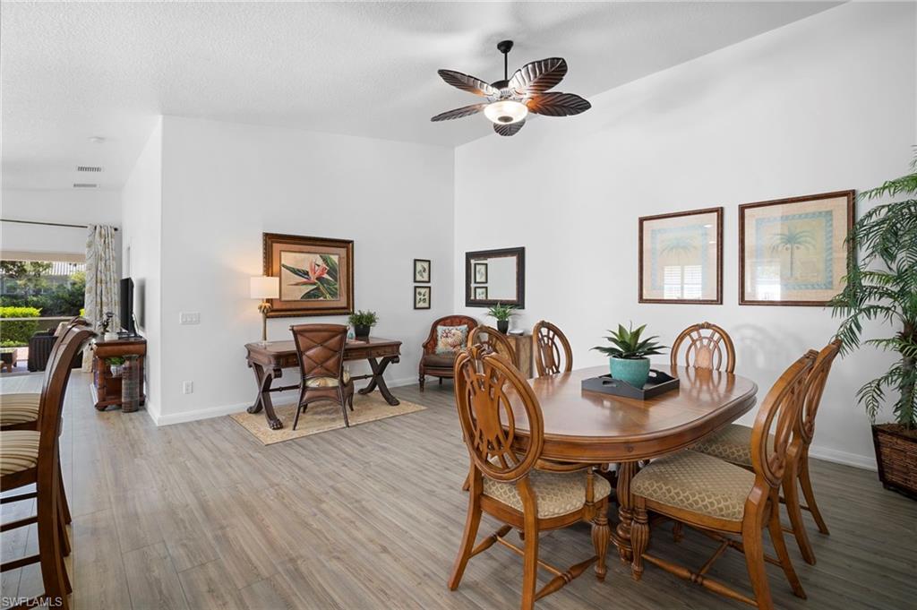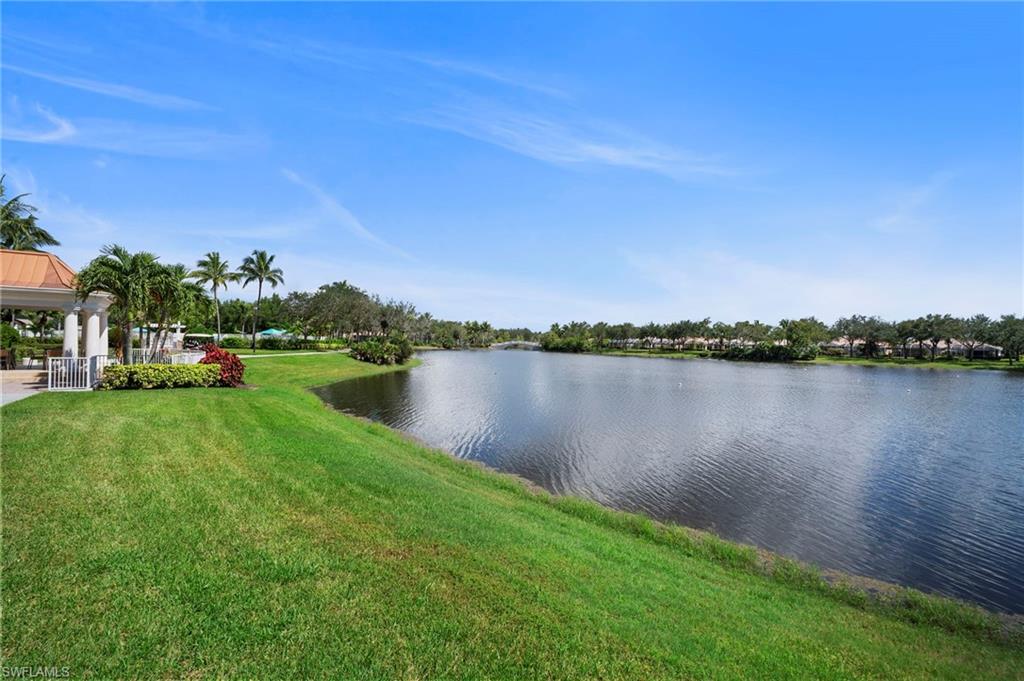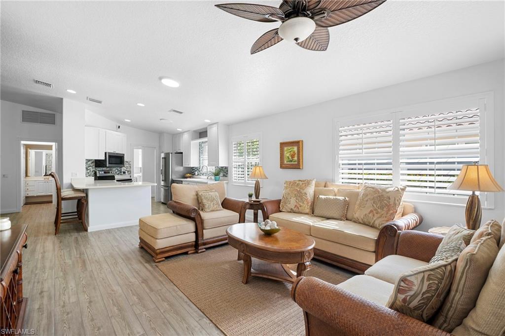 Welcome to Village Walk of Bonita Springs, a highly desirable, amenity-rich community offering an exceptional lifestyle and 22 miles of scenic riverwalks, sidewalks, and pedestrian bridges—perfect for walking, biking, and outdoor enjoyment. At the heart of the community is the vibrant Towne Center, featuring a resort-style pool, lap pool, 24-hour fitness center, pickleball, tennis, bocce, basketball, and a playground. Residents also enjoy a variety of on-site conveniences, including a restaurant with bar & grill, bagel shop, ice cream parlor, gas station, car wash, salon, and ATM. With modest HOA fees, golf cart-friendly streets, and a full-time activities director, Village Walk makes it easy to stay active, social, and connected. This beautifully updated Capri villa offers a spacious and inviting layout, featuring 2 large bedrooms, 2 full bathrooms, a generous open den, and an expansive living and dining area with vaulted ceilings. The attached 2-car garage is spacious, while the large laundry room is equipted with a sink and ample built-in storage. Luxury vinyl, plank flooring flows seamlessly throughout the entire home, complemented by fresh interior paint and coastal plantation shutters that enhance the light, airy atmosphere and cohesive design. The open-concept kitchen has been thoughtfully upgraded with new, stainless-steel appliances and glass tile backsplash, offering a perfect view into the main living spaces—ideal for entertaining or everyday living. Enjoy tranquil lake views from indoors, the covered lanai, or the extended outdoor patio, finished with premium paver stones—an ideal setting for relaxing or hosting guests. Offered Turnkey, this home is move-in ready and waiting for you to enjoy everything this vibrant, resort-style community has to offer. Welcome to paradise!