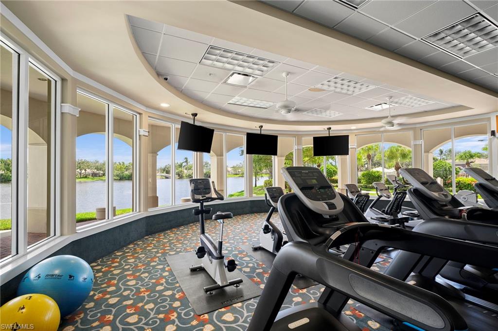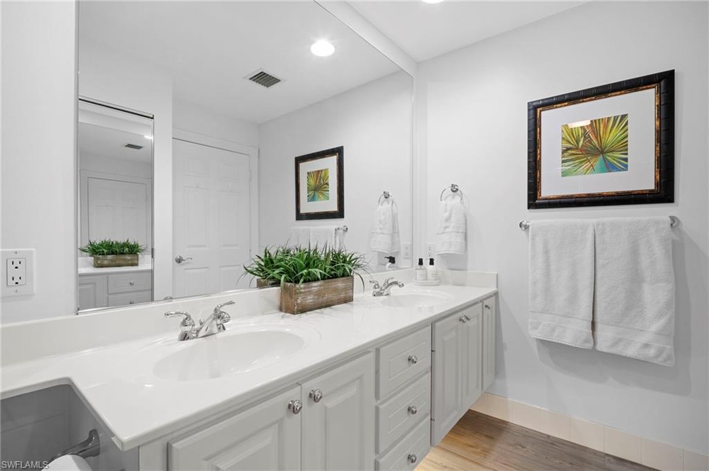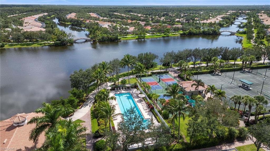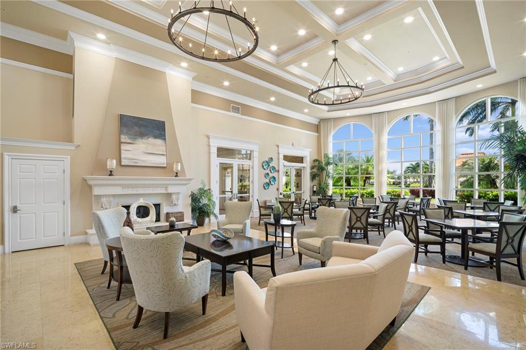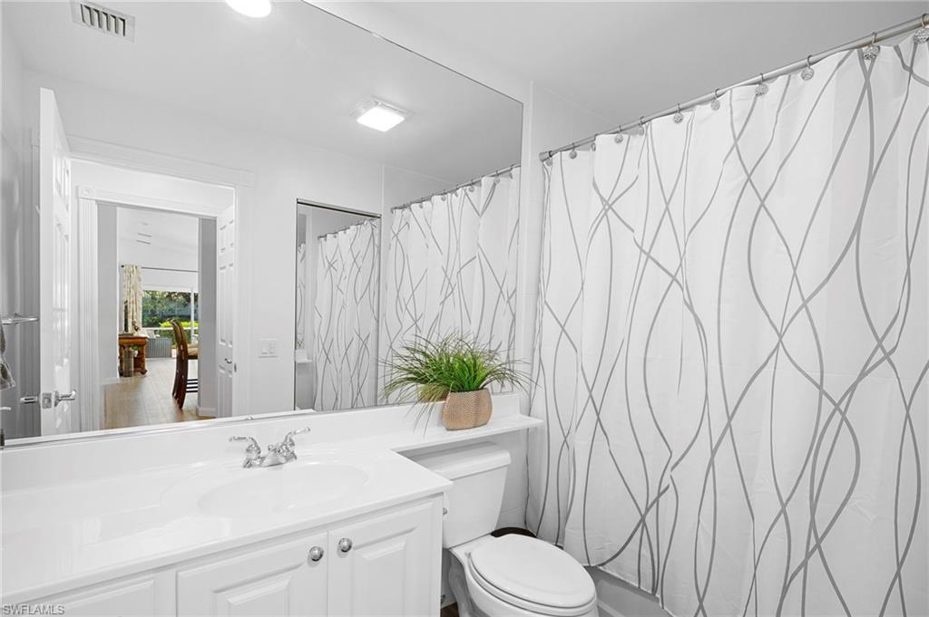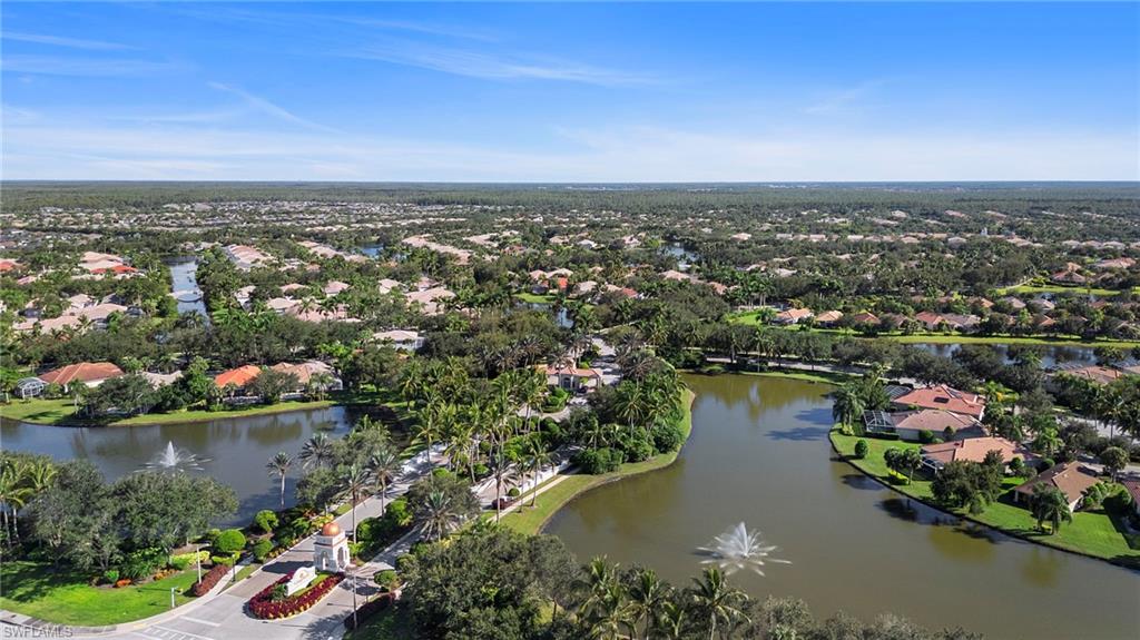 Welcome to Village Walk of Bonita Springs, a highly desirable, amenity-rich community offering an exceptional lifestyle and 22 miles of scenic riverwalks, sidewalks, and pedestrian bridges—perfect for walking, biking, and outdoor enjoyment. At the heart of the community is the vibrant Towne Center, featuring a resort-style pool, lap pool, 24-hour fitness center, pickleball, tennis, bocce, basketball, and a playground. Residents also enjoy a variety of on-site conveniences, including a restaurant with bar & grill, bagel shop, ice cream parlor, gas station, car wash, salon, and ATM. With modest HOA fees, golf cart-friendly streets, and a full-time activities director, Village Walk makes it easy to stay active, social, and connected. This beautifully updated Capri villa offers a spacious and inviting layout, featuring 2 large bedrooms, 2 full bathrooms, a generous open den, and an expansive living and dining area with vaulted ceilings. The attached 2-car garage is spacious, while the large laundry room is equipted with a sink and ample built-in storage. Luxury vinyl, plank flooring flows seamlessly throughout the entire home, complemented by fresh interior paint and coastal plantation shutters that enhance the light, airy atmosphere and cohesive design. The open-concept kitchen has been thoughtfully upgraded with new, stainless-steel appliances and glass tile backsplash, offering a perfect view into the main living spaces—ideal for entertaining or everyday living. Enjoy tranquil lake views from indoors, the covered lanai, or the extended outdoor patio, finished with premium paver stones—an ideal setting for relaxing or hosting guests. Offered Turnkey, this home is move-in ready and waiting for you to enjoy everything this vibrant, resort-style community has to offer. Welcome to paradise!