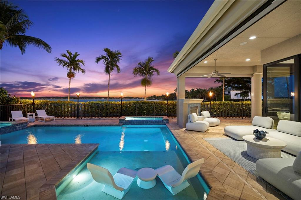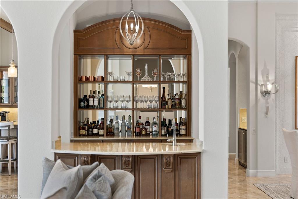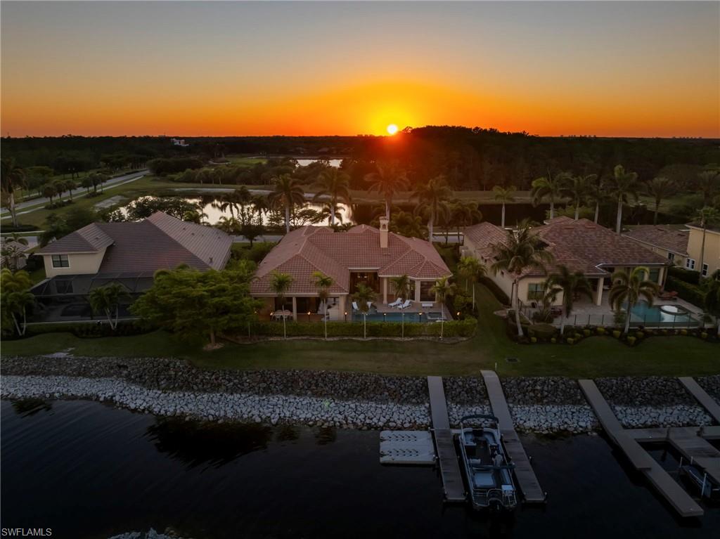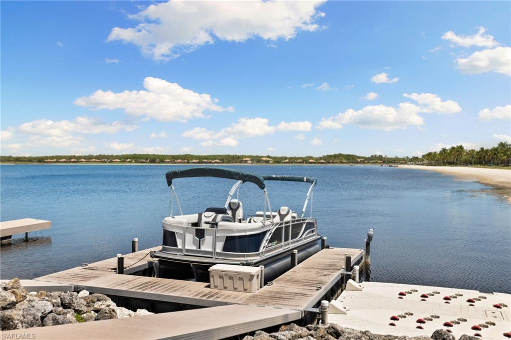 Golf and boating highlight this rare waterfront estate in The Quarry. This custom Arthur Rutenberg estate is perfectly positioned on a .38 acre home site with sweeping views of Stone Lake and the beach. A private dock and boat lift provide direct access to over 500 acres of navigable lakes and waterways, delivering an unmatched boating lifestyle right from your backyard. Step inside through wrought-iron doors and be greeted by picture windows showcasing the forever lake views and an open floor plan designed for entertaining. Highlights include a wet bar and wine bar, a chef’s kitchen with gas cooktop, exposed stained beams, multiple tray ceilings, and pocketing sliding glass doors that blend indoor and outdoor living. Notable upgrades include impact-rated windows and doors, a whole-house water softener, air-conditioned garage, two gas fireplaces, motorized roll-down hurricane and bug screens, tile and wood flooring throughout, and a custom pool with tiki torch ambiance. The Quarry is a gated, resort-style community with something for everyone: boating, championship golf, tennis, pickleball, bocce, multiple dining options, a tiki bar, poolside food and beverage service, a fitness center, and a full social calendar led by an on-site activities director. Golf membership is optional, and a $20 million renovation of the Lake Lodge and Beach Club was recently completed. A pontoon boat is also available for purchase.
