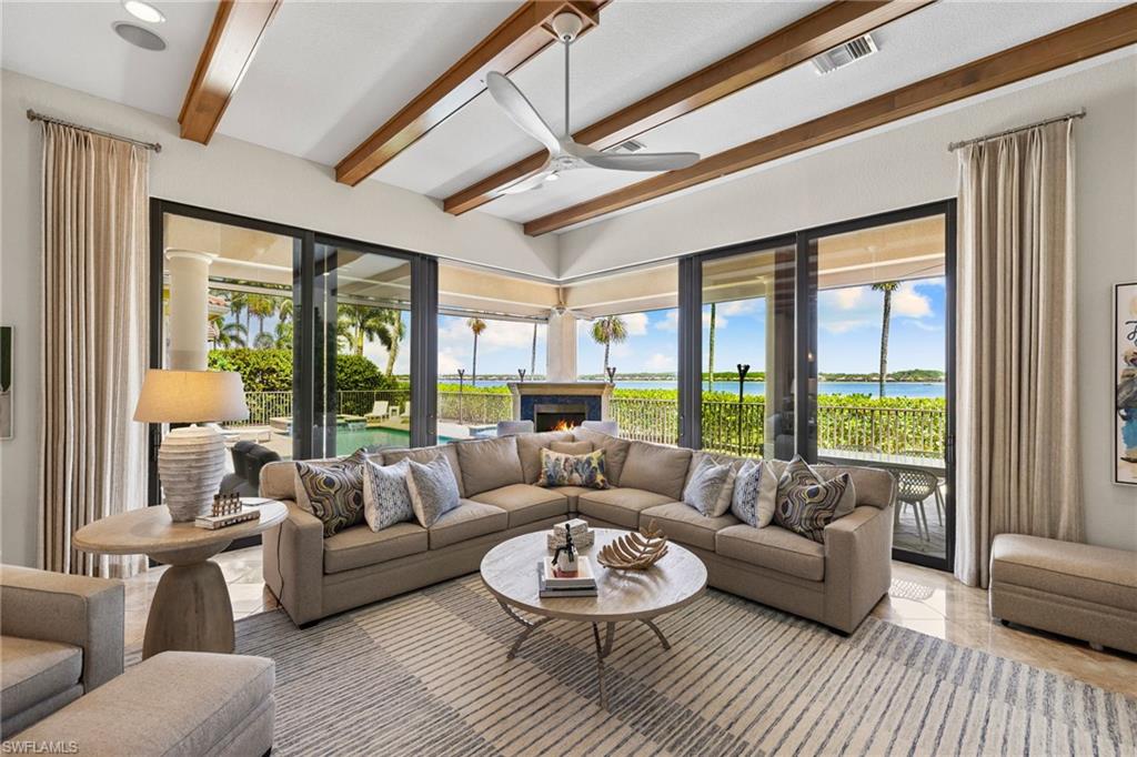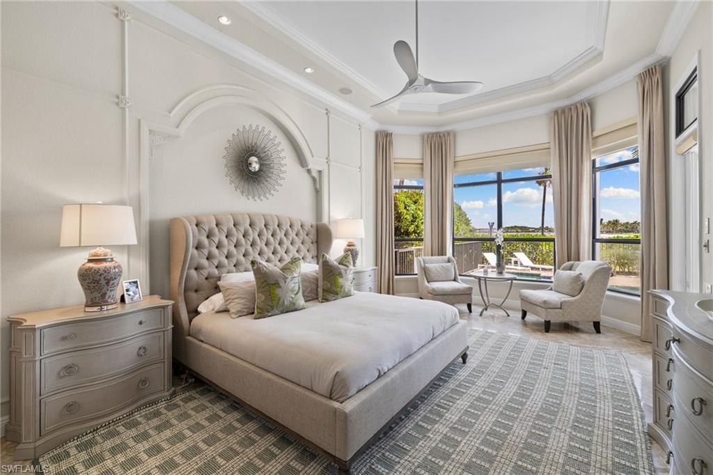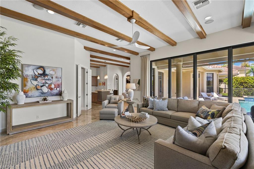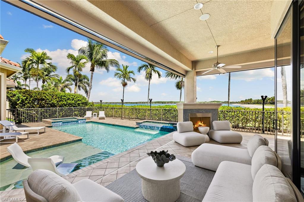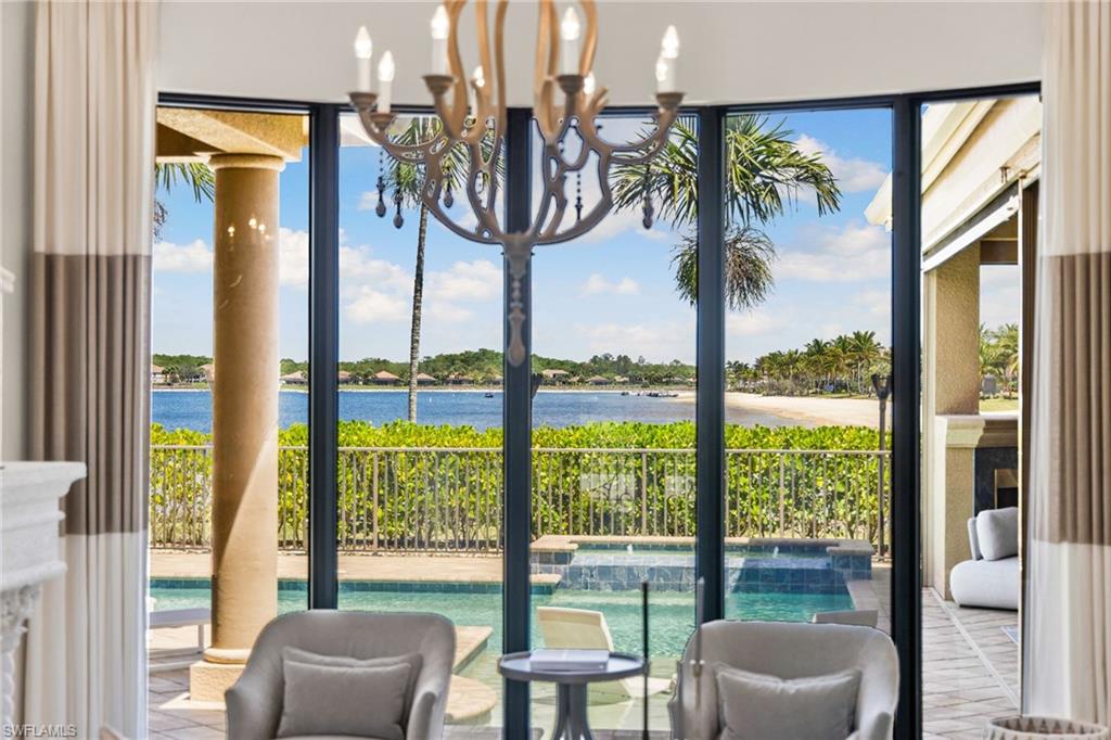 Golf and boating highlight this rare waterfront estate in The Quarry. This custom Arthur Rutenberg estate is perfectly positioned on a .38 acre home site with sweeping views of Stone Lake and the beach. A private dock and boat lift provide direct access to over 500 acres of navigable lakes and waterways, delivering an unmatched boating lifestyle right from your backyard. Step inside through wrought-iron doors and be greeted by picture windows showcasing the forever lake views and an open floor plan designed for entertaining. Highlights include a wet bar and wine bar, a chef’s kitchen with gas cooktop, exposed stained beams, multiple tray ceilings, and pocketing sliding glass doors that blend indoor and outdoor living. Notable upgrades include impact-rated windows and doors, a whole-house water softener, air-conditioned garage, two gas fireplaces, motorized roll-down hurricane and bug screens, tile and wood flooring throughout, and a custom pool with tiki torch ambiance. The Quarry is a gated, resort-style community with something for everyone: boating, championship golf, tennis, pickleball, bocce, multiple dining options, a tiki bar, poolside food and beverage service, a fitness center, and a full social calendar led by an on-site activities director. Golf membership is optional, and a $20 million renovation of the Lake Lodge and Beach Club was recently completed. A pontoon boat is also available for purchase.