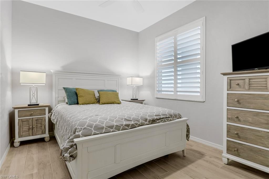 Welcome to your dream condo in the highly sought-after Naples Heritage, a beautifully landscaped, gated, bundled golf community just minutes from 5th Avenue and the beaches! This top-floor unit offers peace, privacy, and panoramic views of the water, golf course, and lush nature preserve. The building includes elevator access, and the condo itself features an open floor plan with durable porcelain plank tile flooring throughout. Stylish updated lighting and ceiling fans add a modern touch, while hurricane-impact windows and Storm Smart hurricane screens on the lanai provide both comfort and security. The kitchen is beautifully renovated with white shaker cabinets, granite countertops, a glass tile backsplash, and newer stainless steel appliances. A charming eat-in nook includes a cozy window seat that looks out over the water and golf course. Custom window shades in the kitchen offer both style and function. The spacious primary bedroom includes a walk-in closet with a built-in safe. The en-suite bath has been updated with a sleek new vanity and a custom-tiled walk-in shower with a frameless glass door. Step out onto the screened lanai and enjoy peaceful views of the water, golf course, and preserve – the perfect spot to unwind. Additional perks include deeded covered carport parking and an extra-large private storage room. Naples Heritage offers a true resort lifestyle with an 18-hole championship golf course, putting green, driving range, renovated clubhouse with pro shop, resort-style pool, tennis courts, pickleball, bocce, and a fully equipped fitness center with trainers and group classes. You’ll also enjoy the convenience of a poolside cabana and bar. More than a home – it’s a lifestyle! Don’t miss your chance to own in one of Naples’ premier bundled golf communities.