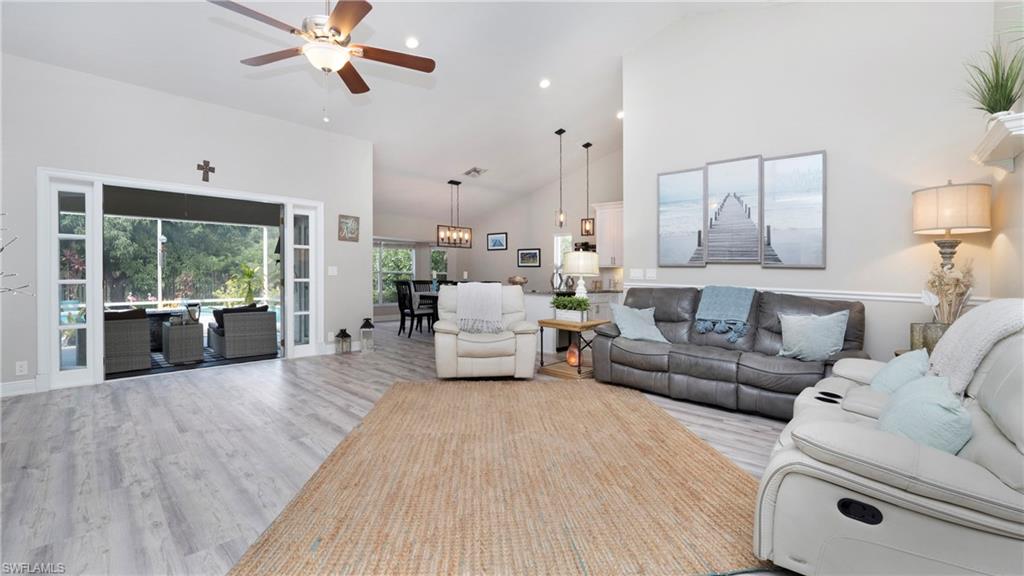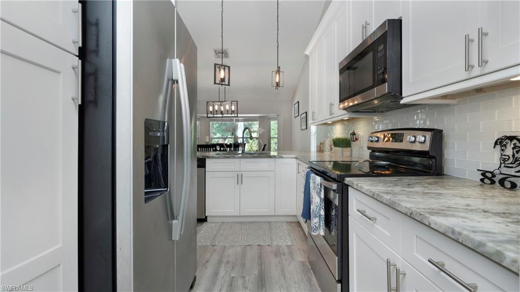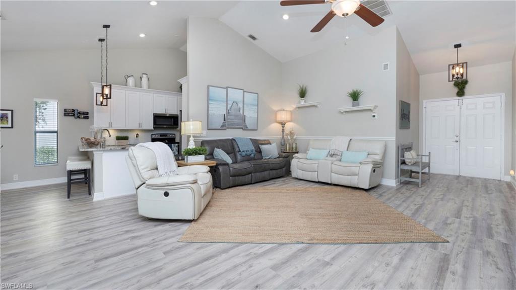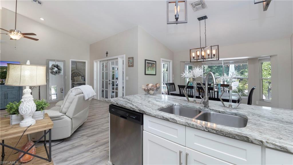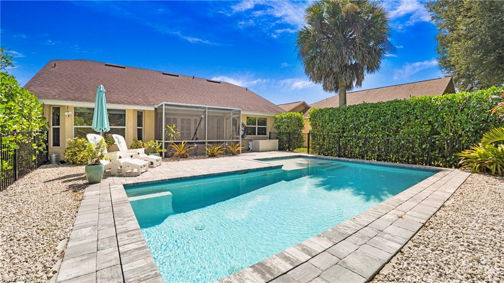 Highly sought after Berkshire Lakes home with a SALTWALTER POOL THATS ONLY 4 YEARS OLD! This 3-bedroom, 2-bathroom single-family home offers 1,587 sq ft of living space and modern upgrades throughout. Renovated in 2019 with stainless steel appliances, lighting, and cabinetry, plus granite countertops in the kitchen and bathrooms. Roof (2019), A/C (2021), LVP floors (2022). French doors lead to a screened lanai and open to a heated pool SALTWATER pool (2022) with a sunning shelf, creating a private backyard oasis. The fully fenced backyard is lushly landscaped for privacy and relaxation. Additional features include a 2-car garage, hurricane shutters and newly blown insulation for energy efficiency. Berkshire Lakes is a pet-friendly community with LOW HOA fees, tennis and pickleball courts, clubhouse, community pool, and walking trails. Conveniently located near Publix, Starbucks, dining, and only 15 minutes to Fifth Avenue South and Naples beaches.