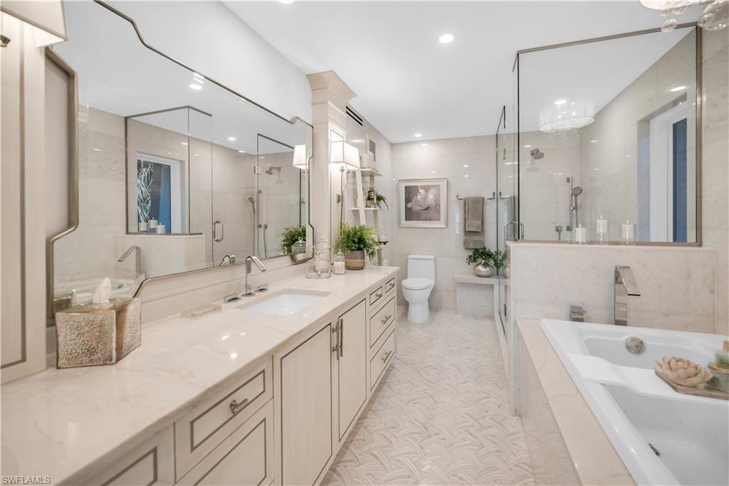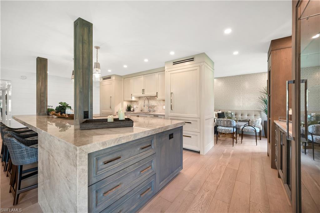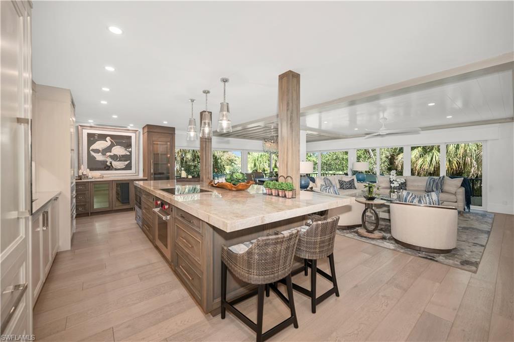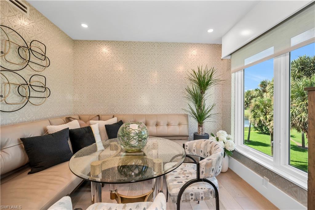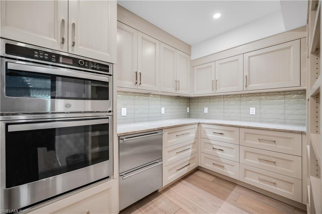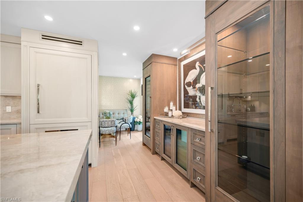 Absolutely Stunning! This top-floor, furnished three-bedroom residence with a wide balcony in an elevator building has been completely reimagined with a tailored renovation that elevates every detail. Wide-plank French oak flooring sets the stage for a bright, modern interior. The chef’s kitchen boasts quartz countertops with a dramatic waterfall edge, a butler’s pantry with double ovens and a warming tray, and exquisite tile inlays. Multiple built-in wine coolers, climate-controlled wine storage, and beverage fridges make entertaining effortless. The open living area showcases an elegant marble entertainment wall with an electric fireplace, custom shiplap accents, and floor-to-ceiling impact-rated sliders framing sweeping views. A cozy breakfast cove with leather seating and power shades offers the perfect place to relax. Every detail has been thoughtfully designed, from custom closets and a built-in desk to designer light fixtures and intricate tilework throughout. Spa-like bathrooms feature seamless glass shower doors, herringbone tile, and luxurious finishes, while the primary suite includes both a soaking tub and a walk-in shower. Refined finishes in every room create a true private oasis that embodies modern elegance. Additional highlights include a fantastic golf cart with a lithium-ion battery and a dedicated golf cart storage area with custom cabinetry. Residents have exclusive access to the newly constructed state-of-the-art 5-star Clubhouse and practice facility, making this property a golfer's paradise. A golf cart and dedicated cart garage are included, conveniently located next to your assigned covered parking. Set within a stunning 200-acre gated community, you'll enjoy beautifully landscaped grounds and mature trees lining the roads. This community offers unlimited golf on an 18-hole Arthur Hills course, as well as five inviting pools, four tennis courts, bocce, croquet, and a dog park. This condo is a true gem, just minutes from the vibrant shopping and dining of 5th Avenue and Old Naples. Purchase of a Wilderness Country Club membership is required and immediately available, offering you an effortless transition into this luxurious lifestyle.