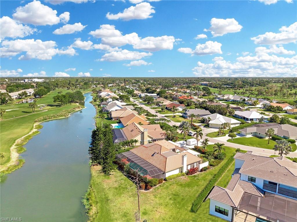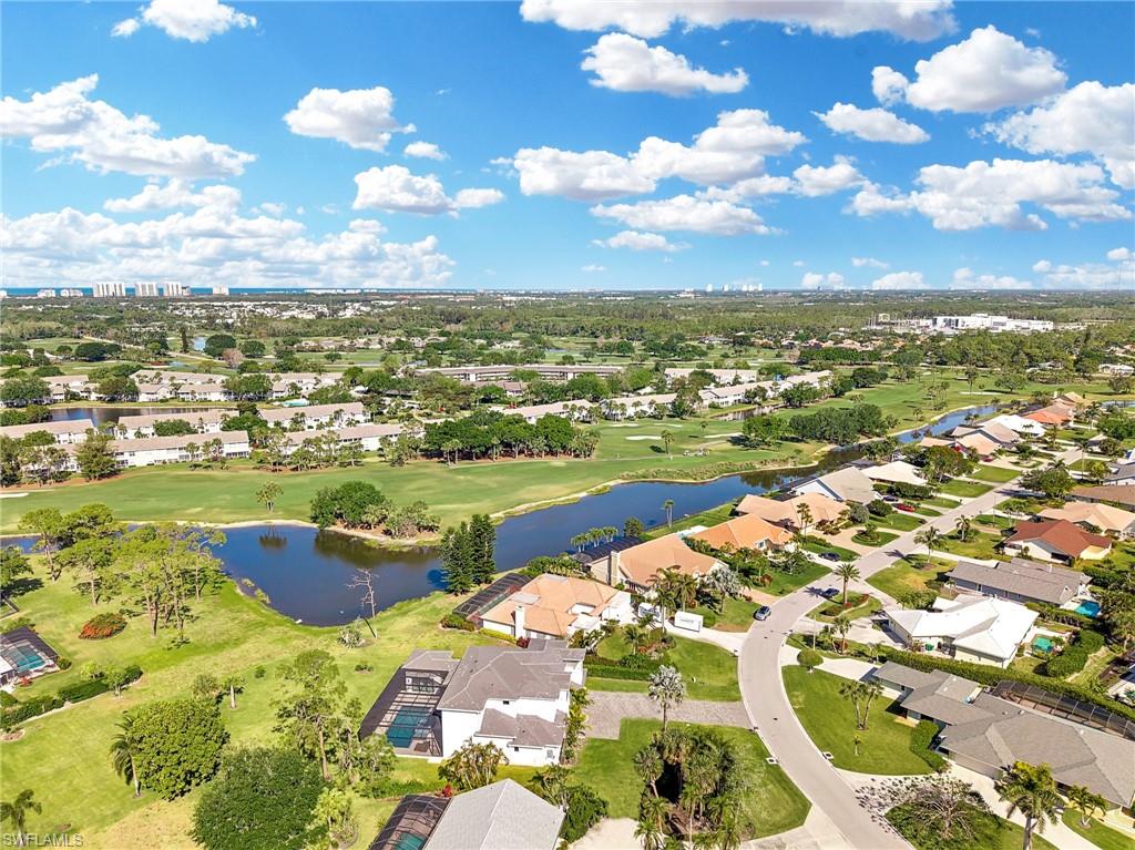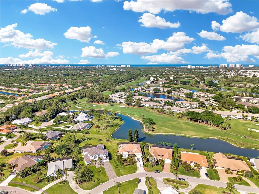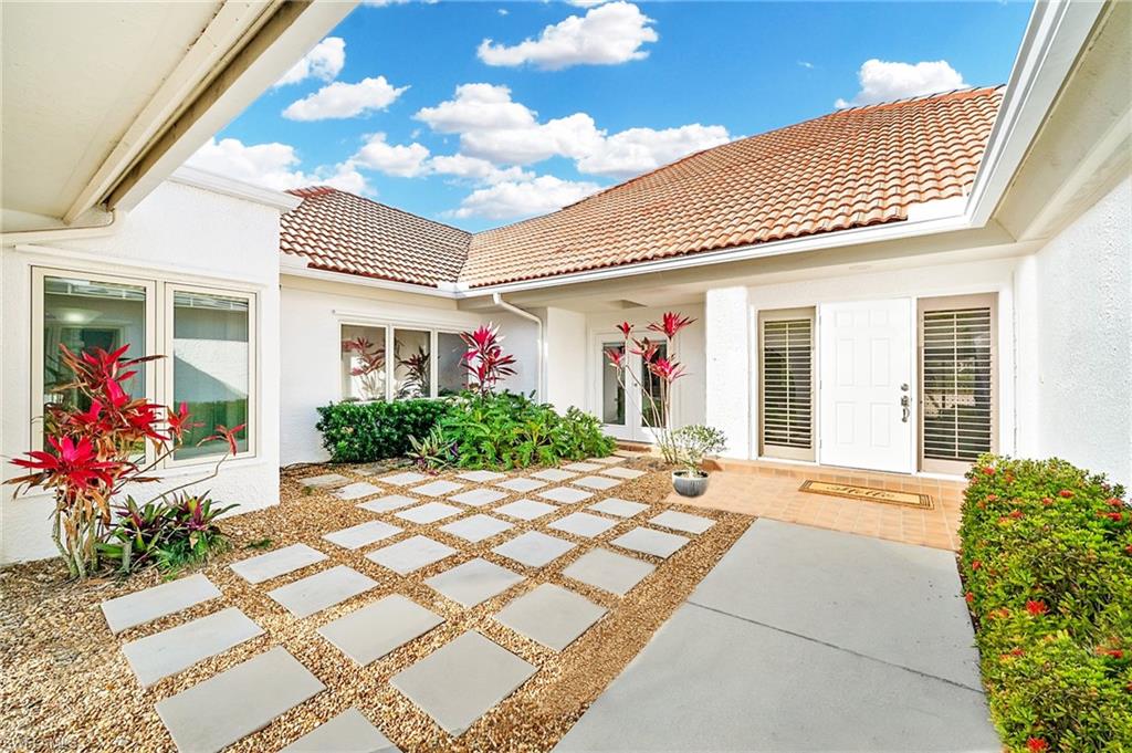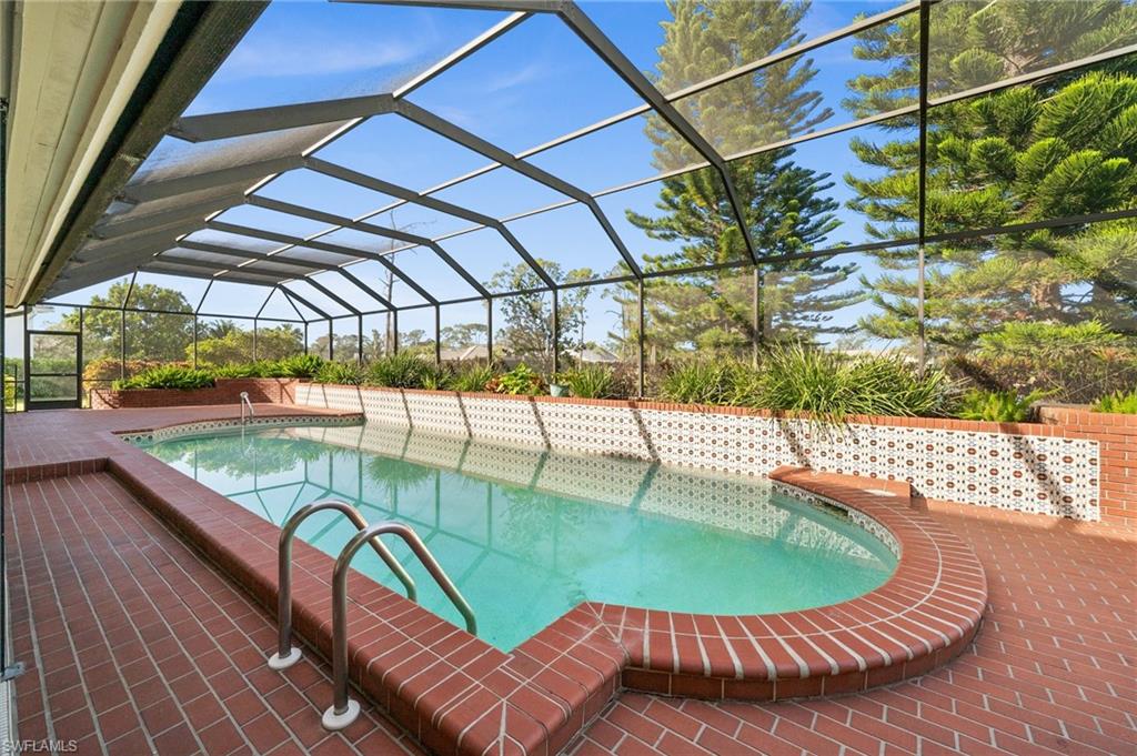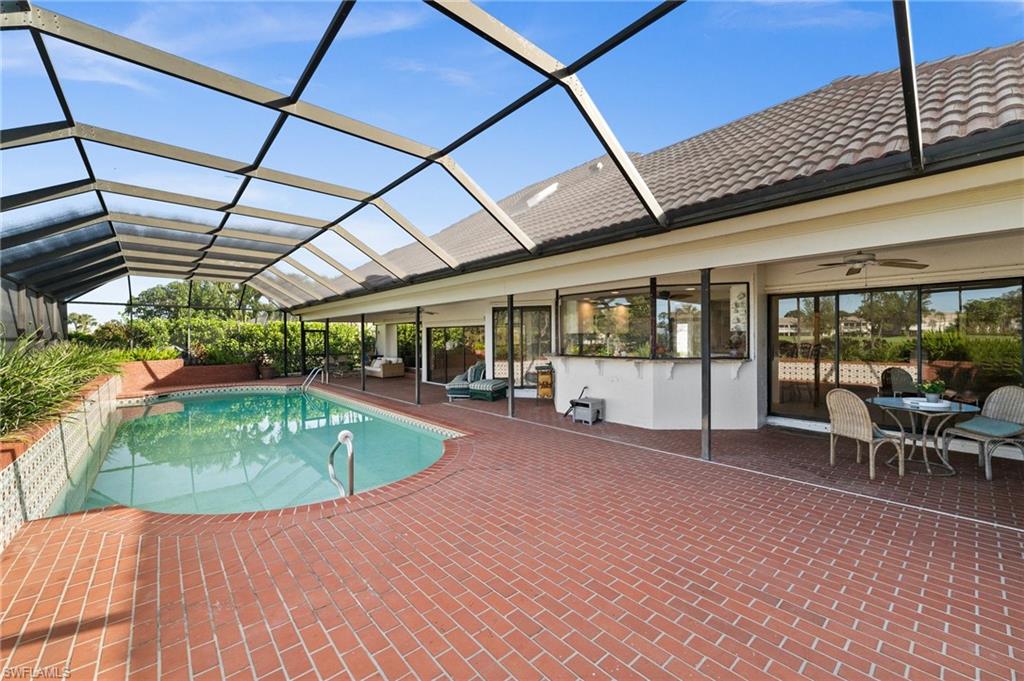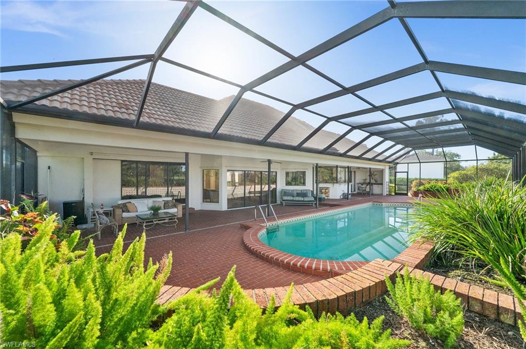 Unique & Rare opportunity .61 over half acre lot with golf & water views!! Take note most lots are only .30. Discover a harmonious blend of sophistication and serenity in this beautifully updated home. Be sure you click on Lifestyle video. The nearly 3,000 sq ft residence boasts breathtaking views of the lake and golf course. The inviting courtyard entrance makes a lasting first impression from the moment you arrive, setting the stage for the elegance that awaits inside. The grand entryway leads to the thoughtfully designed layout that is prime for entertaining and privacy, where every space exudes warmth and intimacy, from the formal living and dining rooms to the inviting family room with a cozy fireplace. A wet bar makes entertaining effortless, while the spacious kitchen inspires culinary creativity. Updates abound with wide-panel maple hardwood floors in every bedroom, custom porcelain and granite tile in the office, fully renovated bathrooms, a brand-new AC, and stylish recessed LED lighting with updated fixtures in the kitchen and baths. Three generously sized bedrooms, 2 1/2 baths and a versatile office space are strategically positioned for optimal privacy. The primary suite boasts a beautifully updated ensuite bath with a freestanding soaking tub, dual sinks, and a separate shower. Outdoor living is just as impressive. A sprawling screened lanai offers multiple lounging and dining areas, all overlooking the oversized pool. Recent updates—including brand-new tinted screening, a paved deck, and lush landscaping—enhance the ambiance of this serene retreat. Ideally located just minutes from Gulf beaches, shopping, and fine dining—with easy access to both US-41 and Livingston Rd. This exceptional home offers the perfect balance of tranquility and convenience. Schedule your private showing today!