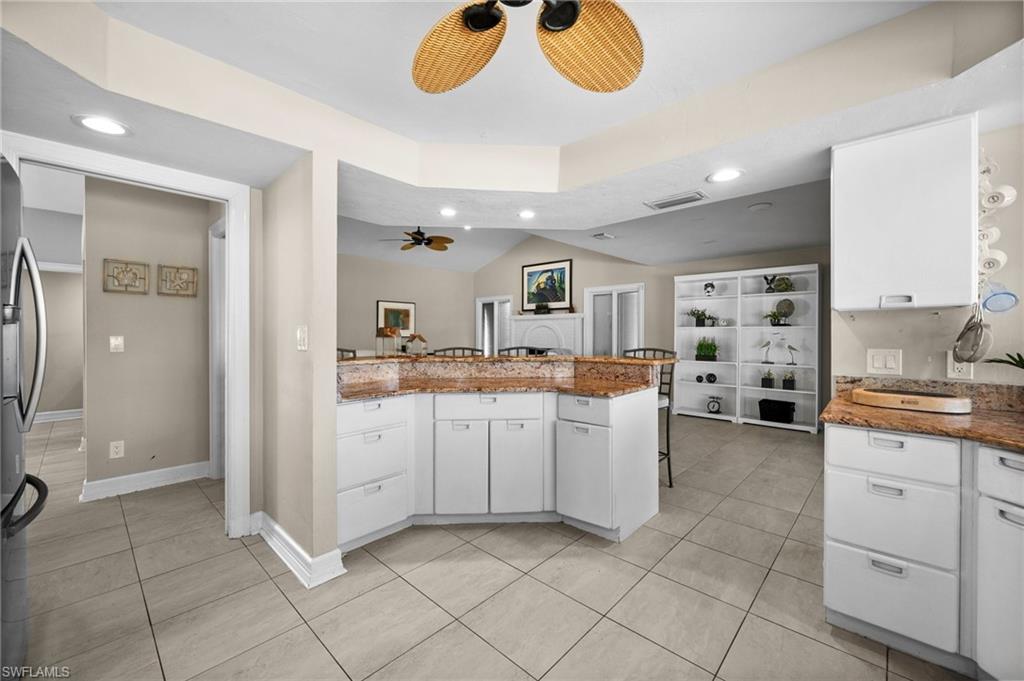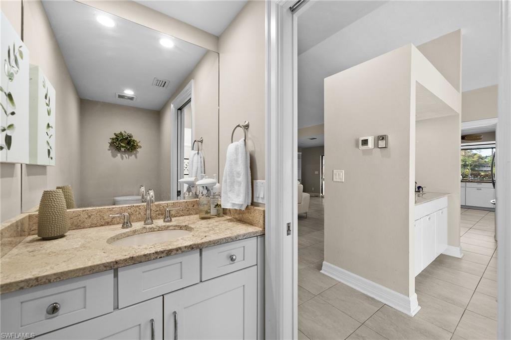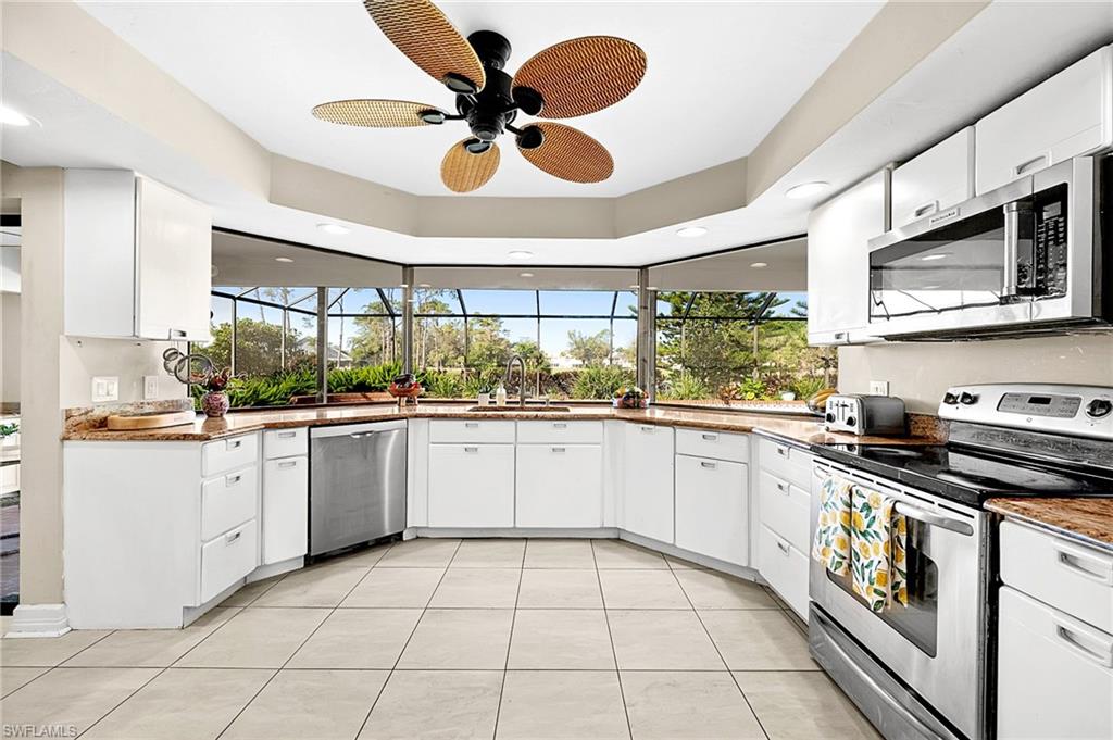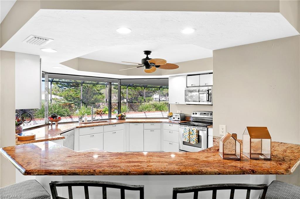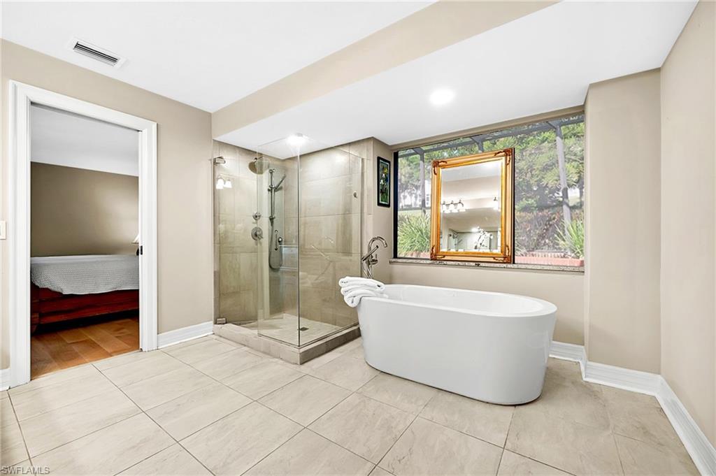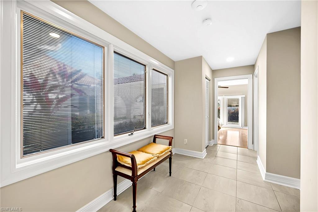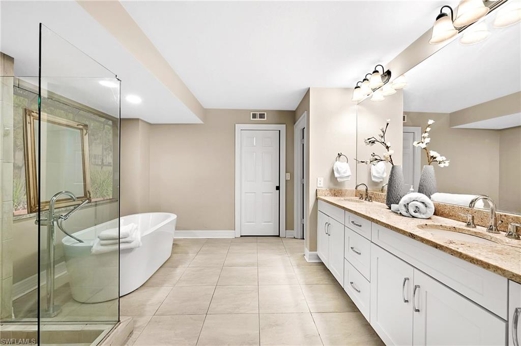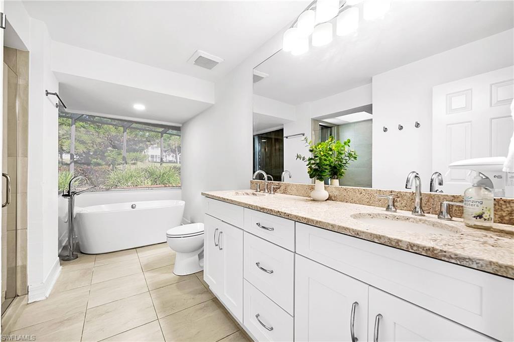 Unique & Rare opportunity .61 over half acre lot with golf & water views!! Take note most lots are only .30. Discover a harmonious blend of sophistication and serenity in this beautifully updated home. Be sure you click on Lifestyle video. The nearly 3,000 sq ft residence boasts breathtaking views of the lake and golf course. The inviting courtyard entrance makes a lasting first impression from the moment you arrive, setting the stage for the elegance that awaits inside. The grand entryway leads to the thoughtfully designed layout that is prime for entertaining and privacy, where every space exudes warmth and intimacy, from the formal living and dining rooms to the inviting family room with a cozy fireplace. A wet bar makes entertaining effortless, while the spacious kitchen inspires culinary creativity. Updates abound with wide-panel maple hardwood floors in every bedroom, custom porcelain and granite tile in the office, fully renovated bathrooms, a brand-new AC, and stylish recessed LED lighting with updated fixtures in the kitchen and baths. Three generously sized bedrooms, 2 1/2 baths and a versatile office space are strategically positioned for optimal privacy. The primary suite boasts a beautifully updated ensuite bath with a freestanding soaking tub, dual sinks, and a separate shower. Outdoor living is just as impressive. A sprawling screened lanai offers multiple lounging and dining areas, all overlooking the oversized pool. Recent updates—including brand-new tinted screening, a paved deck, and lush landscaping—enhance the ambiance of this serene retreat. Ideally located just minutes from Gulf beaches, shopping, and fine dining—with easy access to both US-41 and Livingston Rd. This exceptional home offers the perfect balance of tranquility and convenience. Schedule your private showing today!