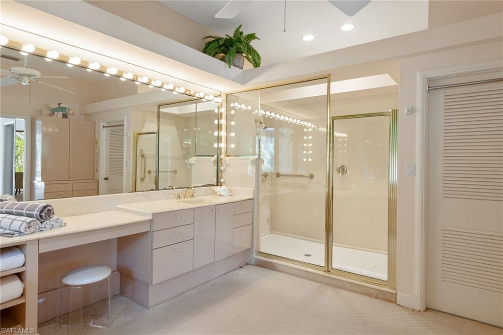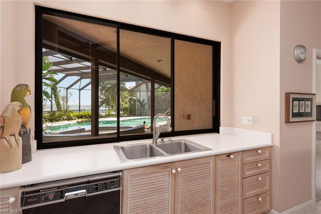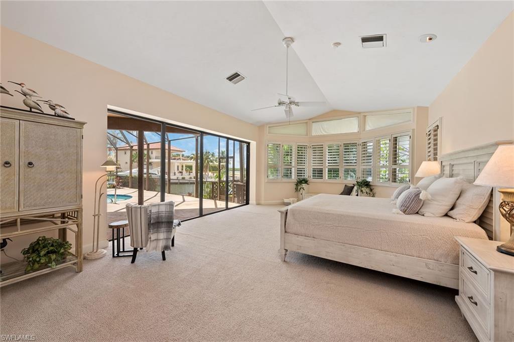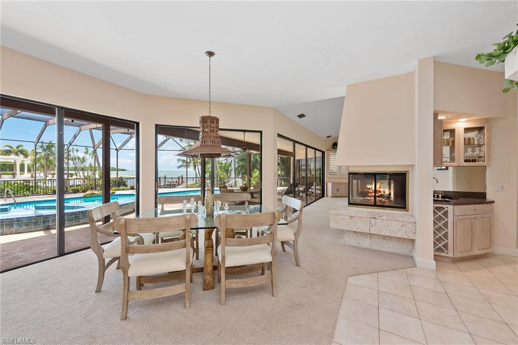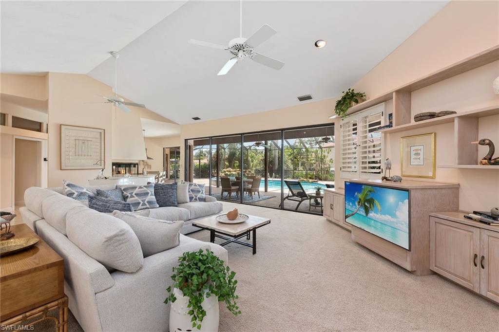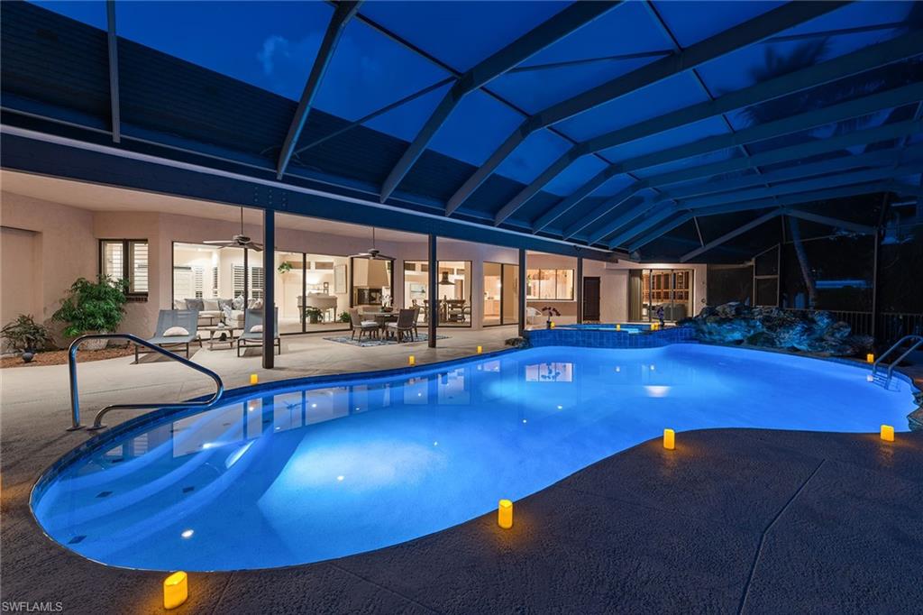 This extraordinary Polynesian-inspired residence, in the prestigious Estates of Marco Island on the island’s desired street, Caxambas Court, represents the pinnacle of coastal living. With 112 feet of waterfront, direct and quick Gulf boating access, and sweeping water views, it captures the essence of the island lifestyle. Set on over half an acre with desirable southern exposure, the home is framed by lush tropical landscaping and welcomes guests with a grand double-door entry and an oversized circular driveway, creating a private and inviting retreat. The split-bedroom floor plan includes three bedrooms, two-and-a-half baths, a den and a three-car garage. Inside, vaulted ceilings, plantation shutters, recessed lighting and expansive windows fill the open living spaces with natural light. The chef’s kitchen is stylish and functional, offering abundant cabinetry, a center island with an electric cooktop, a breakfast counter illuminated by pendant lighting, and a charming built-in bench nook. A large pass-through window above the sink ideally frames the long and wide water views. Pocket sliders open to the dining area and great room, where a fireplace, wet bar, and panoramic vistas create a seamless transition to the lanai for effortless indoor-outdoor living. The owner’s suite is a serene escape, accessed through double doors, and features sliders to the lanai, a cozy sitting area, and two spacious walk-in closets with mirrored hallways. The luxurious en-suite bath includes dual vanities with a makeup counter, a glass-enclosed walk-in shower, and a jetted soaking tub with tranquil tropical views. A guest bedroom used as an office features built-in cabinetry, shelving and water views, with access to an en-suite powder bath that doubles as the pool bath. The second guest bedroom sits adjacent to a skylit bath with a shower-tub combo and glass enclosure. The oversized laundry room provides exceptional functionality, with white cabinetry, a utility sink, hanging rack, built-in desk, storage closet, and GE washer and dryer. The outdoor living space is a showpiece, offering a screened lanai with a heated pool and spa, generous covered seating and dining areas, and breathtaking wide-water panoramas. The newer 2022 corrugated seawall ensures lasting strength and peace of mind. Ideally in the Estates neighborhood, this home provides easy access to award-winning beaches, waterfront dining, boutique shopping, golf, tennis, pickleball, kayaking and cultural attractions such as Marco Island Historical Museum, art center and theater. Close to quality schools and the executive airport, this residence embodies the ultimate in refined island living. The possibilities are endless!