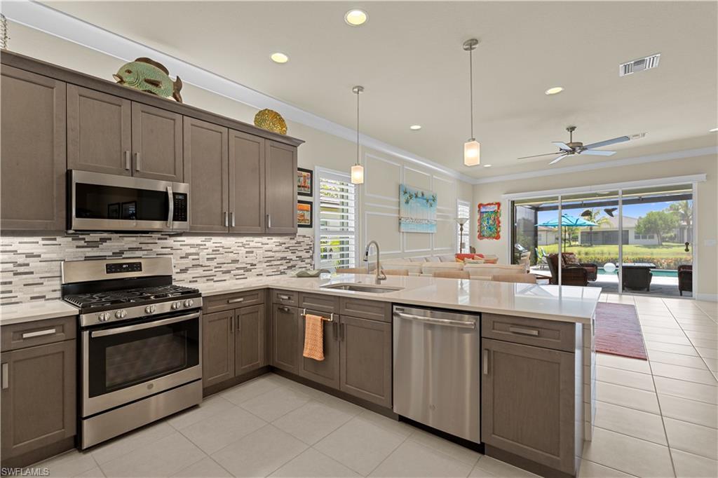 Welcome to your slice of paradise in the heart of Southwest Florida! Discover the perfect blend of elegance and comfort in this beautifully upgraded Tribeca floorplan located in the premier 55+ community of Valencia Bonita. Featuring 3 spacious bedrooms, a flexible den, and 2.5 bathrooms, this home offers upgrades and refined finishes throughout. Step inside to find tile flooring throughout the main living areas, plantation shutters, and custom woodwork that adds warmth and character to the open-concept layout. The gourmet kitchen boasts quartz countertops, stainless steel appliances, a new LG refrigerator, gas range oven, and a large island—perfect for entertaining. The spacious primary suite offers custom closets and a luxurious walk-in shower, while guest rooms provide comfort and privacy. The laundry room is equipped with upgraded cabinetry, and the 2-car garage features an epoxy floor, overhead storage, and a mini-split A/C unit for year-round comfort. For added peace of mind, the home also includes a whole house generator, ensuring uninterrupted power during any outage. Step outside to your private oasis with a heated saltwater pool, travertine pool deck, summer kitchen, panoramic lanai screen, and Storm Smart shutters and screens—ideal for relaxing or hosting guests. Enjoy resort-style living with Valencia Bonita's world-class amenities, including a restaurant with outdoor bar, resort-style pool & spa, fitness center, pickleball, tennis, bocce, and a vibrant social scene. And best of all, you're just minutes from the white-sand beaches of Bonita Springs, top-rated golf courses, charming downtown areas, and an endless variety of dining, shopping, and entertainment. Don’t miss your chance to own a piece of the Florida lifestyle you’ve been dreaming of — this stunning home is ready to welcome you!