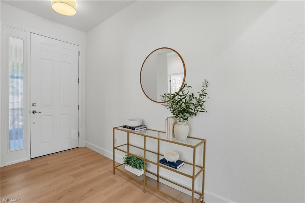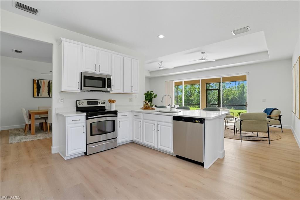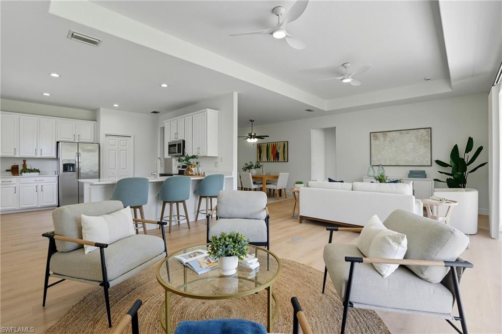 Welcome to your dream home featuring a blend of luxury and casual charm! Just remolded, this stunning 3-bedroom, 2-bathroom residence boasts 1,866 square feet of expertly designed living space, perfect for both relaxing and entertaining. Step inside to discover brand-new luxury vinyl plank flooring that flows throughout the main living areas, offering both durability and elegance. The kitchen is a true centerpiece, featuring gleaming new quartz countertops, a fresh kitchen faucet, brand new dishwasher and garbage disposal—all complementing the freshly painted interior. The spacious master suite is your private retreat, now with updated bathroom cabinets in a crisp white and a sleek new shower glass door. Stay cool and comfortable year-round with a recently replaced A/C unit (2022). Outside, enjoy the southeastern exposure from your patio, ideal for morning coffee or evening gatherings. The home's exterior shines with a freshly pressure-washed roof and new fans and lights installed throughout the house. The garage floor just updated and finished with epoxy, adds both style and practicality. Your peace of mind is assured with manual hurricane shutters, providing protection during stormy weather. Don't miss out on this rare opportunity to own a piece of paradise in Estero. This home combines modern updates with the relaxed Florida lifestyle you’ve been searching for.