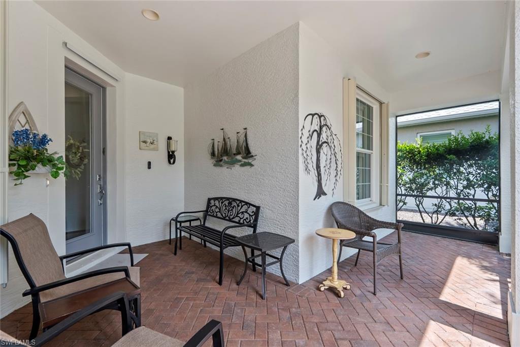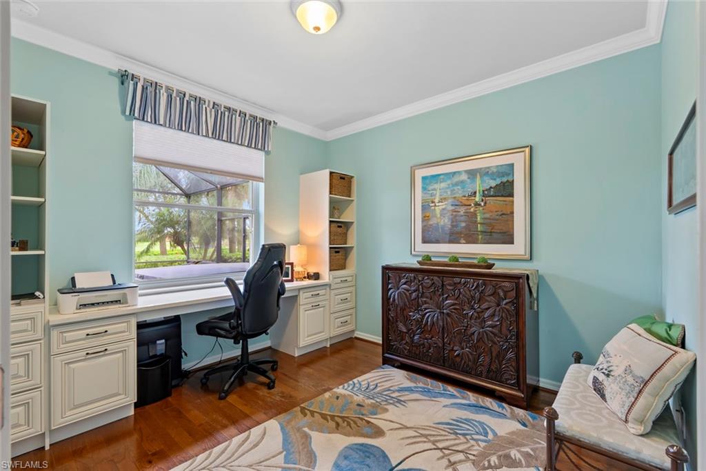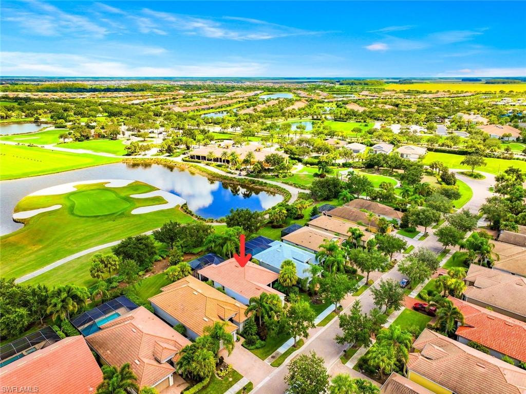 PREMIUM GOLF & WATER VIEW ~ FORMER MODEL HOME ~ TURNKEY with GOLF CART! Located on a private cul-de-sac in the 55+ Del Webb Naples golf community, this former Pulte model home showcases a prime golf course lot with views of the 18th green and water. Featuring the SURREY CREST floor plan, this residence offers 2 bedrooms + den and 2 baths. Step outside to the EXTENDED LANAI, complete with a personal HOT TUB SPA, TRAVERTINE PAVERS, and in-ground recessed lighting, creating the perfect setting for relaxation or entertaining. RECENT UPDATES include fresh interior/exterior paint, LIKE NEW CARPET, newer appliances, and custom built-in cabinetry/desk in the den, plus a charming stone walkway in the backyard. The gourmet kitchen boasts granite countertops, a large island, and abundant cabinetry, ideal for both everyday living and hosting guests. The owner’s suite features a spacious walk-in closet and spa-inspired bath with dual sinks, a soaking tub, and separate shower. A guest bedroom and den provide versatility for overnight visitors, a home office, or creative space. Additional highlights include genuine WOOD FLOORING in the great room, tile in the kitchen, an EPOXY-COATED garage floor with extra storage, and ACCORDION HURRICANE SHUTTERS for added peace of mind. Offered TURNKEY, this home is move-in ready—just bring your suitcase and start enjoying the Del Webb lifestyle. You'll even get your own 2022 4-PASSENGER CLUB GOLF CART. GOLF LOVERS - Panther Run Golf Club offers optional MEMBERSHIPS with premium golf experiences just steps from your backyard. In Del Webb Naples, you’ll enjoy WORLD-CLASS AMENITIES that rival luxury resorts: dine at the Rusty Putter Restaurant, soak in the RESORT-STYLE or LAP POOLS, break a sweat in the state-of-the-art FITNESS CENTER, and play your way through PICKLEBALL, TENNIS, bocce, billiards - even a top-tier GOLF SIMULATOR! Need groceries, church, or a bite to eat? Just hop in your golf cart and cruise into town - Publix and the heart of Ave Maria are just minutes away. This isn’t just a home - it’s a LIFESTYLE UPGRADE in one of Southwest Florida’s most vibrant 55+ communities. Don’t miss your chance to live where fun, fitness, and friendships flourish year-round!
