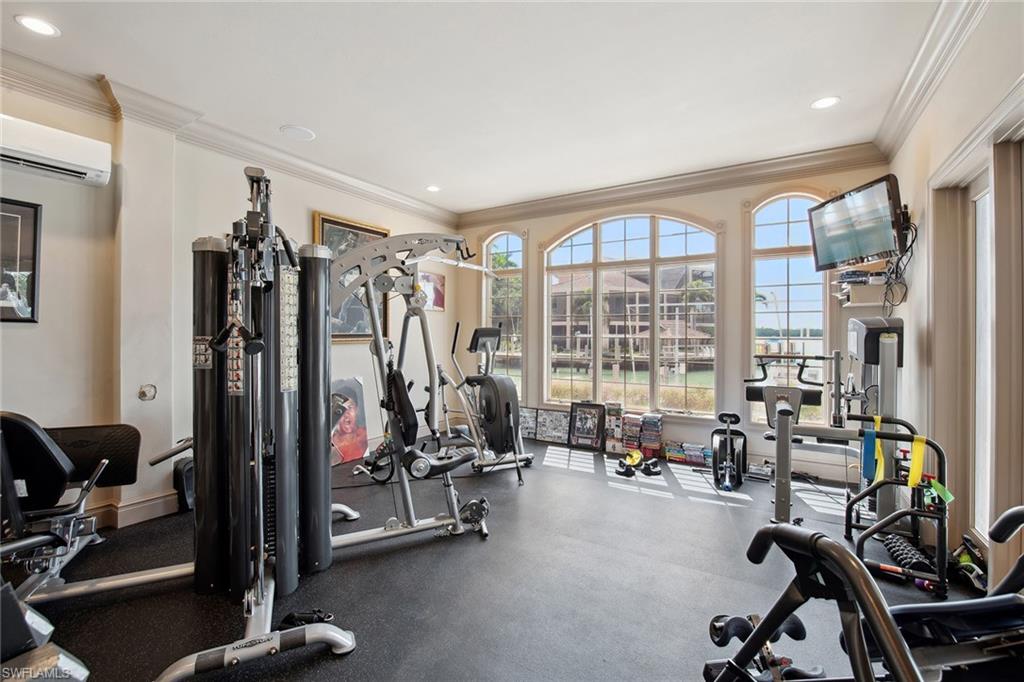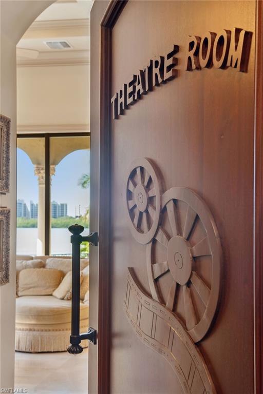 Experience the epitome of Marco Island living in this extraordinary custom-built home, where no detail has been overlooked. With prime western exposure, this three-story residence offers unparalleled views of stunning sunsets over Collier Bay. Encompassing 5,591 square feet of living space, the home is an architectural masterpiece, showcasing exceptional craftsmanship and high-end finishes throughout. Designed with the finest materials, this fully furnished home includes four bedrooms plus a den, four full baths and two half-baths. The gourmet kitchen is a chef's dream, featuring Thermador and Dacor appliances, custom cabinetry, elegant lighting and breathtaking water views. The rich wood tones extend into the cherry-paneled den with Brazilian cherry floors, while the spacious workout room takes full advantage of the open bay vistas. For ultimate relaxation and entertainment, the home offers a billiards room that opens to the pool area, complete with an outdoor fireplace and kitchen, as well as a state-of-the-art eight-seat movie theater with an immersive sound system. The wine room, adorned with hand-crafted designer doors, adds to the home's refined atmosphere. A grand formal dining room with a striking chandelier sets the tone for elegant gatherings. The home's interiors are nothing short of spectacular, with Crema Marfil marble flooring throughout the main areas, including a beautifully curved marble staircase with intricate inlays. Designer hand-carved Bolivian wood doors and custom moldings enhance the home's sophisticated appeal while soaring coffered and tray ceilings create a sense of openness and grandeur. Custom lighting and professional decor further elevate the home’s luxurious ambiance. The expansive primary suite on the main level is a serene retreat with sweeping bay views. It features dual custom vanities, a luxurious Jacuzzi tub, a multi-person shower and two walk-in closets, each with chandeliers. Ideal for entertaining, the outdoor space includes a saltwater pool and spa, a fully equipped kitchen with a gas fireplace, and a boat dock with a 16,000-pound lift, a jet ski dock and lift. A three-car garage provides ample storage and parking. This home is a connoisseur's dream, offering luxury and functionality in a stunning Marco Island setting. It is a rare opportunity to own a piece of paradise where every element has been carefully curated for an unmatched living experience.