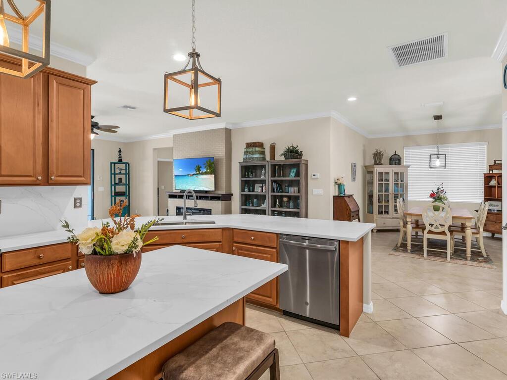 Discover a slice of paradise in this exceptional home designed with the coveted Tivoli open floor plan, offering 4 bedrooms and 3 full bathrooms. Nestled on an expansive estate lot, this residence provides stunning, uninterrupted views of the serene lake, creating a perfect backdrop for luxurious living. The heart of this home is its outstanding, newly renovated kitchen, where sleek white quartz countertops meet a large center island and a convenient breakfast bar. Custom cabinets offer immense storage, making this kitchen a chef's delight. Throughout the home, enjoy numerous upgrades including elegant granite countertops in bathrooms, state-of-the-art GE Profile stainless steel appliances, and stylish angled tile flooring in the main living spaces. The cozy carpeted bedrooms and sophisticated hardwood flooring in the den add a touch of warmth and elegance. Currently serving as a music room, the den offers versatility and can easily transform into a fourth bedroom. Entertain with ease in the spacious dining area and unwind in the family room, featuring an electronic fireplace for cozy evenings. The Primary Bedroom Suite is a sanctuary unto itself, boasting a curbless shower, a relaxing soaking tub, and an impressively large walk-in closet. Two additional guest bedrooms, each with private bathrooms, ensure ample privacy for family and visitors. The grand screened-in lanai is a haven for outdoor enjoyment, featuring an oversized heated pool and spa, with electric hurricane shutters and surrounded by lush landscaping and breathtaking lake views. This outdoor oasis includes a family room area and dining space, enhanced by a remote-controlled storm screen for optimal shade and security. The three-car garage is fully insulated and air-conditioned, equipped with high-output LED lighting, a sink, work areas, and storage cabinets. Located in the charming community of Copper Cove, this home is surrounded by single-family residences and is just moments away from public golf courses, driving ranges, and the stunning beaches of Marco Island. Enjoy easy access to the vibrant shopping and fine dining of Naples, making this home a perfect blend of luxury, convenience, and enviable location.