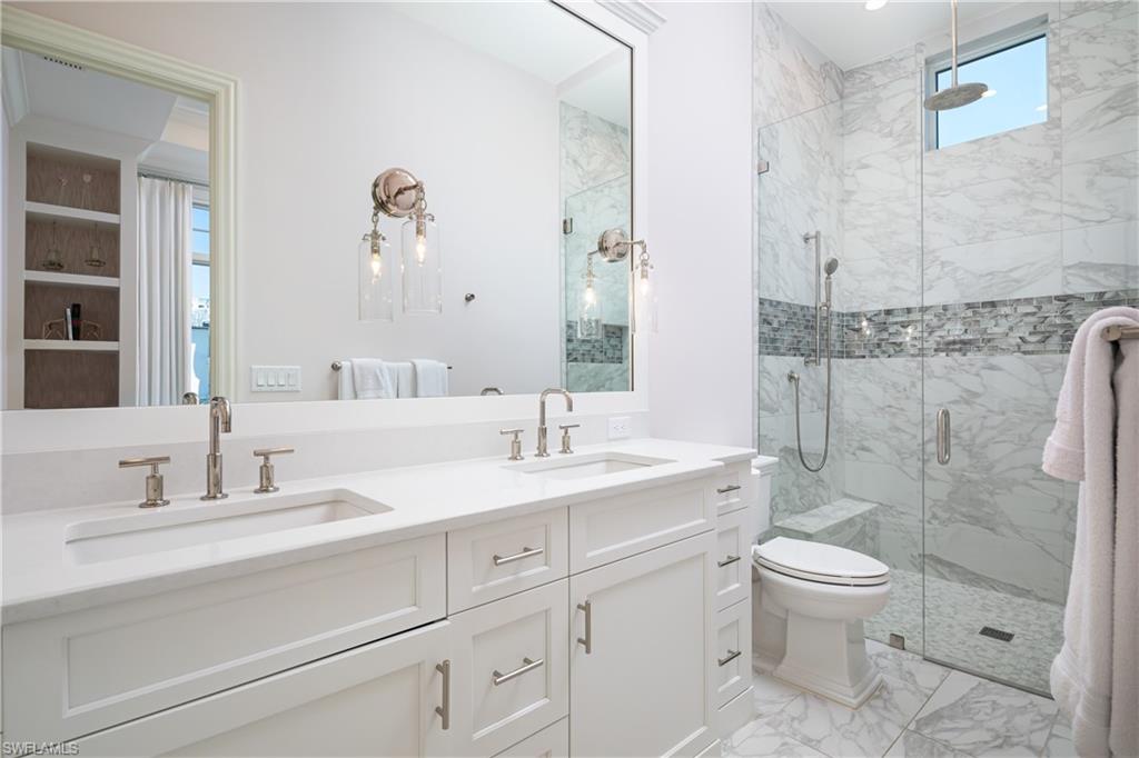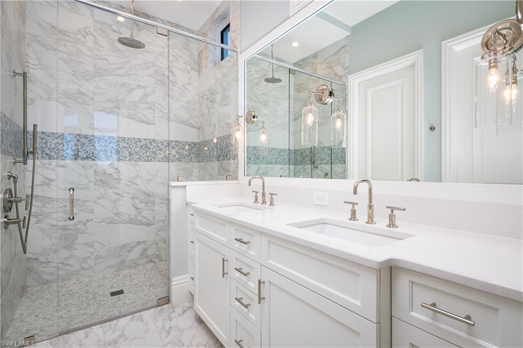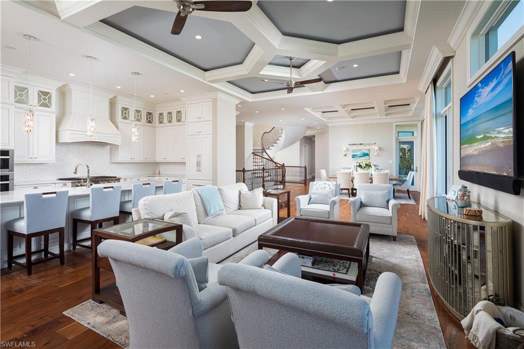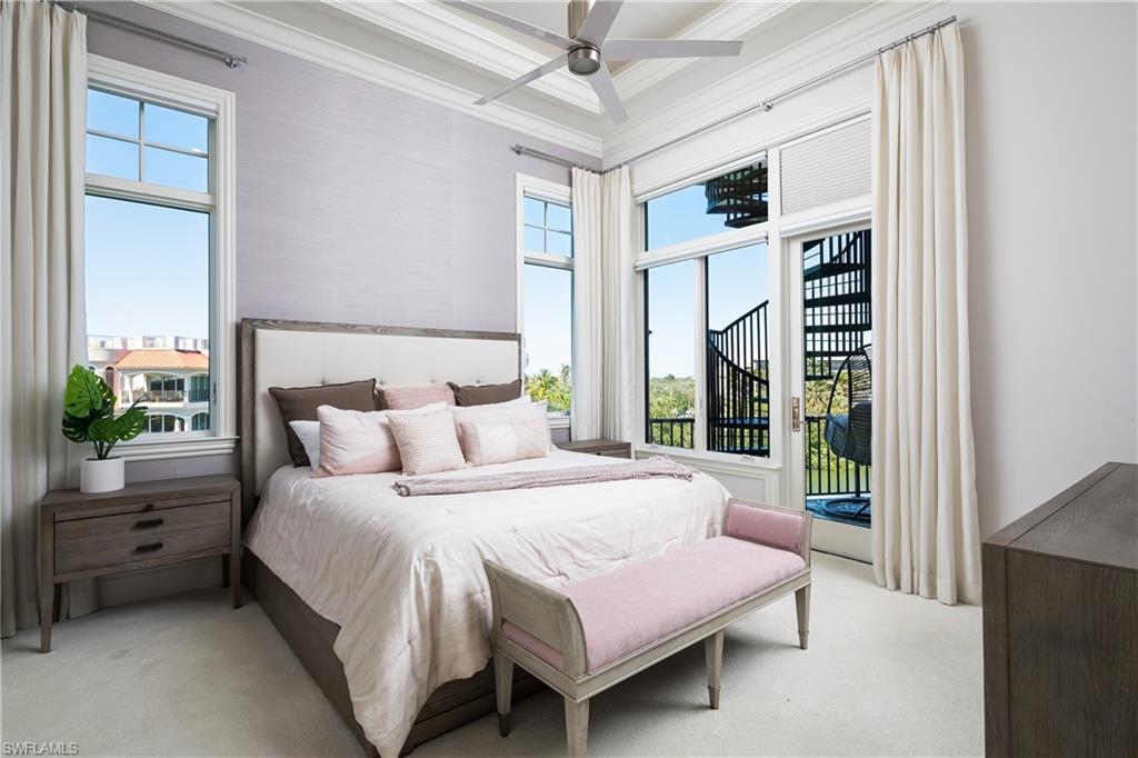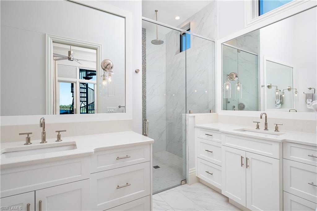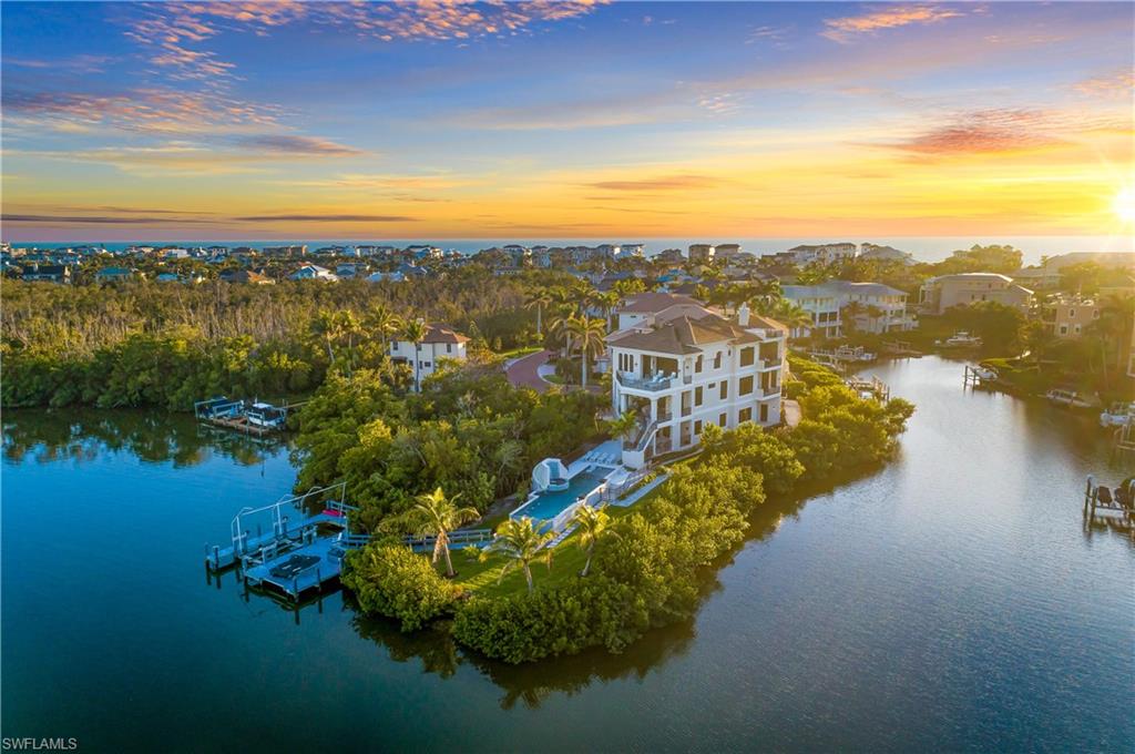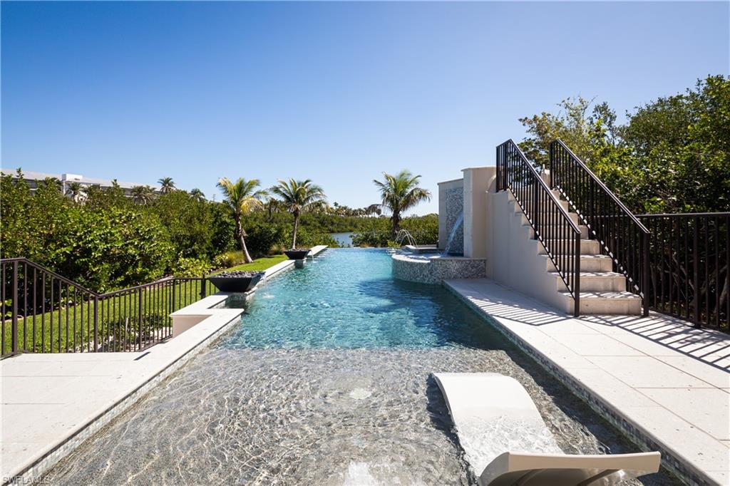 This 2019-Potter Homes built masterpiece is one of the most exceptional homes ever seen in Barefoot Beach. Positioned on one of the most coveted Bayside lots on a private peninsula in the exclusive, double-gated Southport on the Bay, this estate offers an unrivaled approximate 537* feet of wraparound water frontage, providing breathtaking Bay views on three sides and direct Gulf access. A more impressive panoramic waterfront view cannot be found. Crafted by the award-winning Potter Homes, this contemporary masterpiece is built like a fortress with all-concrete construction, hurricane impact windows and doors, and electric hurricane shutters. It is truly the ultimate retreat for beach lovers and boating enthusiasts, offering deeded beach access just a 10-minute walk away and direct Gulf access with no bridges from your 20,000 lb boat lift, along with a double jet ski platform lift. Every detail has been meticulously crafted, from the stunning oak flooring to the elegant coffered ceilings. The expansive floor plan spans 6,269 sq. ft. under air, featuring 6 bedrooms, a den, 6 full baths, 2 half baths, dual laundry rooms, a private elevator, a top-floor sundeck, a 3-car garage, and a versatile lower-level flex space. Step outside and experience one of the most extraordinary resort-style outdoor areas in the Barefoot Beach area. The outdoor space includes a large infinity-edge lap pool with a tanning shelf, water features, a swim-up bar, and a waterslide, all complemented by fire bowls and a fire pit—creating the ultimate space for entertaining. The outdoor patio features electric screens, a cozy fireplace, and a summer kitchen—perfect for al fresco dining and enjoying the serene surroundings. Inside, the chef’s kitchen boasts crisp white cabinetry, quartz countertops, high-end appliances, and multiple dining areas. The primary suite offers an unmatched retreat, complete with an attached office/den, wet bar, fireplace, and a private sundeck overlooking the bay. The spa-like bathroom features dual vanities, a large shower with a rainfall showerhead, and a separate soaking tub. Ascend the spiral staircase to the top-floor observation deck, where you can savor stunning sunsets and panoramic water views. Conveniently located near fine dining, RSW Airport, Mercato, and Waterside Shops, and just 15 miles from the renowned Fifth Avenue in Naples, this home is a true gem in the heart of Southport on the Bay.