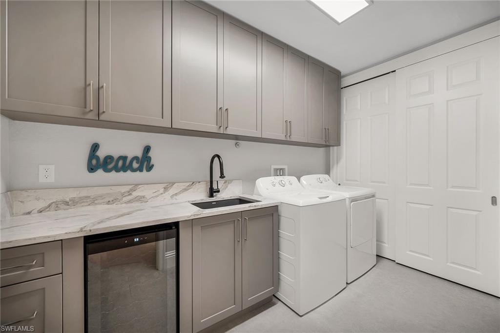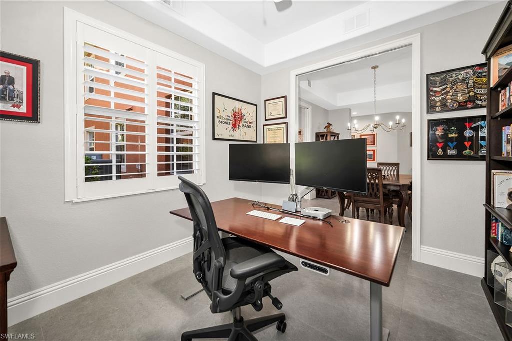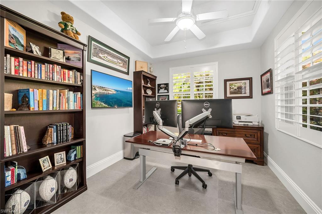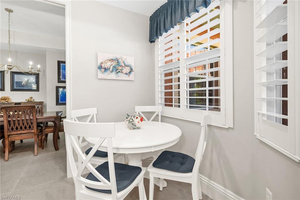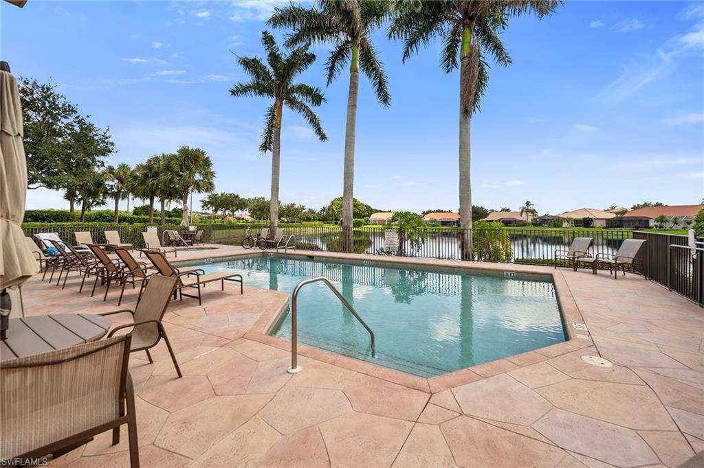 This beautifully updated first-floor residence in Legacy at Lely Resort offers tranquil long lake views and a sophisticated coastal feel throughout. Featuring two bedrooms plus a den, two baths, and a two-car garage, the home is designed for both comfort and style. The screened and covered lanai, finished with extended tile flooring, a ceiling fan, and a newly installed panoramic screen, provides a peaceful setting to relax or entertain while enjoying the serene water views. Inside, the open floor plan is enhanced by tile flooring in the main living areas, recessed lighting and white plantation shutters. The kitchen is a modern showpiece with sleek cabinetry, quartz countertops and backsplash, a center island, bar seating with pendant lighting, a pantry with custom shelving, and a full suite of GE stainless steel appliances. A cozy breakfast nook is framed by windows, while pocket sliders connect seamlessly to the formal dining area. The adjacent den is set up as an office, offering flexibility for work or leisure. The living room opens directly to the lanai, creating a harmonious indoor-outdoor flow. The owner’s suite is a private retreat with bay windows framing sweeping lake views, one walk-in closet and one slider closet, both outfitted with custom shelving, and a spa-like bath featuring dual quartz vanities with a makeup counter, a soaking tub, a walk-in shower with frameless glass and a linen closet. The guest bedroom includes a ceiling fan and an adjacent bath with a beautifully finished walk-in shower, quartz vanity and a frameless glass enclosure. A spacious laundry room adds convenience with a GE washer and dryer, quartz counters, built-in cabinetry, a utility sink and an under-counter wine cooler. Additional features include impact-resistant windows and sliders, a large storage closet with custom shelving, and a two-car garage with epoxy flooring, overhead storage, built-in shelving, and wiring for a portable whole-house generator. Residents of Legacy enjoy membership at The Players Club and Spa, offering resort-style pools, a lap pool, tiki bar, fitness center, spa, fine dining, movie theater, pickleball, tennis, bocce and a vibrant social calendar. Lely Resort also provides two public golf courses and an optional private membership to The Classics, placing world-class amenities right at your doorstep.