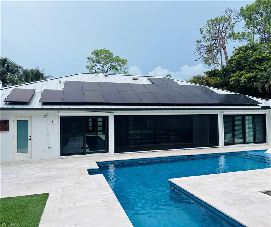 This beautifully redesigned home is nestled on an oversized lot in the highly sought-after Imperial Golf Estates, offering approximately 2600 sq. ft. of living space with 3 bedrooms and 2½ bathrooms. Originally built in 1988, the residence has been fully renovated between 2022–2025 with premium upgrades for modern living and peace of mind. From the moment you step inside, soaring vaulted ceilings and a wall of French doors fill the interior with natural light, creating a bright and airy ambiance. Neutral tones and clean architectural lines provide a timeless backdrop that complements any style of décor. The well-appointed kitchen boasts custom cabinetry, double oven, propane cooktop, serving counter, and solid-surface countertops, seamlessly connecting to a casual dining area. A convenient powder bath serves guests with ease. The master suite is a true retreat, featuring dual walk-in closets, a tray ceiling, and a beautifully updated en-suite bath. One guest suite is oversized and offers a private en-suite bath with direct pool access—perfect for family or visitors seeking privacy. Outdoor living is at its finest with a brand-new oversized pool (lap and regular) with a sun deck, expansive paver lanai, covered patio for shaded entertaining, and lush tropical landscaping that enhances privacy. The spacious lot provides room for children and pets to play, complemented by a new fenced yard and turf. Additional highlights include an elegant circular drive, side-load garage with utility/storage space, and a lanai storage closet. This home is equipped with exceptional upgrades: all new hurricane-rated windows and doors, roll-down shutters for the front and rear, roll-down lanai screen, standing seam metal roof, solar system, new insulation, new A/C with ductwork, dual tankless water heaters (one propane, one electric), new Pex plumbing and fixtures, upgraded cabinetry and lighting, and a 24kW Generac standby generator with a 750-gallon buried propane tank powering the entire home, including the pool. Modern security is in place with a Ring camera system, ensuring peace of mind. Truly move-in ready, this home blends timeless design with today’s most sought-after features—an exceptional opportunity in one of Naples’ most desirable communities. Images feature digital staging for visualization purposes only; property is unfurnished.