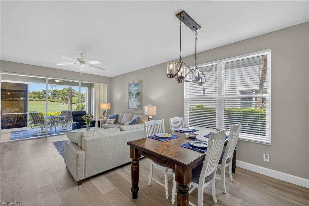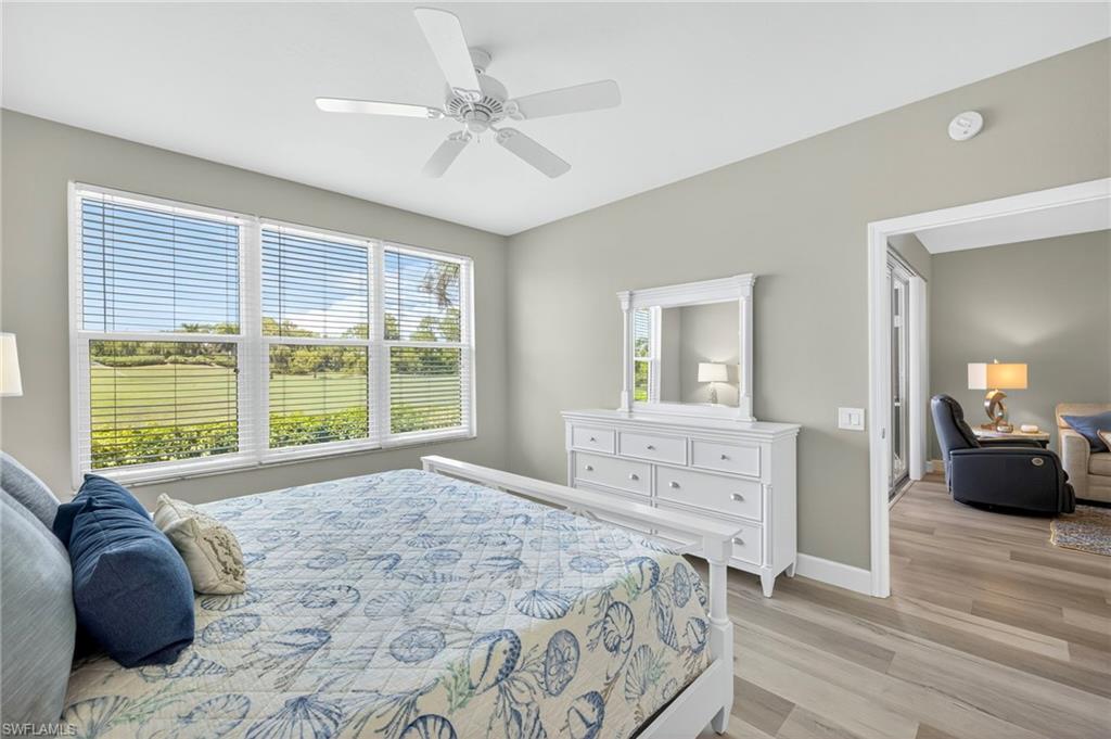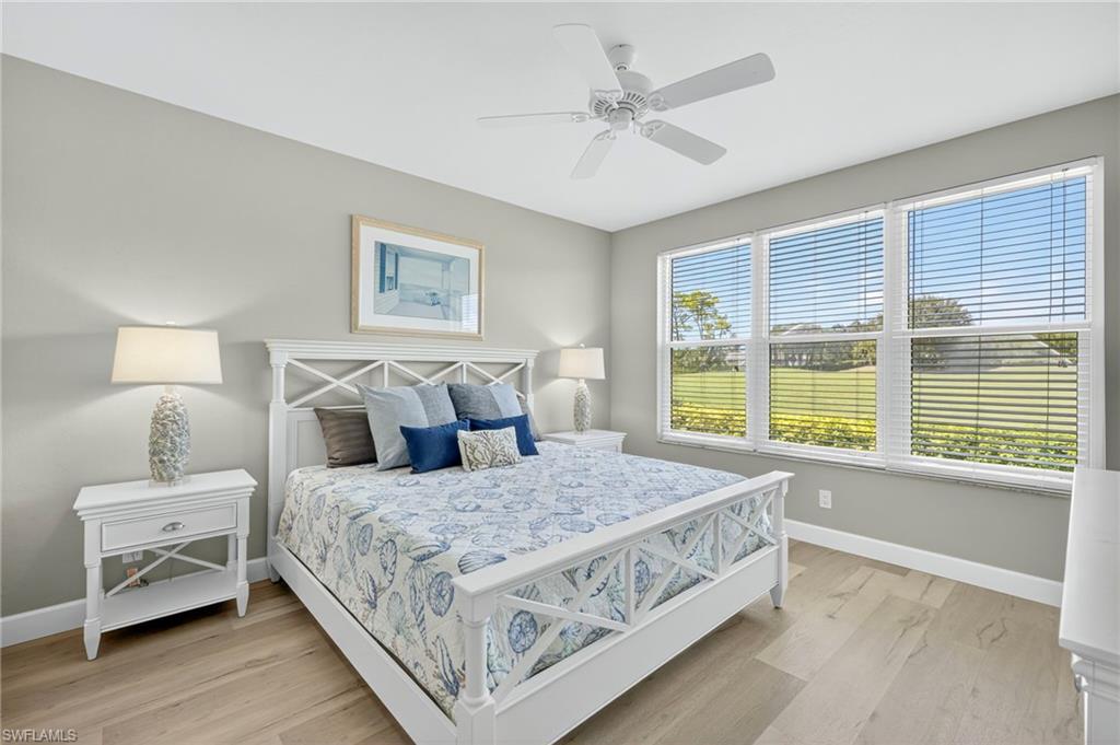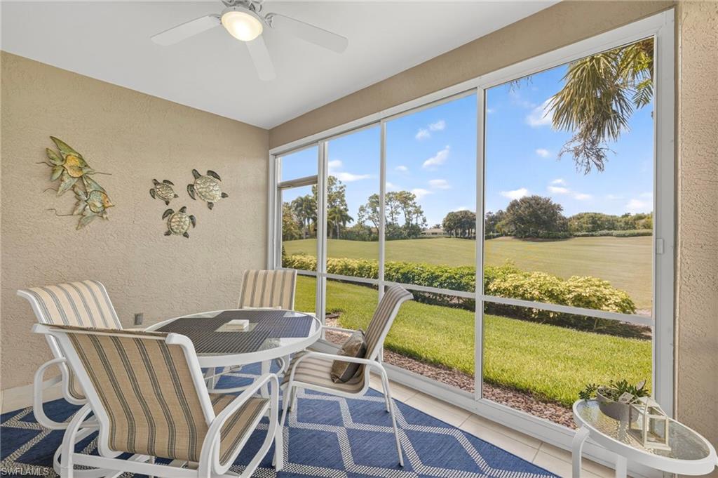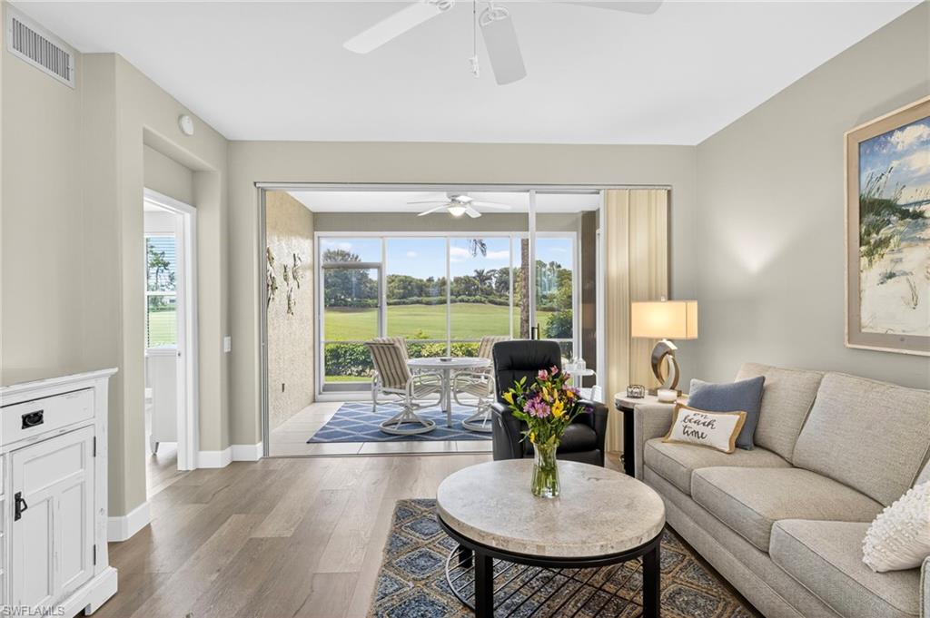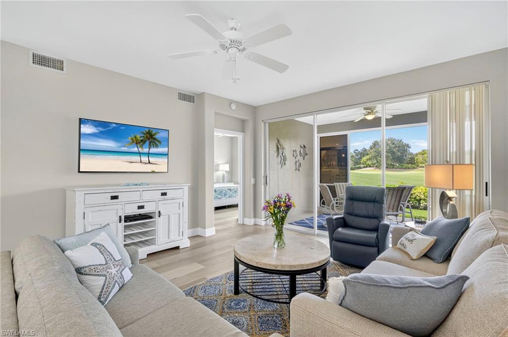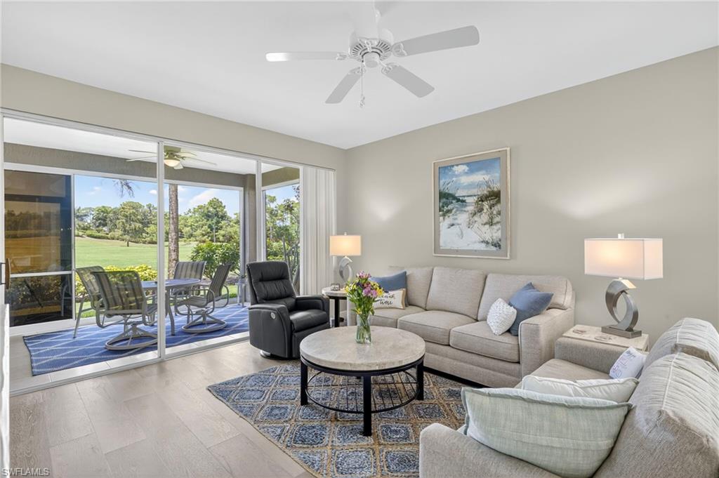 Stunning Renovated 1st-Floor Corner Unit in Spring Run at The Brooks – Sunset Stream Welcome to this beautifully reimagined 2-bedroom plus den residence, fully remodeled top-to-bottom with new finishes and thoughtful design. Overlooking the 8th green of Spring Run's coveted golf course, this home blends modern updates with a comfortable, move-in-ready feel. Inside, you will find quartz countertops, luxury vinyl plank flooring, modern new lighting, mirrors, hardware, and interior doors throughout. The kitchen is equipped with pull-outs in every cabinet including the pantry, LG dark stainless appliances and a built-in bar with wine fridge. The generous living space opens to a lanai with seamless screens and sweeping views of the 8th fairway—a serene backdrop for both relaxation and entertaining. This residence is offered turnkey with designer furnishings, blending style and comfort for a truly move-in-ready opportunity. Added peace of mind comes with a 2019 roof, 2021 impact windows, 2022 Hurricane rated front door with sidelight, 2025 HVAC with UV light and electrostatic filter, and all newer appliances. Beyond the home itself, Spring Run at The Brooks offers an enviable lifestyle with championship golf, vibrant social opportunities, clubhouse dining, tennis, bocce, and fitness amenities—all just minutes from fine dining, upscale shopping, and Gulf beaches. Optional memberships to The Commons Club offer access to private beach facilities, pickleball, dining, and more. Don’t miss this rare opportunity—schedule your private showing today!