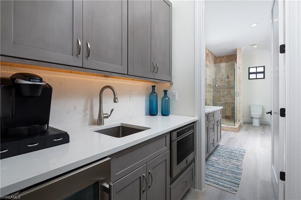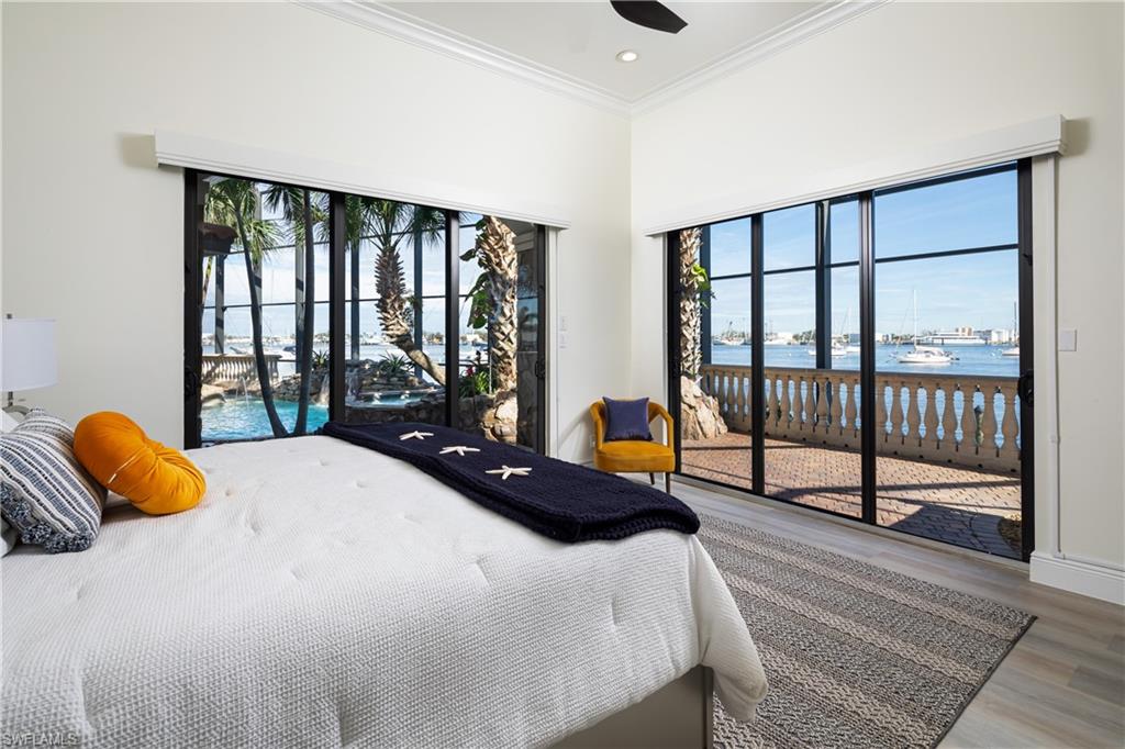 A true Bayfront masterpiece on Estero Island, this estate is like no other. Set on nearly half an acre, this newer built home offers 4,848 sq ft of luxurious living space and 180 feet of prime waterfrontage. From the moment you step through the front door, you’ll be captivated by breathtaking Bay views, with yachts and sailboats gliding by. This home and waterway offers some of the best accommodation in SWFL for large vessels including rare deep-water access to the Gulf of Mexico and a dock with room for a 52-foot yacht, with ample space for a larger boat or potential to extend the dock to accommodate a much larger yacht. Just an 8-minute walk (0.4 miles) to Beach Access 35, it’s a beach and boater’s paradise. This extraordinary residence boasts all hurricane impact windows and doors, a 4-car garage, soaring ceilings, and beautiful travertine and white oak inspired floors. The 2,547 sq ft courtyard, an outdoor oasis, is perfect for both relaxation and entertaining, featuring a saltwater pool with a tanning shelf and water features, spa, grotto-style outdoor shower, cabana bar (with seating for 6+ people, beverage center, sink & icemaker), fire pit, and fireplace. A private fishing pier adds the perfect touch for sunbathing or fishing. The courtyard’s strategic layout separates the luxurious primary wing from the guest wing, offering privacy for both family and visitors. Inside the primary wing, you’ll find a newly remodeled coastal contemporary kitchen, seamlessly flowing into the living room with a modern fireplace & fully pocketing sliders that open to the tropical paradise beyond. The chef’s kitchen is a dream, featuring dual islands, stunning quartz countertops, white cabinetry, white-tiled backsplash, and high-end appliances. Adjacent to the kitchen, an intimate formal dining room surrounded with backlit custom wine racks awaits. The primary suite offers a private retreat, with direct access to an open-air balcony overlooking the water—perfect for morning coffee. A private sitting area with its own fireplace that could also serve as a generous size office or an additional sleeping area and a spa-like bathroom with dual vanities, a separate jetted tub, and a spacious walk-in shower complete the suite. The guest wing is equally impressive, offering three bedrooms, a living area with a fireplace, a kitchenette, and a private open-air balcony. Panoramic water views are visible from nearly every window! Additional features include an 800 lb buried propane tank and electric interior shades. This exceptional property is ideally located on Estero Island, walking distance to top-tier restaurants and shops. Palermo is a prime street with multiple luxury new construction homes underway. Experience the pinnacle of luxury bayfront living in this spectacular home.