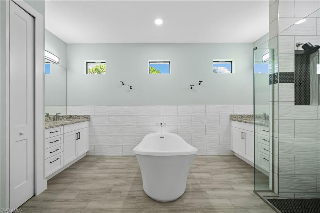 BETTER THAN NEW - This newer construction, Southern Facing POOL home features attractive upgrades and is move-in ready with upgraded pool/sundeck, fully fenced with privacy landscaping and cordless blinds and beautiful window treatments. Could be purchased turnkey ready for seasonal/airbnb rental or a great full time residence. A standout feature on this home is the fully integrated Tesla solar roof - FPL bill of $25-30 a month with NO LEASE FEE. Huge savings even with the pool heater running! Inside features vaulted ceilings, ample natural light, great room floorplan and large island for entertaining. Porcelain wood-look plank tile runs throughout the entire home. The kitchen boasts white shaker cabinetry, granite countertops, and stainless steel appliances. All windows and doors are high impact hurricane rated and extremely energy efficient as well. The master en-suite is a retreat with double walk in closets and a dream bathroom with statement making floating tub and separate shower, with dual sinks and extra linen storage. The outdoors are a great escape, with oversized covered area spacious enough for lounging and dining spaces, custom wood ceiling, upgraded salt water pool with sun deck and pool heater, and a bronze aluminum fence. Even a built in dog door for your furry friend from the screen cage to the spacious yard. Three additional large guest bedrooms with room for king beds complete the space. Property is high and dry and faced no flooding during Ian or any storm! This community is prime for flexible rental policies as well as full time living. Centrally located a mile to Coconut Point, the new Ritz Carlton Residences and waterfront dining/shopping boardwalk, as well as a close drive to popular amenities and 20 min to RSW Airport. SELLER FINANCING AVAILABLE - 5% INTEREST WITH 25% DOWN - 3-5 YEAR BALLOON - CANT BEAT THESE TERMS!!