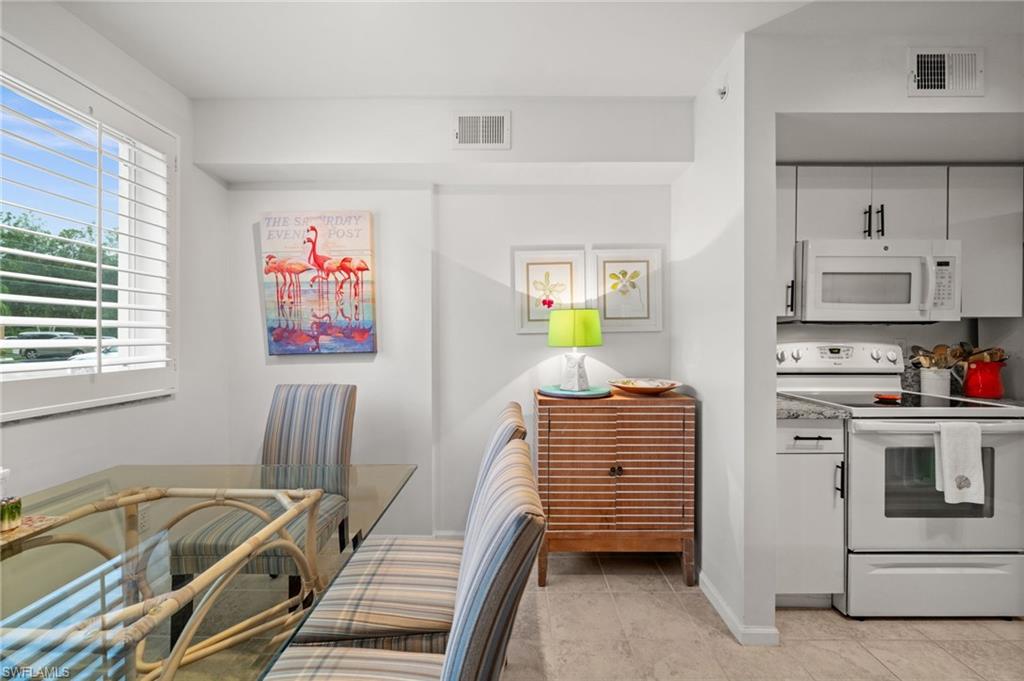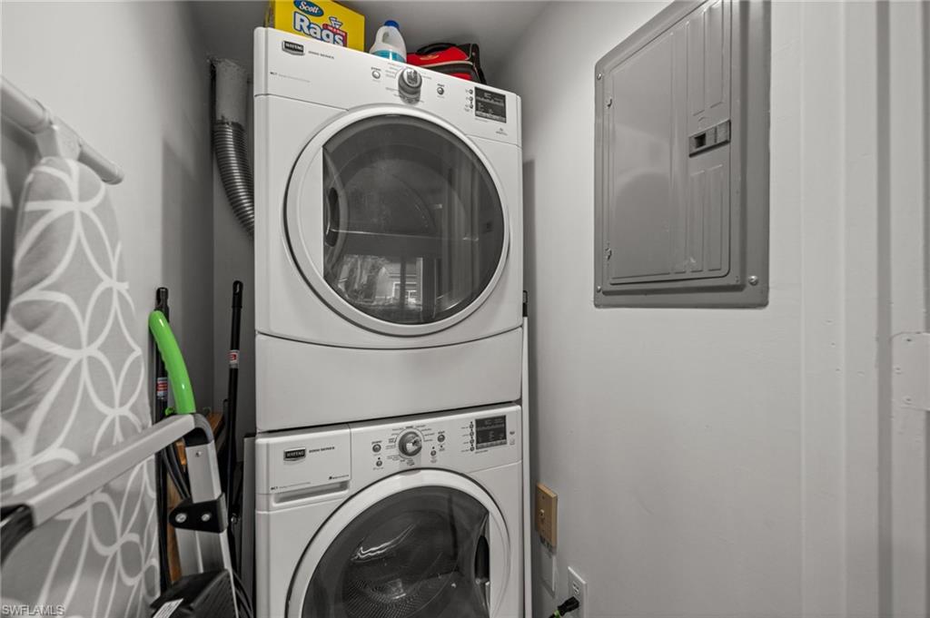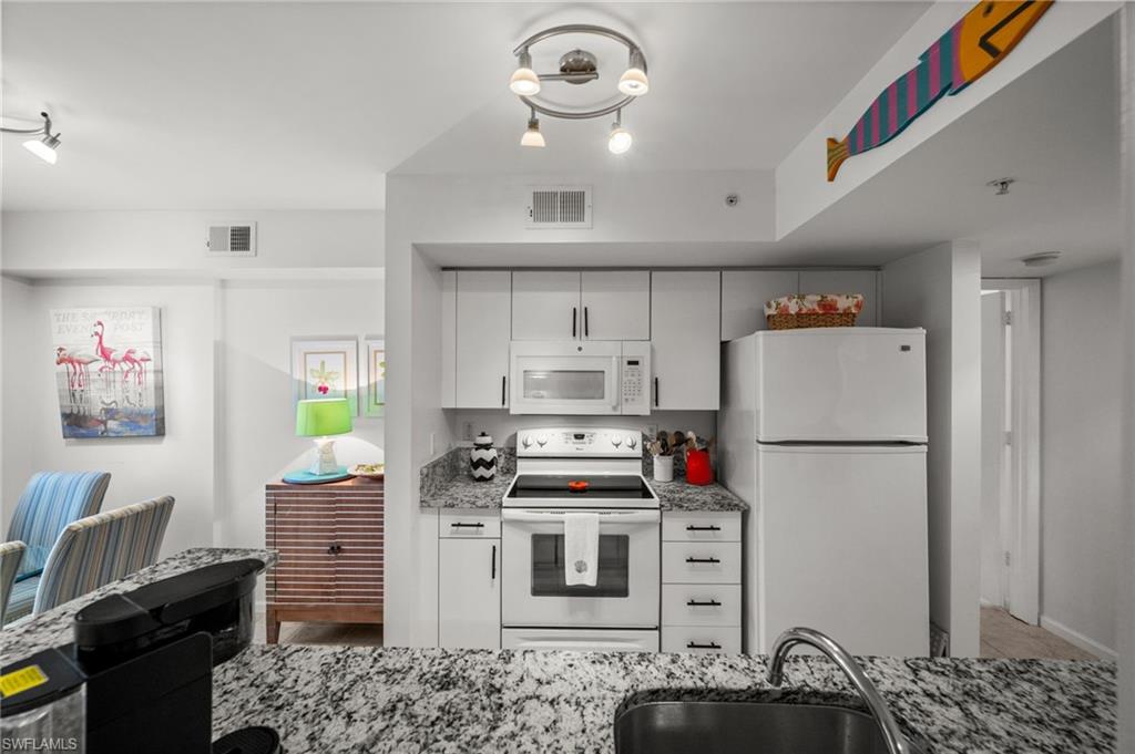 Welcome to this sun-drenched 1-bedroom, 1-bathroom condominium, perfectly located on the first floor of a well-kept community. Fully furnished and thoughtfully designed, this move-in-ready home offers a seamless blend of comfort, style, and convenience. The spacious open-concept living-dining area features plantation shutters and large windows. The upgraded kitchen is a standout with granite countertops and comes fully equipped with all the essentials. The inviting bedroom with a large window adorned with plantation shutters offers generous closet space and its own private vanity area - perfect for extra storage or personal getting-ready space. Washer and dryer in-unit add everyday convenience. Conveniently located near Naples' stunning beaches, vibrant downtown shopping, and dining destinations, this property combines luxury, and accessibility. Napoli residents are treated to an array of resort-style amenities. With no stairs to navigate, a host of amenities at your fingertips, and low HOA fees, this condo is a rare find!
