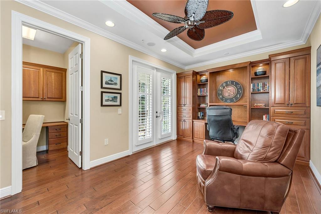 Enter into refined coastal living at Terzetto in The Colony at Pelican Landing, where privacy, space and luxury come together seamlessly. This rare three-bedroom plus den, 2.5-bath residence lives like a single-family home with 2,656 square feet of thoughtfully designed living space for ultimate tranquility. Arrive through your private elevator and enter an open-concept floor plan where the living, dining and kitchen flow effortlessly, ideal for everyday living and entertaining. A stylish wet bar with wine refrigerator enhances the entertaining experience, while upgrades throughout include custom office built-ins, crown molding, enhanced electrical features and a Custom primary closet system. The den offers custom built-ins and its private lanai, creating a versatile retreat for work or relaxation. The spacious primary suite and split guest accommodations ensure comfort and privacy for all. Enjoy serene mornings or sunset evenings on the expansive main lanai with peaceful golf course views, complete with hurricane-rated storm protection. The condominium also features impact windows and doors. The private two-car garage, finished with epoxy flooring and custom storage, adds convenience and function. Living in Pelican Landing means access to an exceptional lifestyle such as an attended fitness center, pickleball, tennis, bocce, sailing, kayak parks and a private beach pavilion. Colony residents also enjoy exclusive dining at The Bay Club, while two private golf clubs are available for separate membership. This residence offers not just a home, but a way of life - luxurious, secure and ideally tailored to Southwest Florida's sought-after lifestyle.