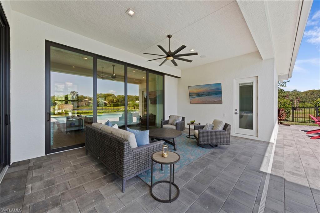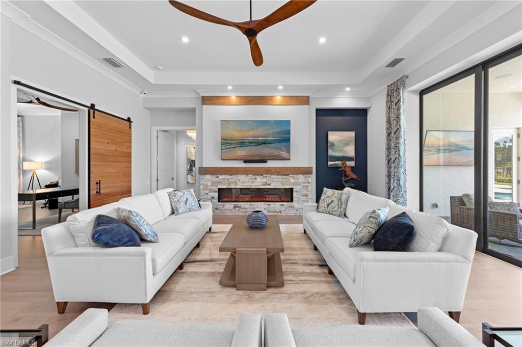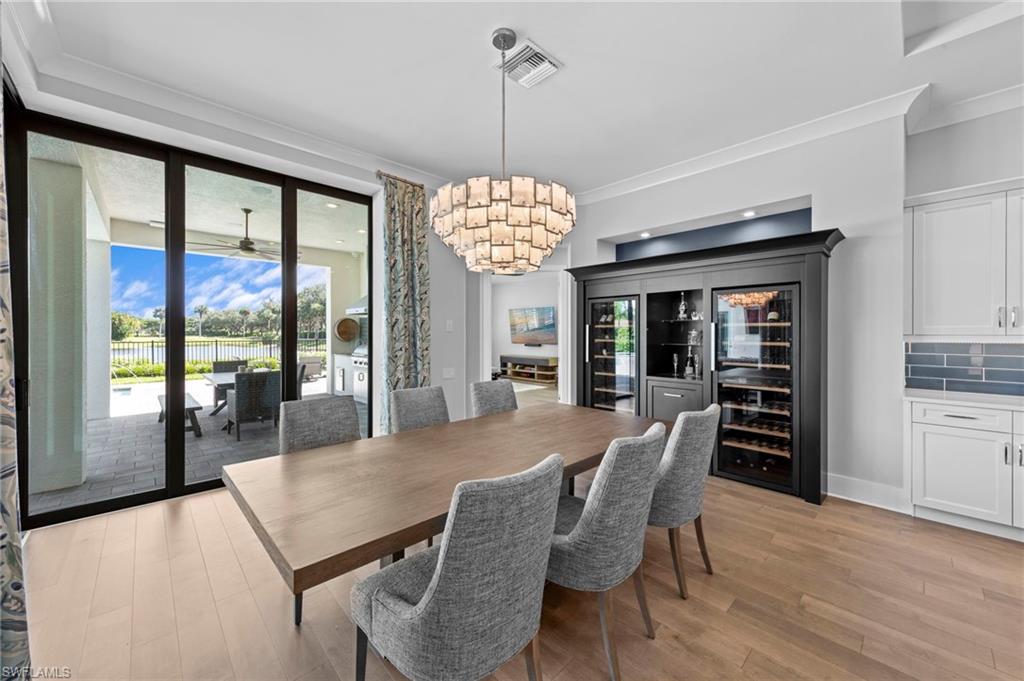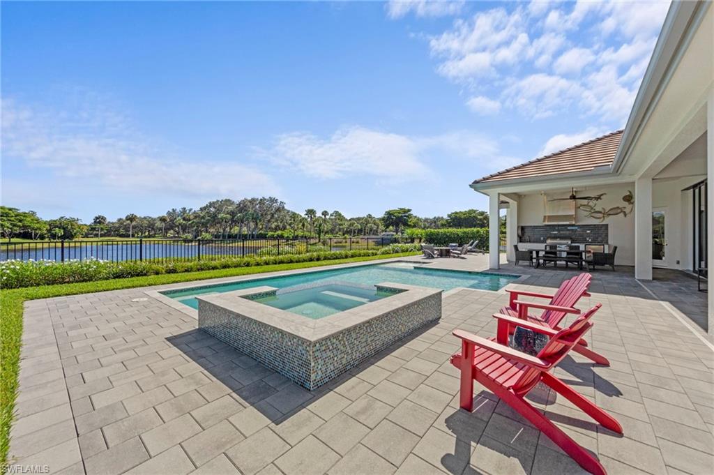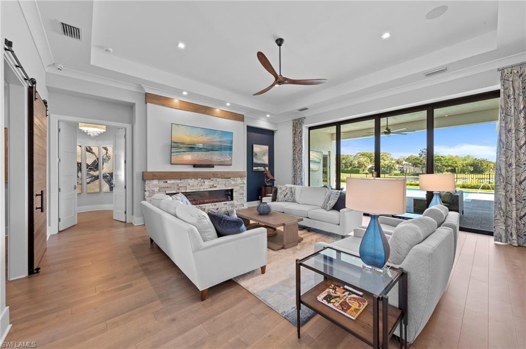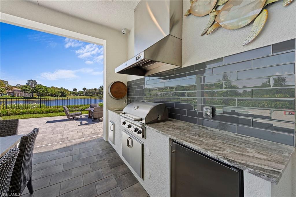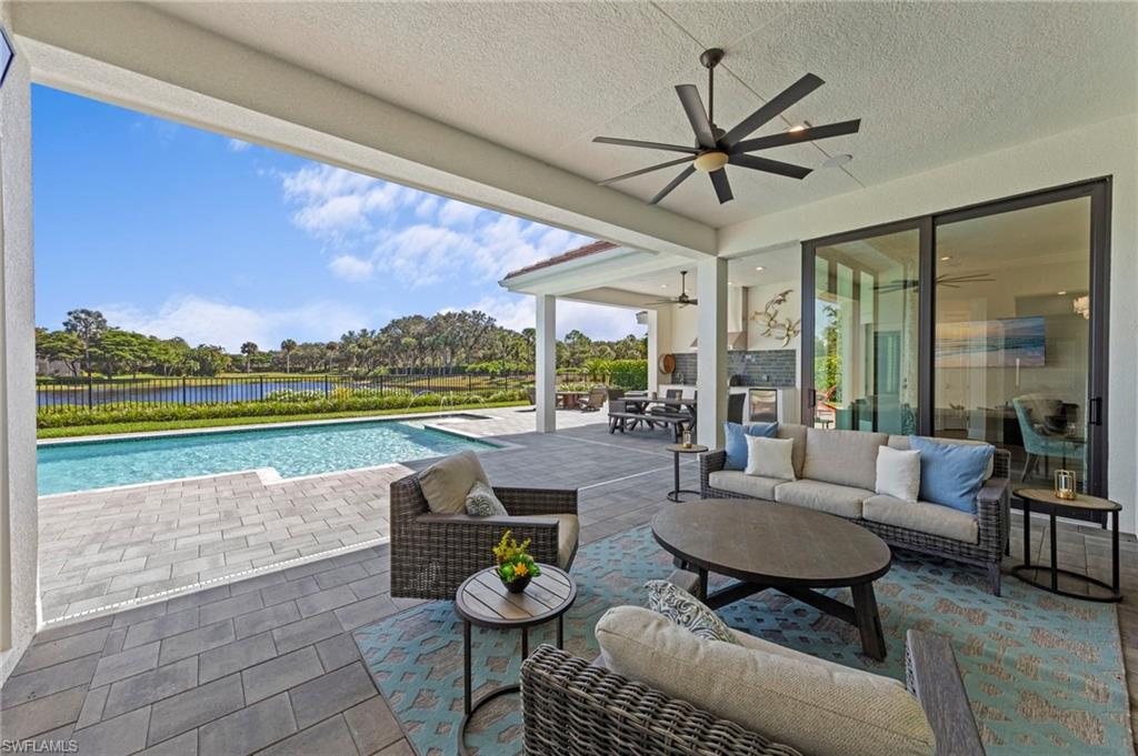 Immediate GOLF Membership NO WAIT LIST with this Arthur Rutenberg custom built home in the Twin Eagles Estate neighborhood, Lochlomond. Built in 2022 the home offers open space living, 3 bedrooms, 3 baths, bonus room, large office, hardwood and tile floors throughout. Two garages each for 2 cars, spacious lanai with an unobstructed lake view. Oversized lot makes you feel as if you are on your island. The outdoor kitchen with glass tile backsplash, granite countertops, beverage fridge and 36 - inch grill with hood perfect when dining out Features include trayed 14 ft.ceilings with crown molding, a full impact window and door package, interior sound proofing, a stone surround fireplace, three individually controlled SONOS zones in the great room, bonus room, and lanai, as well as surround sound in both the great room and bonus room. There is an extensive home automation system built around the app including monitored security system connected to fire and police.Motion sensors and pen/closed sensors on all windows and doors. Lutron switches throughout the home offering remote interior and exterior lighting control. Nest remote temperature control and monitoring. Remote access to garage(s) and rear entry using , wine enthusiasts will love the custom Euro Cave built in wine wall. A Generac generator. Many Many other upgrades and details. Truly a home designed for entertaining start creating memories. The Twin Eagles Clubhouse completed a full renovation in 2022, fitness center, bocce courts, tennis courts, tiki bar, card room and of course 4 new pickle ball courts. Twin Eagles offers 36 holes of Jack Nicholas Group and Steve Smyers courses and is also Audubon certified.
