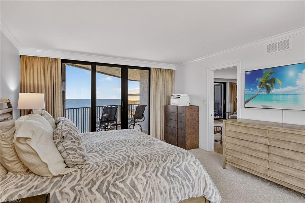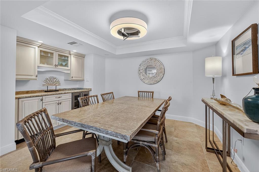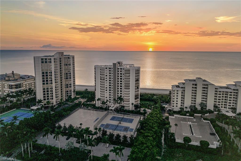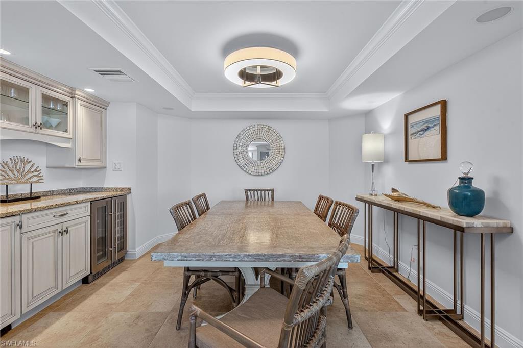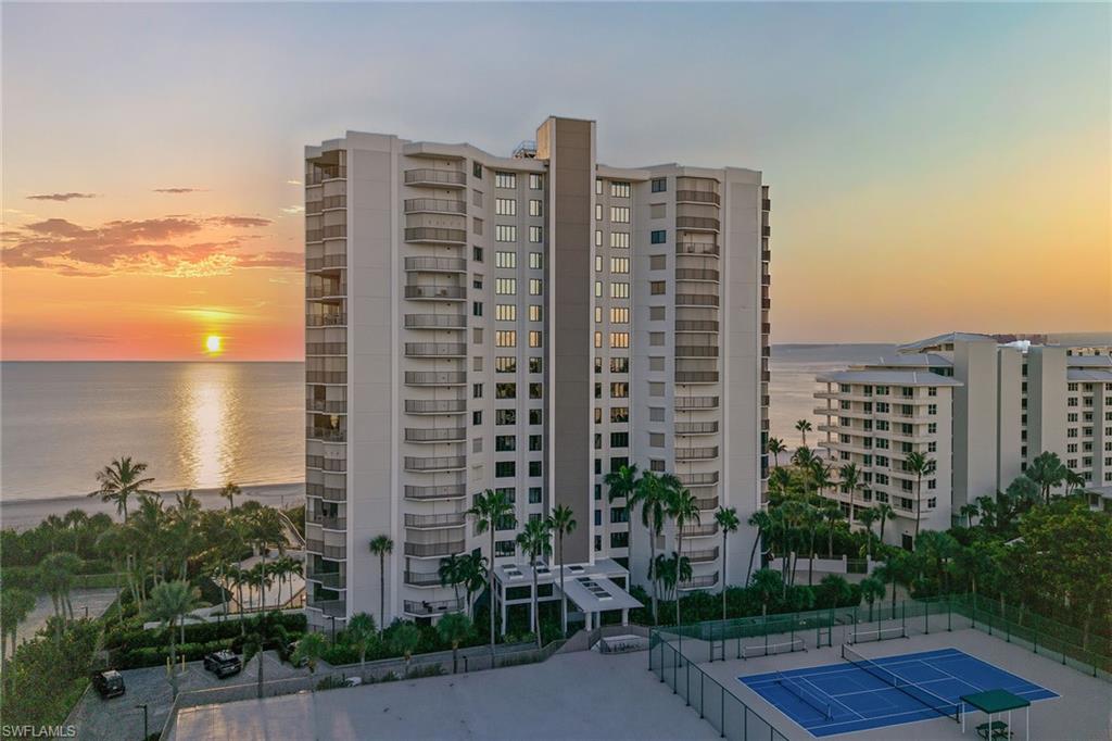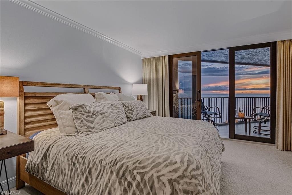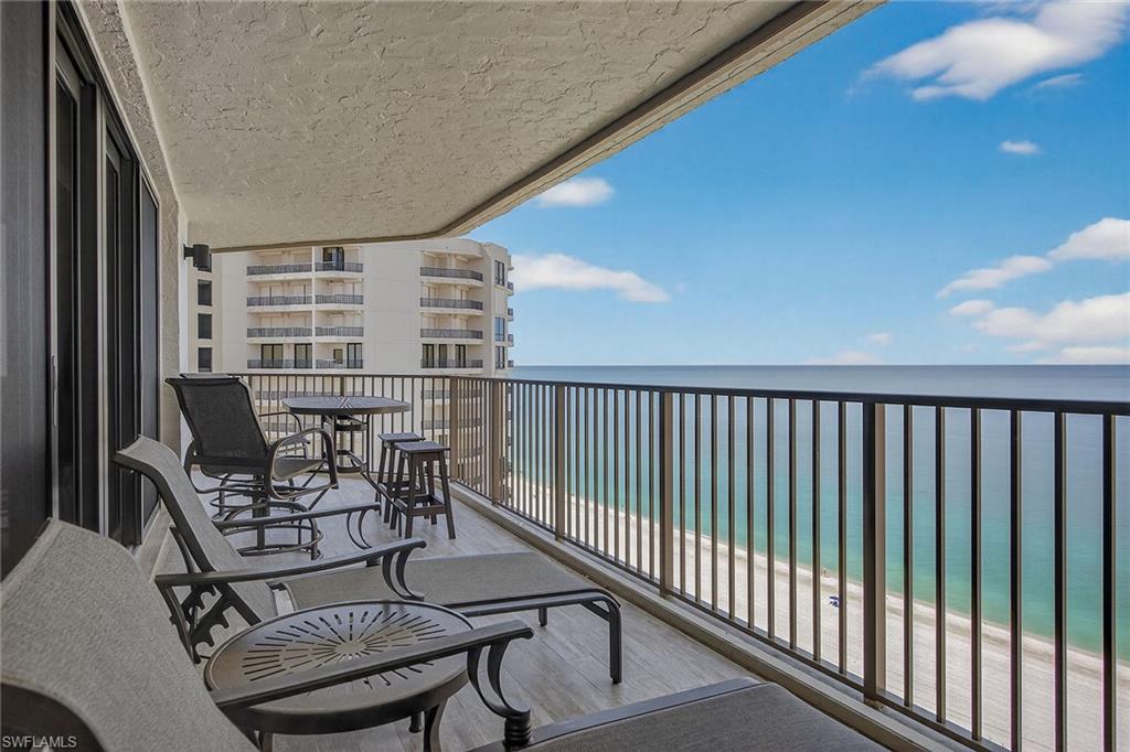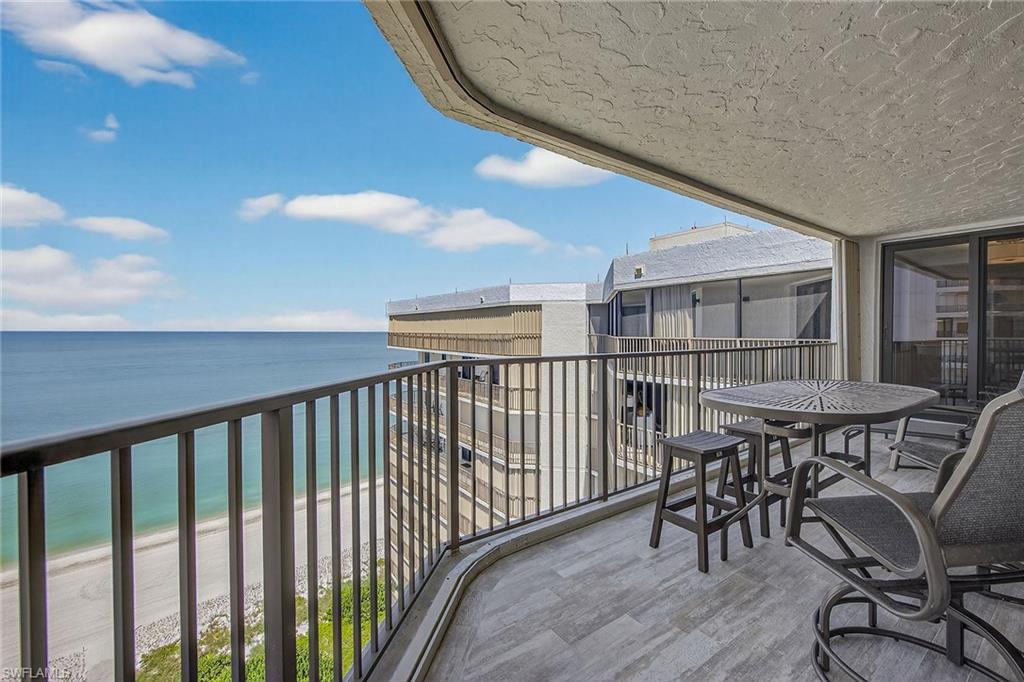 This luxurious high-rise residence offers an exceptional turnkey-furnished lifestyle with breathtaking Gulf views and refined finishes throughout. Designed for comfort and style, this exclusive top-floor condominium offers spacious three bedrooms, three baths and a covered garage space, creating a blend of convenience and coastal sophistication. Inside, light-filled living spaces are enhanced by tray ceilings, tile flooring, and impact-resistant doors and windows with additional manual shutters for peace of mind. The open kitchen is a chef’s delight, showcasing white cabinetry, recessed along with under- and in-cabinet lighting, a mosaic tile backsplash and GE Profile stainless appliances. A large center island with a four-seat breakfast bar invites casual dining, while sliders connect directly to the lanai for seamless indoor-outdoor living. A built-in dry bar featuring an under-counter wine cooler in the dining room adds the ideal touch for entertaining. The living room and primary suite open to the lanai, where sweeping Gulf waters provide a serene backdrop. The primary bedroom offers a walk-in closet, and a spa-like en-suite bath with dual vanities, a makeup counter and a frameless glass walk-in shower. Two guest bedrooms each feature walk-in closets, and access to full baths, one with an en-suite shower-tub combo and the other conveniently nearby. These guest bedrooms also open to separate balconies offering exquisite gulf and island views and beyond, toward Cape Romano. Additional highlights include a laundry room with a full-size washer and dryer and overhead cabinetry. Just minutes from Marco Island’s pristine beaches, upscale shopping, fine dining, golf courses, parks and cultural attractions, this residence provides the ultimate opportunity to embrace an active waterfront lifestyle. From kayaking and paddleboarding to tennis, pickleball or added fun on the beach, endless recreation awaits, all with the convenience of the executive airport nearby for effortless travel.