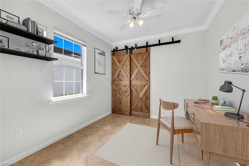 Welcome to your dream home in vibrant Estero, this property perfectly balances comfort and style within a gated community. The heart of this home features an upgraded kitchen and laundry room complemented by additional cabinetry over the washer and dryer providing ample storage space, boasting a separate freezer and all the latest high-end appliances, the layout offers privacy with separated bedrooms, including a primary suite with a spacious walk-in closet, and an additional closet in the den with a sliding barn door, ideal for a third bedroom. Step outside to the covered extended lanai that offers a beautifully renovated patio area, perfect for entertaining or relaxing by the fire pit under the stars. This home also showcases new paint, custom blinds, and stylish crown molding throughout, while practical additions include a widened driveway, storage racks in the garage and Storm Smart electric storm screens on the lanai provide convenience and peace of mind in addition to ***Impact windows***No CDD and ***No FLOOD Insurance required. Brimming with amenities enjoy a leisurely lifestyle with access to an amenities center, an Activities Director, fitness center, library, pickleball and tennis courts, bocce, and a community pool complete with a spa. For your furry friends, the community offers a dedicated dog park, ensuring everyone's needs are met. Just moments away, indulge in beaches, premier shopping at Miromar Outlets, and vibrant entertainment at Hertz Arena. With Gulf Coast Center, Coconut Point, and SWFL International Airport nearby, every convenience is at your fingertips. This property truly offers a slice of paradise—your perfect new home awaits!