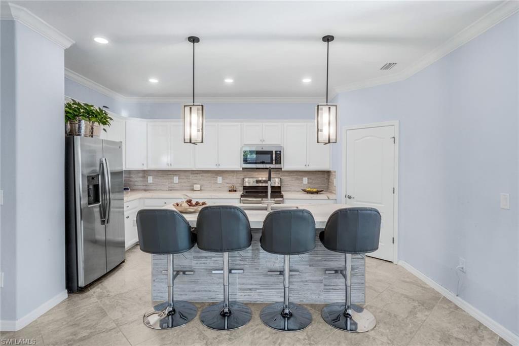 Welcome to Your Naples Oasis! This stunning 3-bedroom, 3-bathroom home with a 2-car garage and extended driveway offers the Naples lifestyle you’ve been dreaming of. Featuring soaring ceilings, an open floor plan, and a large lanai with a private pool, spa, and outdoor kitchen, this residence is perfect for both relaxation and entertaining. Inside, the sleek kitchen showcases white cabinetry, quartz countertops, a stylish backsplash, a massive island with seating for four, stainless steel appliances with hood, and a spacious walk-in pantry. The open kitchen, living, and dining areas flow seamlessly together under a detailed tray ceiling, with windows and sliders filling the home with natural light and views of the pool and lanai. The owner’s suite is bright and expansive, offering two custom walk-in closets, a linen closet, and a spa-like bath with dual vanities, soaking tub, and an oversized glass-enclosed shower. Step outside to your resort-style lanai, complete with a sparkling pool, spa, and fully equipped outdoor kitchen with grill and refrigerator—perfect for Florida living. Additional highlights include: • Impact-resistant windows and doors • Tile flooring throughout main living areas; carpet in bedrooms • Garage with built-in shelving Located in Bent Creek Preserve, residents enjoy a lakeside clubhouse with event space, billiards, fitness center, resort pool & spa, tennis, pickleball, bocce, basketball, playground, and a social calendar. Conveniently, the community also connects to Founders Square, a hub for premier dining and entertainment. This is more than a home—it’s a lifestyle! Comes with Home Warranty at closing.