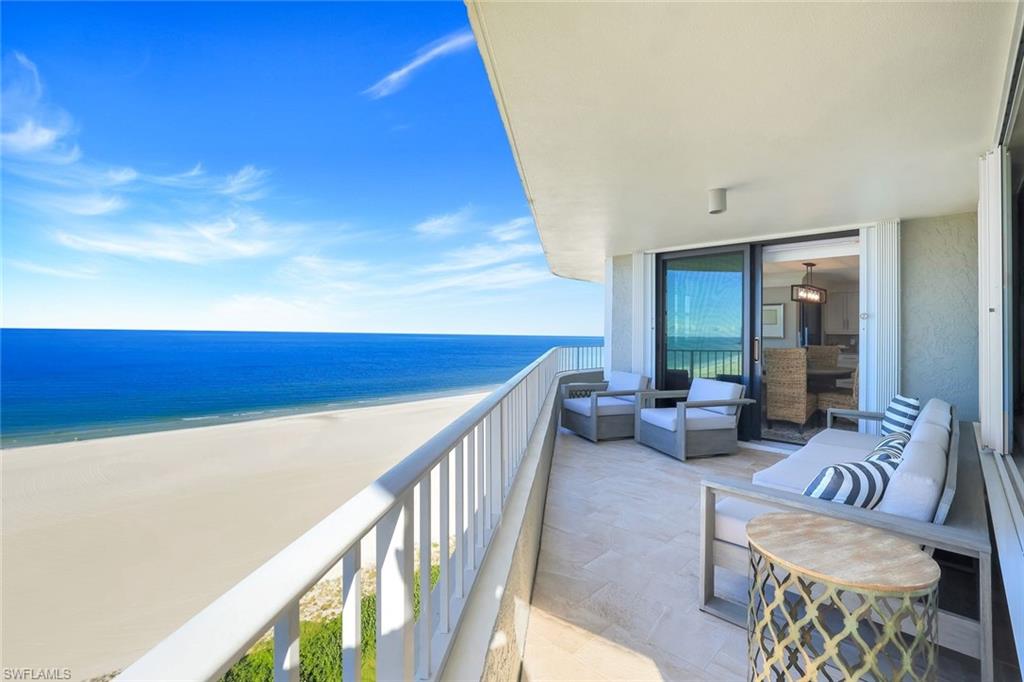 Experience luxurious beachfront living in this 3-bedroom, 3-bath residence at Summit House on Marco Island. This south-side, front-facing unit offers a wraparound balcony with breathtaking sunrise-to-sunset views of the Gulf of Mexico and beach. The open floor plan features a spacious kitchen with custom cabinetry, granite counters, and a built-in wet bar with wine cooler. The primary suite includes his-and-her closets with custom built-ins, a large bath with dual vanities, and walk-in shower. Two expansive guest suites each offer en suite baths and space for two queen beds. Additional highlights include impact windows and sliders, accordion shutters, tile flooring throughout, abundant storage with multiple closets, a walk-in storage room inside the unit, and a private storage area near the elevator. Summit House provides a private path to the beach and resort-style amenities including a pool, spa, fitness center, social room, bike storage, and grill area, plus plenty of covered parking for owners and guests.
