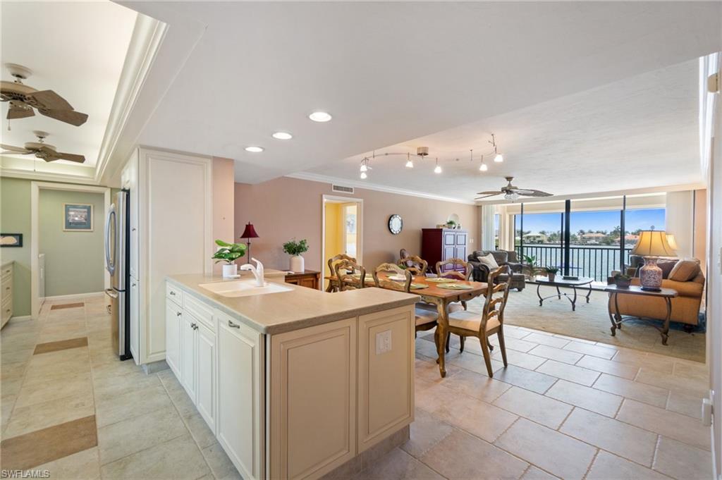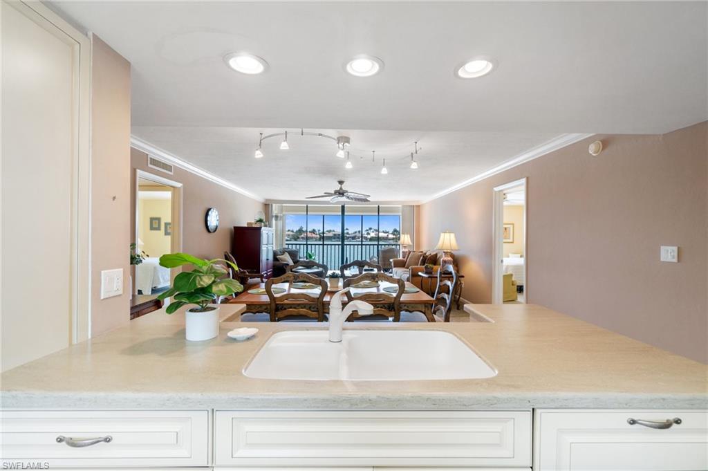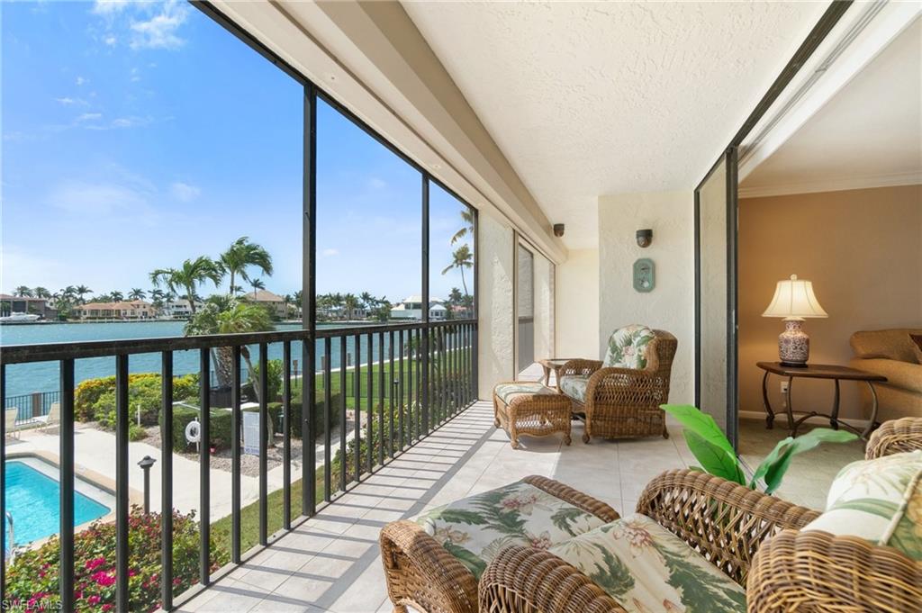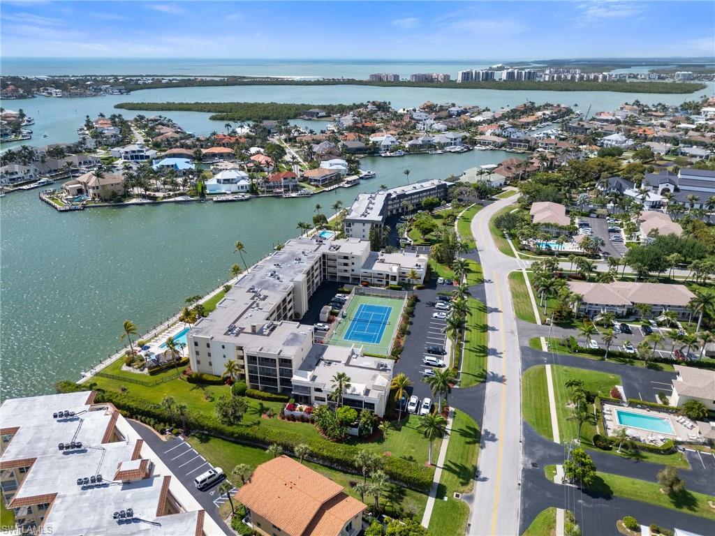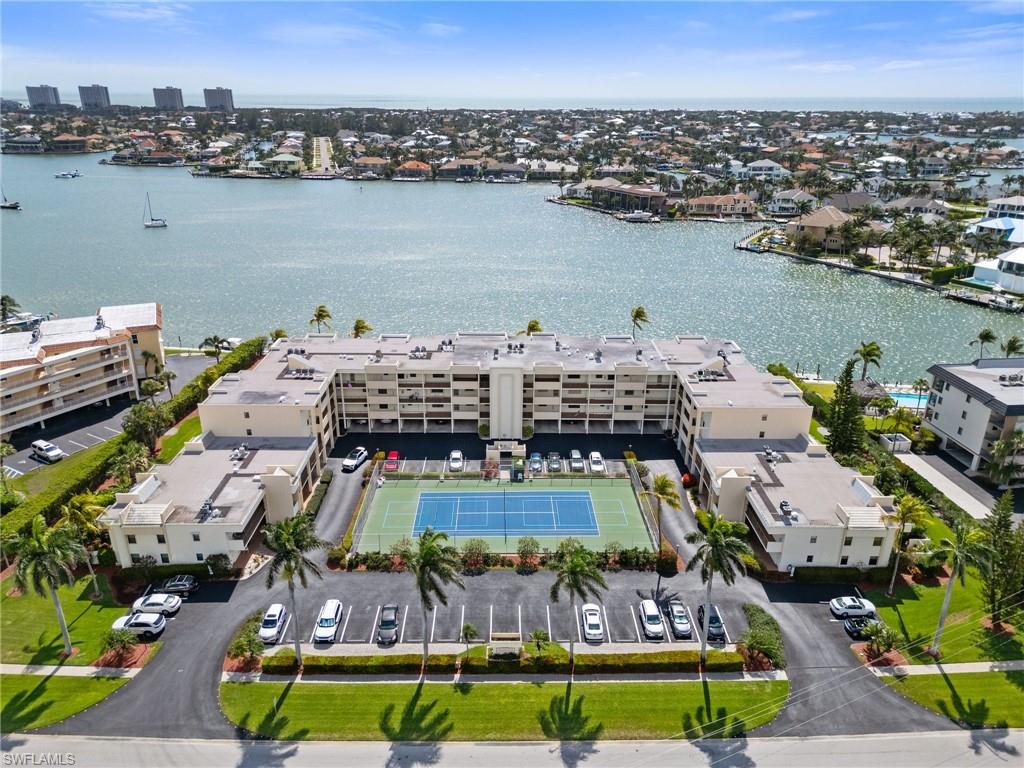 Welcome to Bayside Club on Marco Island, where waterfront elegance meets island tranquility. This beautifully updated 2 bedroom, 2.5 bathroom residence offers a seamless blend of comfort and luxury, complete with stunning views of Smokehouse Bay from every room. Watch dolphins play in the bay as you sip your morning coffee, and enjoy breathtaking western-exposure sunsets over the wide bay waters. The thoughtfully redesigned kitchen is a chef’s dream. From the custom cabinetry to the stylish stainless steel backsplash and appliances, this kitchen offers ample storage and counter space to delight every chef. The kitchen also features undercabinet lighting, a lighted tray ceiling, crown molding, and is adjacent to the laundry room offering even more storage. The large great room and dining area are perfect for entertaining or for quiet evenings watching the sunset. Two generous bedrooms, each with its own walk in closet and redesigned bath, offer plenty of space and privacy for visiting guests. There is also a convenient half bath off the foyer. A huge lanai, accessed from the living room and BOTH bedrooms is a wonderful place to sip iced tea and enjoy boats passing by. In addition to the many closets, there is walk in storage just outside the condo and another locked storage room on the ground floor, ensuring everything has its place. This home also has impact glass windows in the kitchen and bath and electric storm shutters on the lanai for peace of mind. Step outdoors to find your own slice of paradise—complete with a sparkling-heated pool and spa overlooking the bay, a Tiki Hut perfect for entertaining, and boat dockage for easy access to open water adventures in the Gulf. Whether you’re an avid boater, nature lover, or simply someone who appreciates the laid-back rhythm of island living, this home has something for everyone. Enjoy a morning of round of tennis or pickleball, then stroll to the nearby Esplanade Shoppes for world-class dining, boutique shopping, and waterfront cafes that add a lively flair to your relaxing days. This is more than a home—it's a lifestyle. Schedule your visit today and begin your island adventure tomorrow!