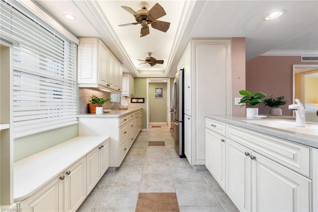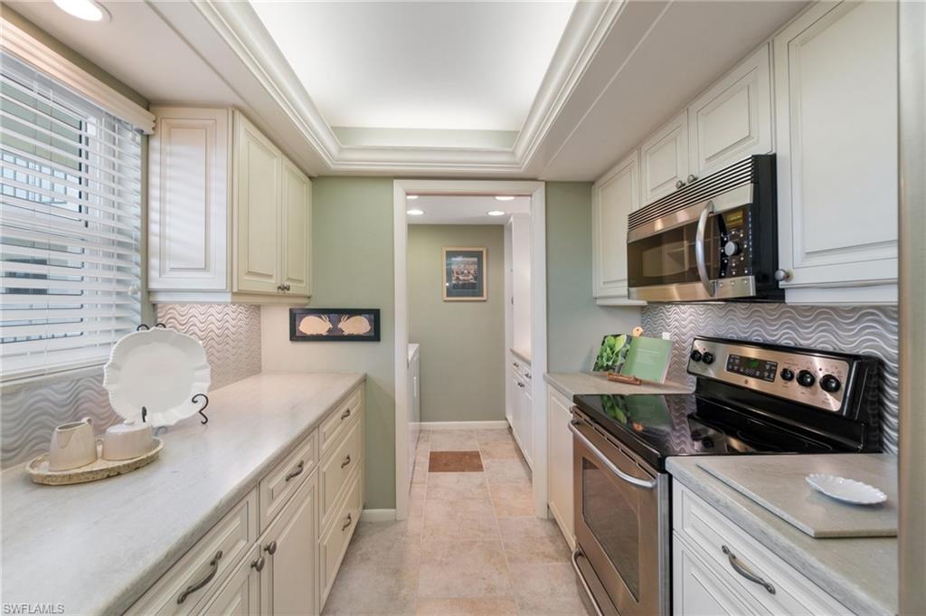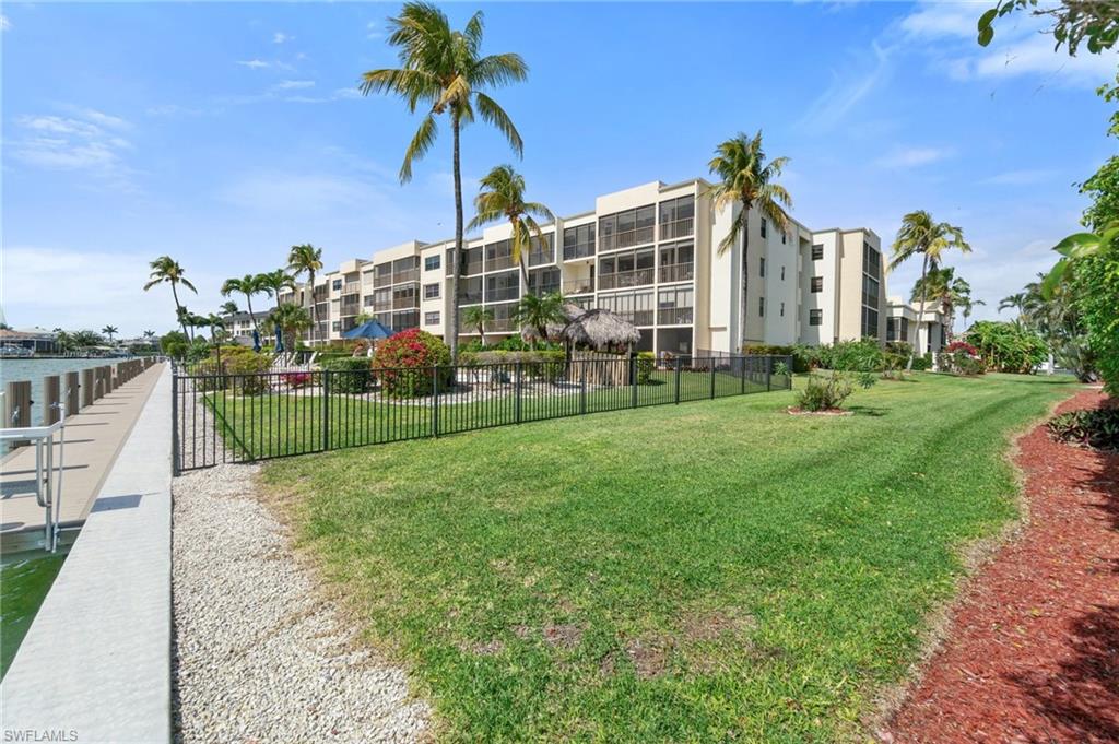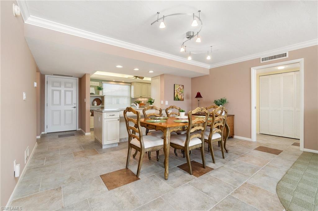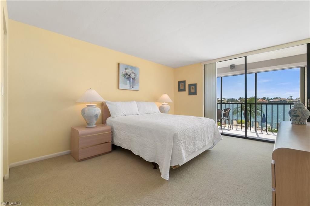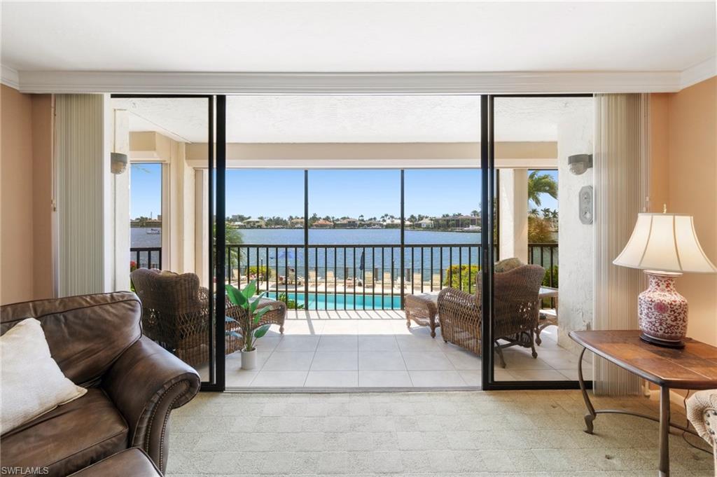Welcome to Bayside Club on Marco Island, where waterfront elegance meets island tranquility. This beautifully updated 2 bedroom, 2.5 bathroom residence offers a seamless blend of comfort and luxury, complete with stunning views of Smokehouse Bay from every room. Watch dolphins play in the bay as you sip your morning coffee, and enjoy breathtaking western-exposure sunsets over the wide bay waters. The thoughtfully redesigned kitchen is a chef’s dream. From the custom cabinetry to the stylish stainless steel backsplash and appliances, this kitchen offers ample storage and counter space to delight every chef. The kitchen also features undercabinet lighting, a lighted tray ceiling, crown molding, and is adjacent to the laundry room offering even more storage. The large great room and dining area are perfect for entertaining or for quiet evenings watching the sunset. Two generous bedrooms, each with its own walk in closet and redesigned bath, offer plenty of space and privacy for visiting guests. There is also a convenient half bath off the foyer. A huge lanai, accessed from the living room and BOTH bedrooms is a wonderful place to sip iced tea and enjoy boats passing by. In addition to the many closets, there is walk in storage just outside the condo and another locked storage room on the ground floor, ensuring everything has its place. This home also has impact glass windows in the kitchen and bath and electric storm shutters on the lanai for peace of mind. Step outdoors to find your own slice of paradise—complete with a sparkling-heated pool and spa overlooking the bay, a Tiki Hut perfect for entertaining, and boat dockage for easy access to open water adventures in the Gulf. Whether you’re an avid boater, nature lover, or simply someone who appreciates the laid-back rhythm of island living, this home has something for everyone. Enjoy a morning of round of tennis or pickleball, then stroll to the nearby Esplanade Shoppes for world-class dining, boutique shopping, and waterfront cafes that add a lively flair to your relaxing days. This is more than a home—it's a lifestyle. Schedule your visit today and begin your island adventure tomorrow!